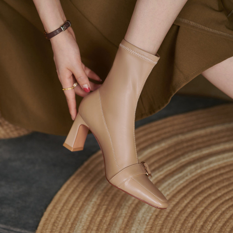 Нюдовые весенние короткие сапоги с заостренным носом, зимняя универсальная белая обувь, яркий броский стиль