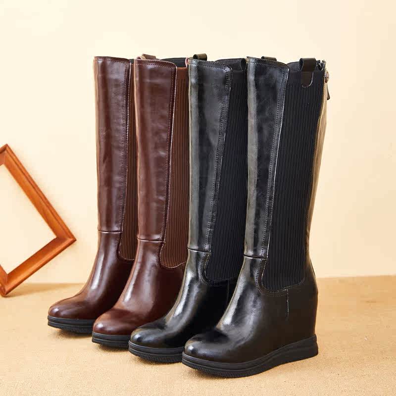 Демисезонные высокие эластичные черные высокие сапоги на платформе, ботинки, из натуральной кожи, 10см, по фигуре