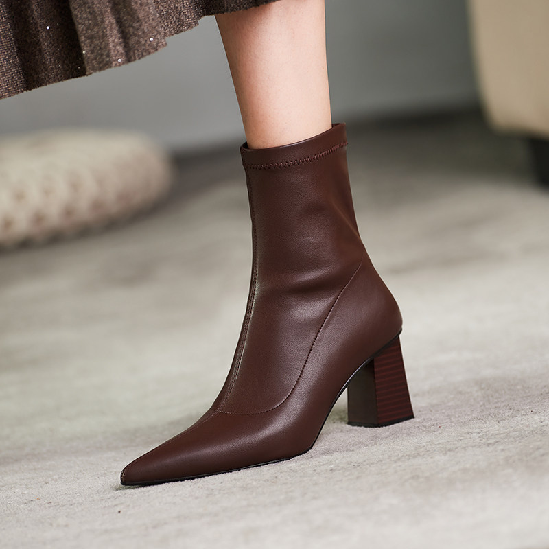 Коричневые сексуальные демисезонные эластичные короткие сапоги с заостренным носом на высоком каблуке