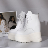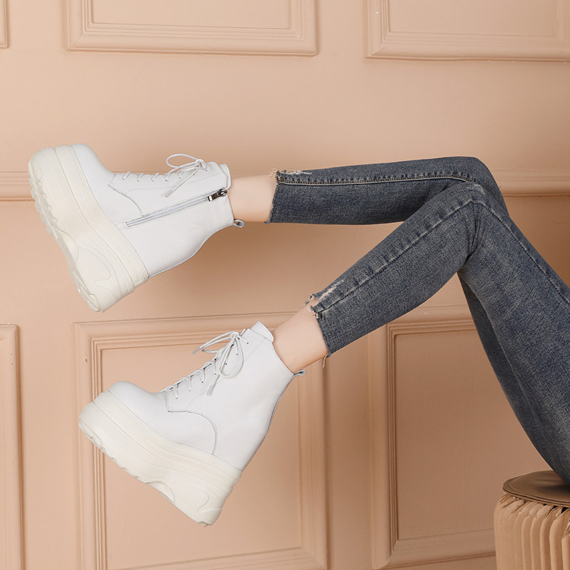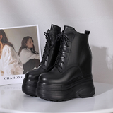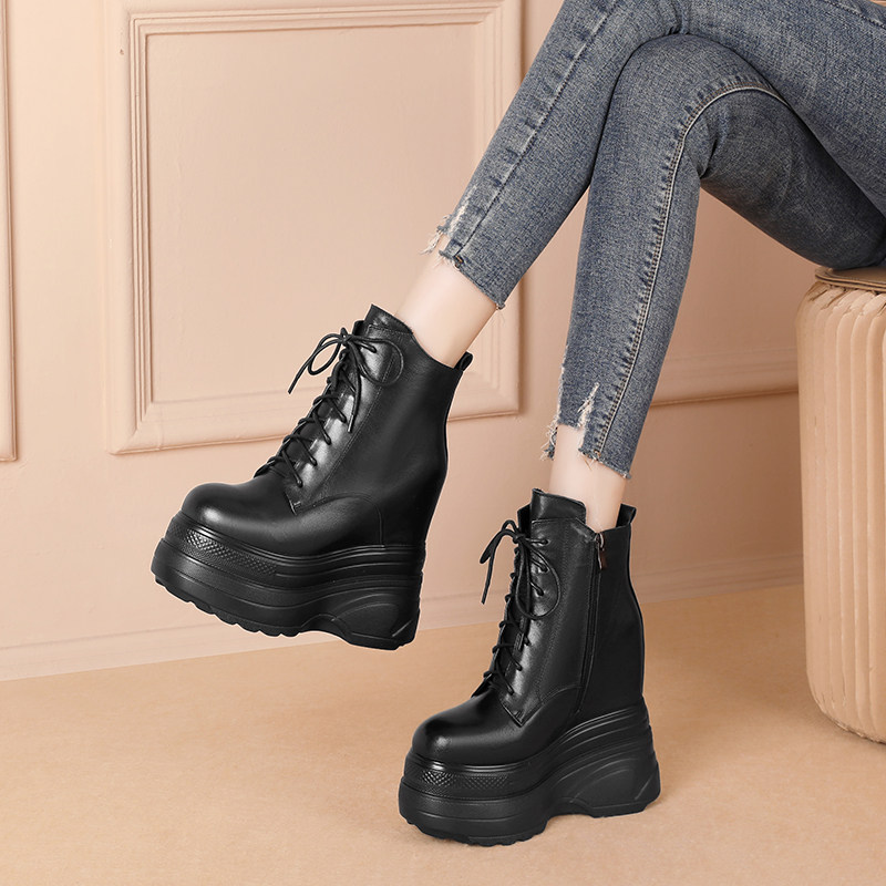 Высокие зимние утепленные ботинки на платформе, высокая модная обувь, черные короткие сапоги, 16см, из натуральной кожи, по фигуре