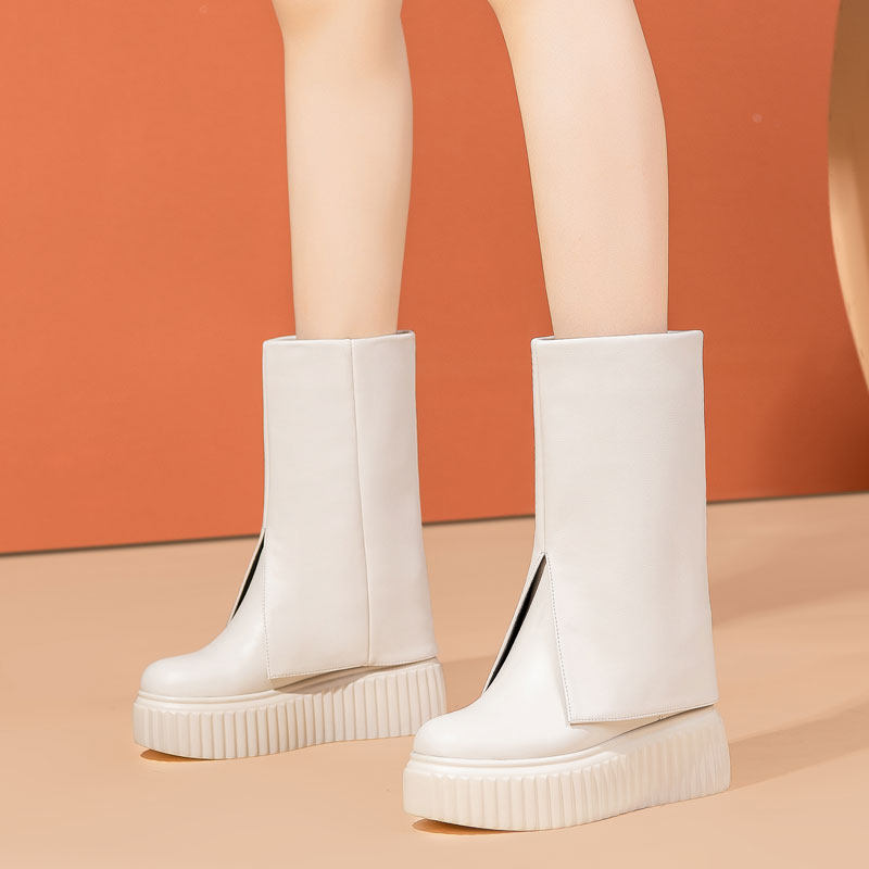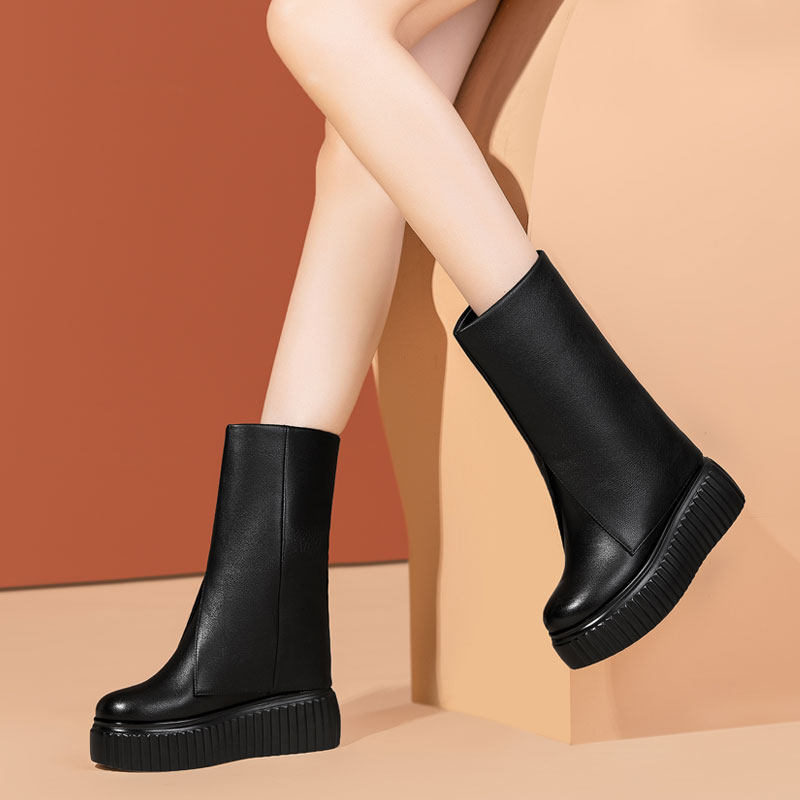 Универсальные осенние высокие штаны, черные модные сапоги на платформе, популярно в интернете, 10см, из натуральной кожи, средней длины