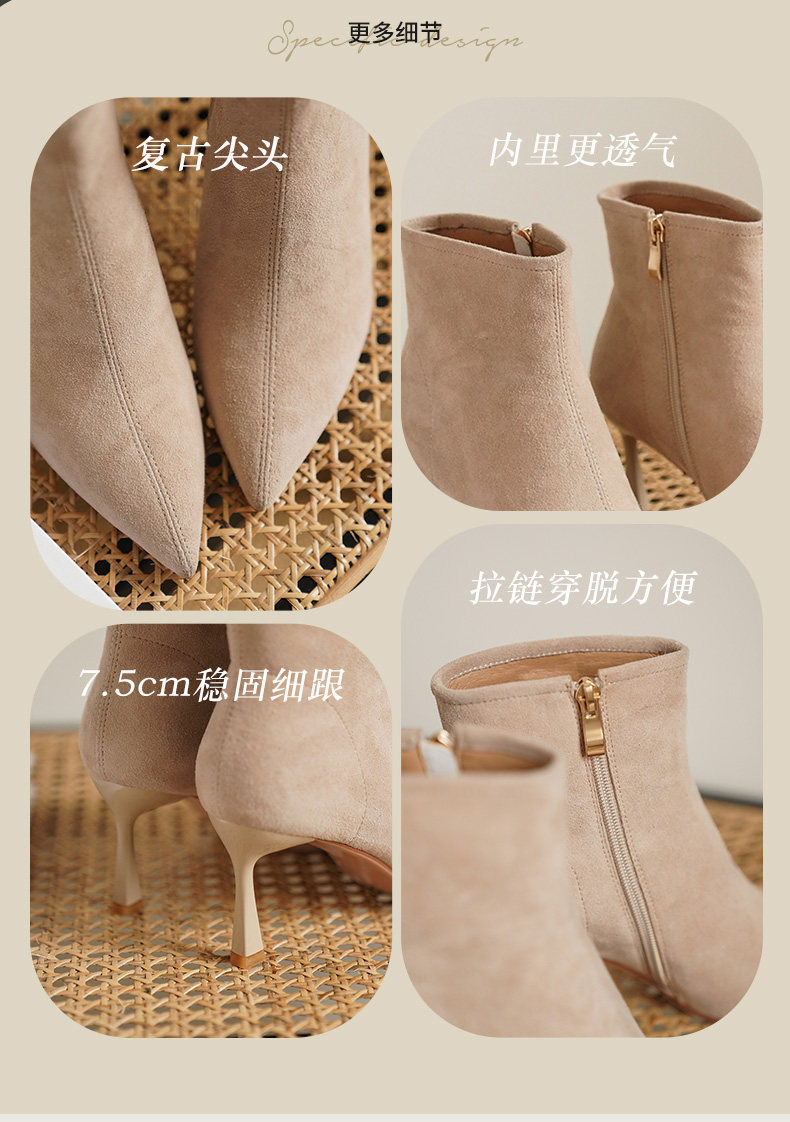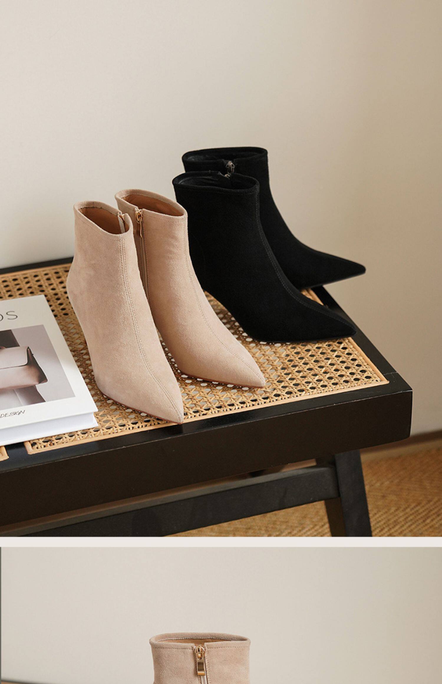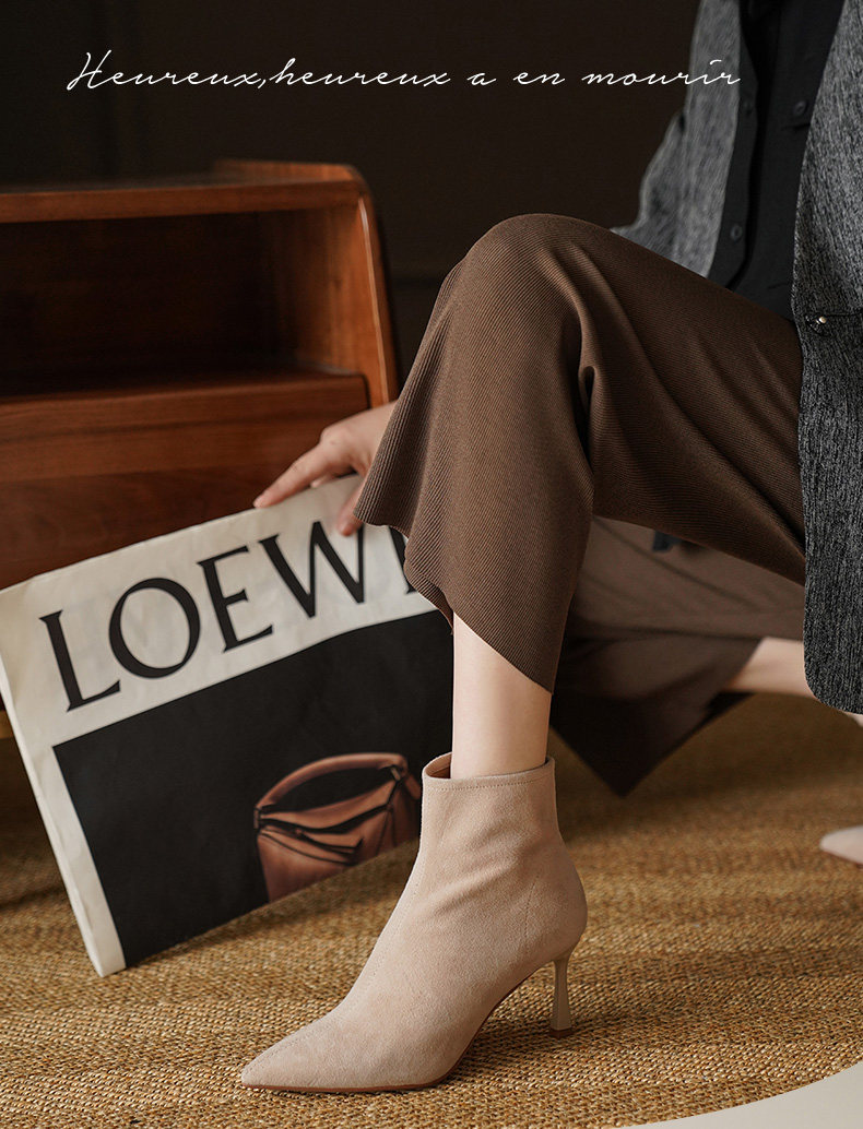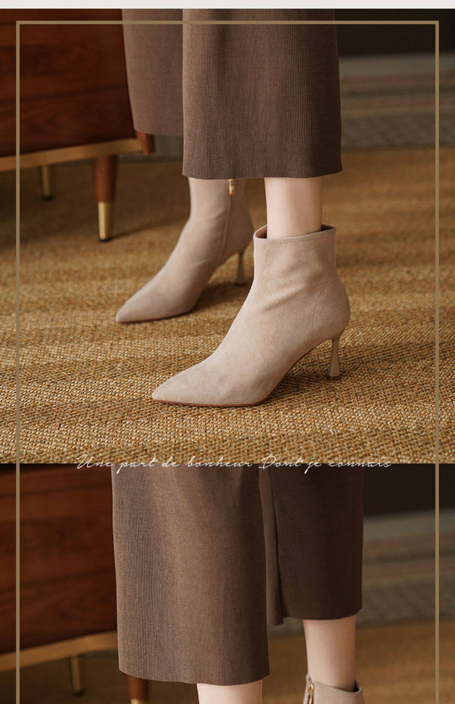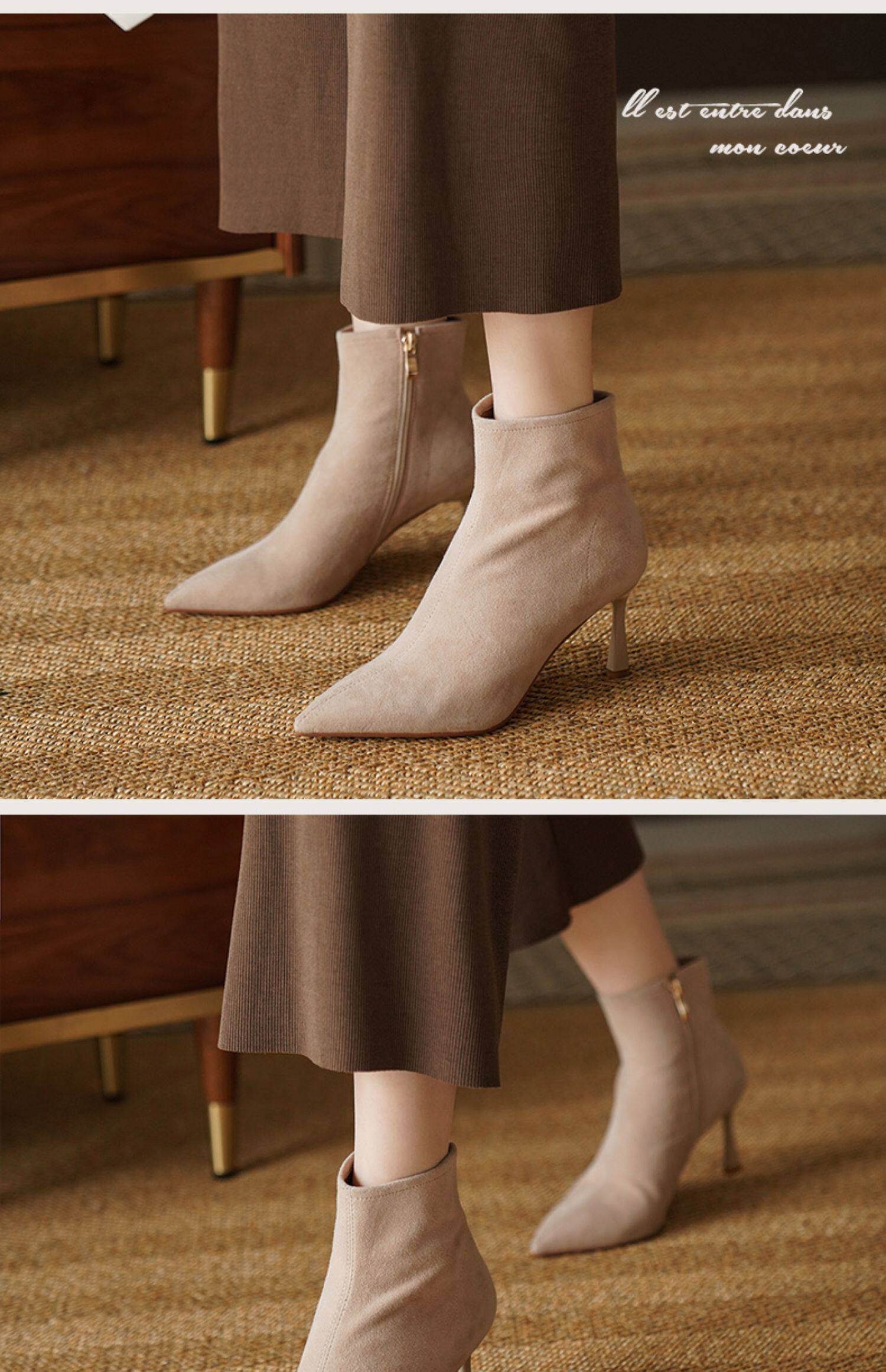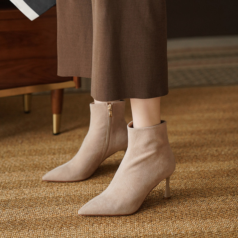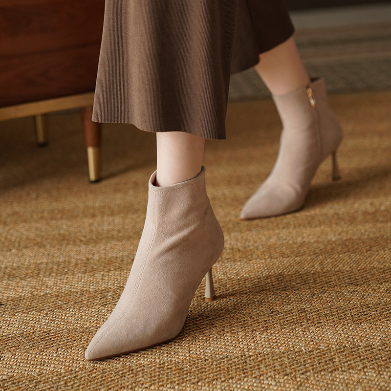 Нюдовые зимние короткие сапоги, матовые ботильоны с заостренным носом на высоком каблуке, светлые ботинки