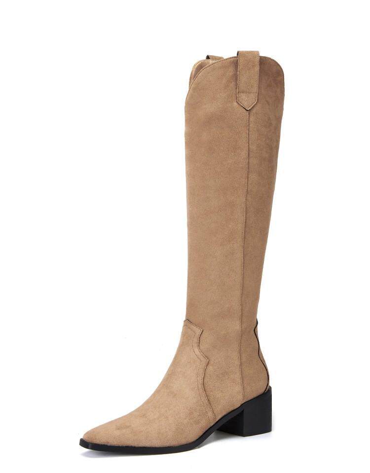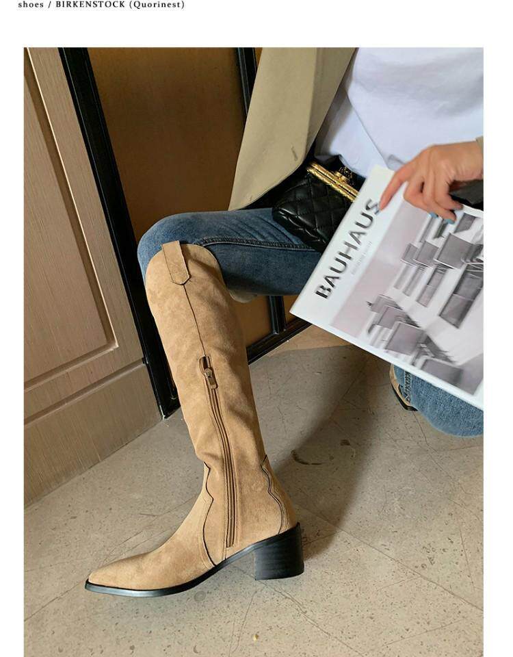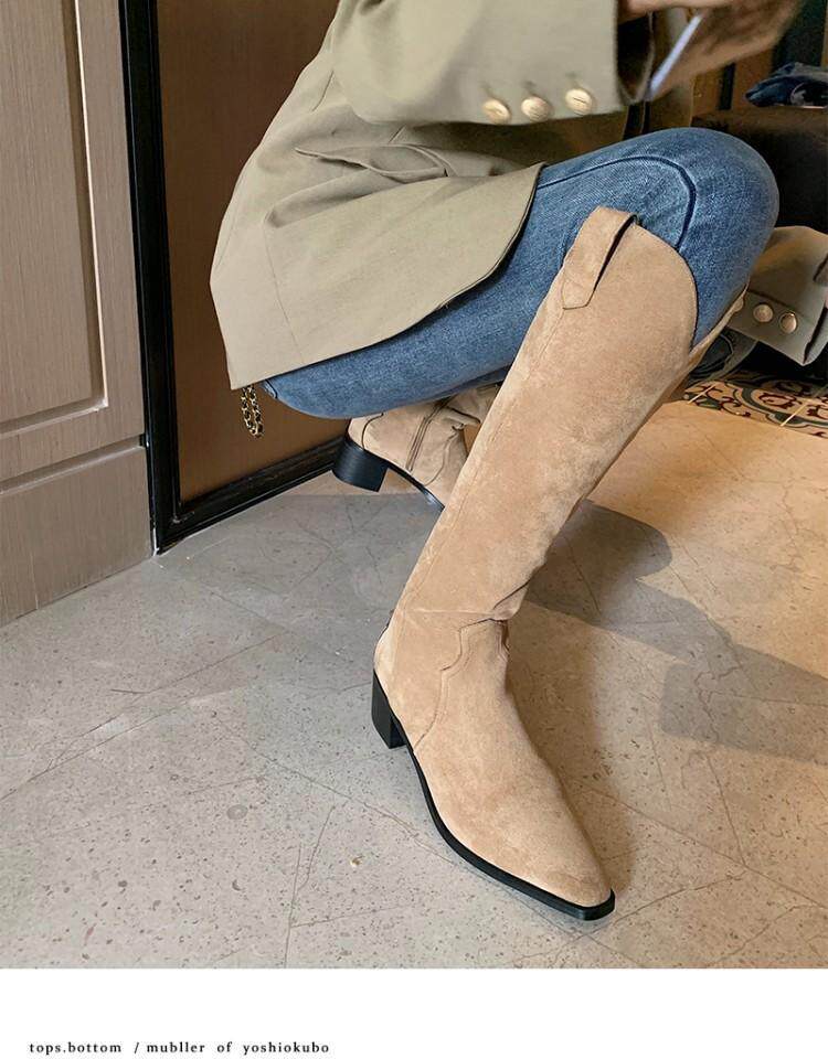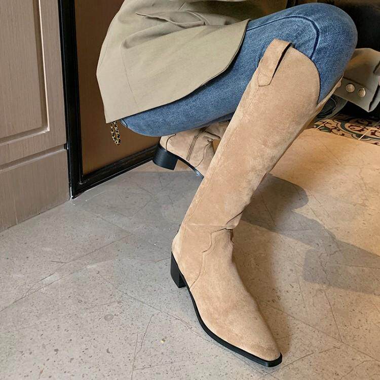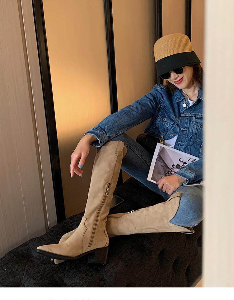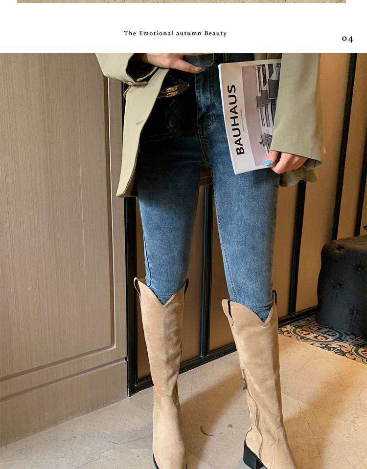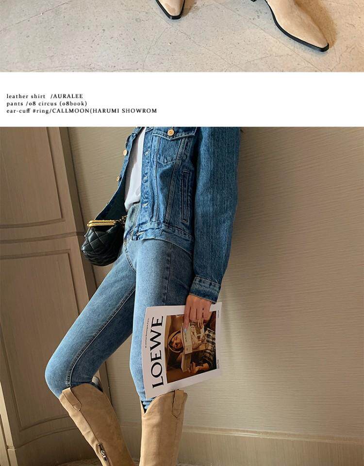 Джинсовые абрикосовые высокие сапоги с заостренным носом, высокие ботинки, по фигуре
