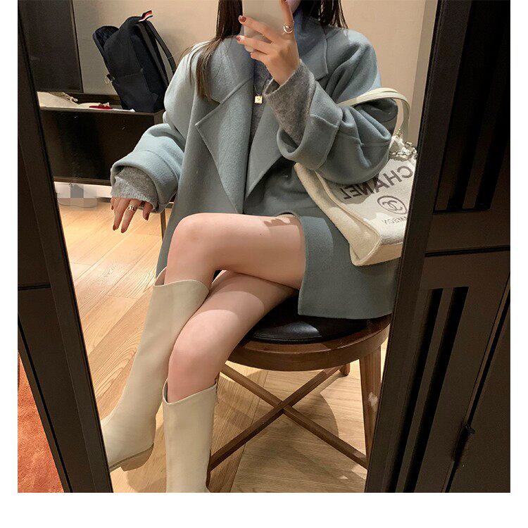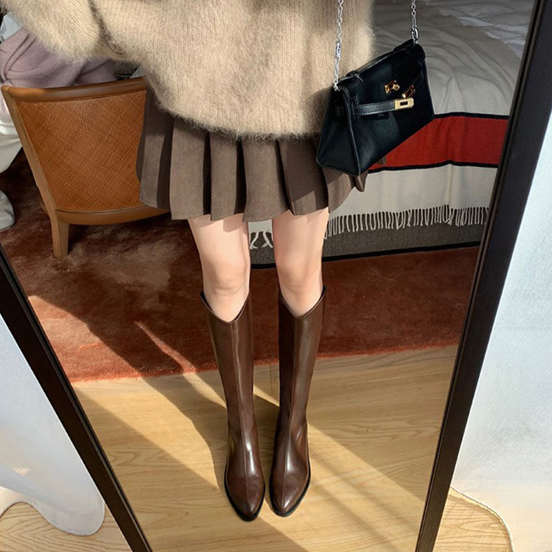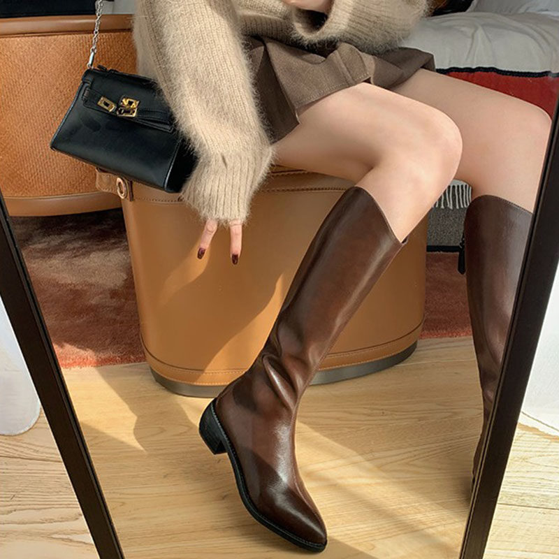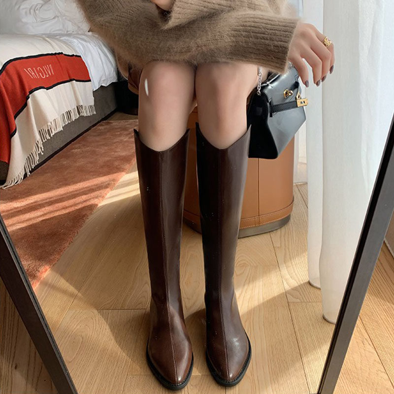 Коричневые джинсовые высокие сапоги с заостренным носом с молнией, подходит для подростков