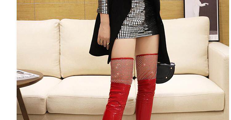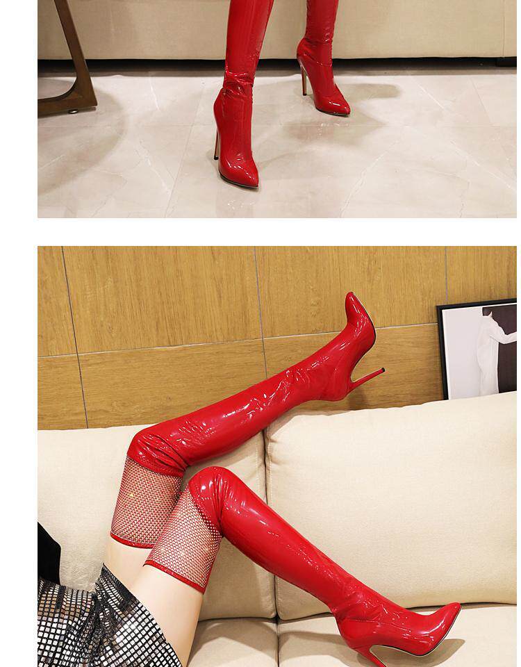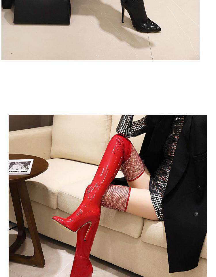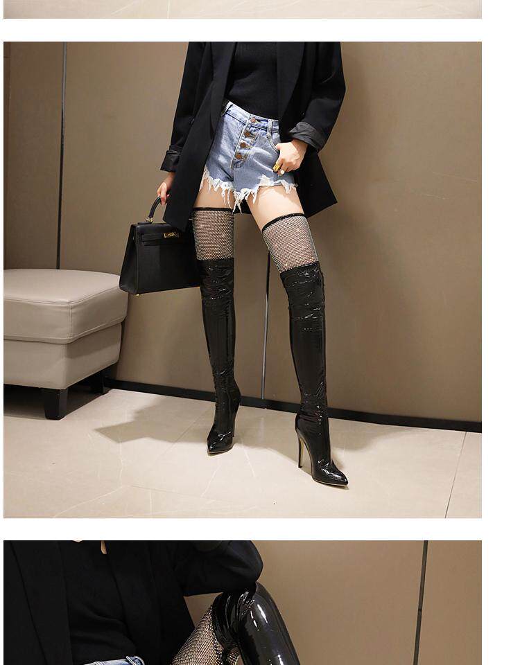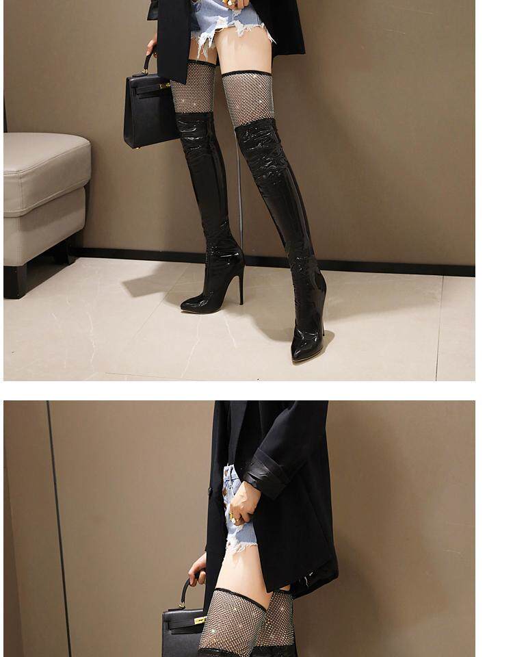Купить продукцию Европейские и американские узкие ботфорты, кружевные стразы, удлиненные красивые ноги, высокие каблуки, эластичные лаковые сапоги в стиле пэчворк, закрывающие ноги.