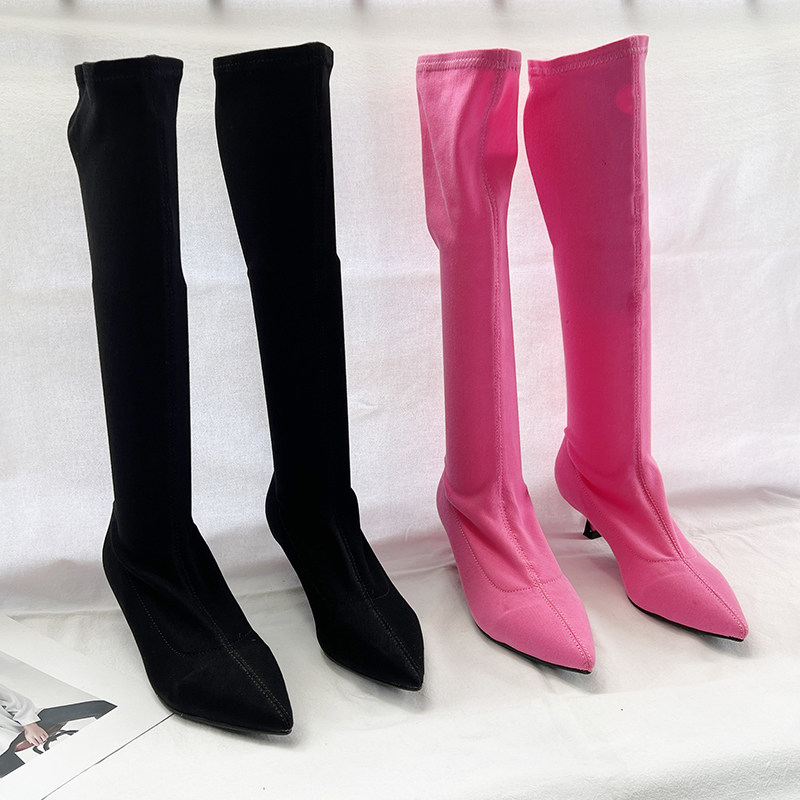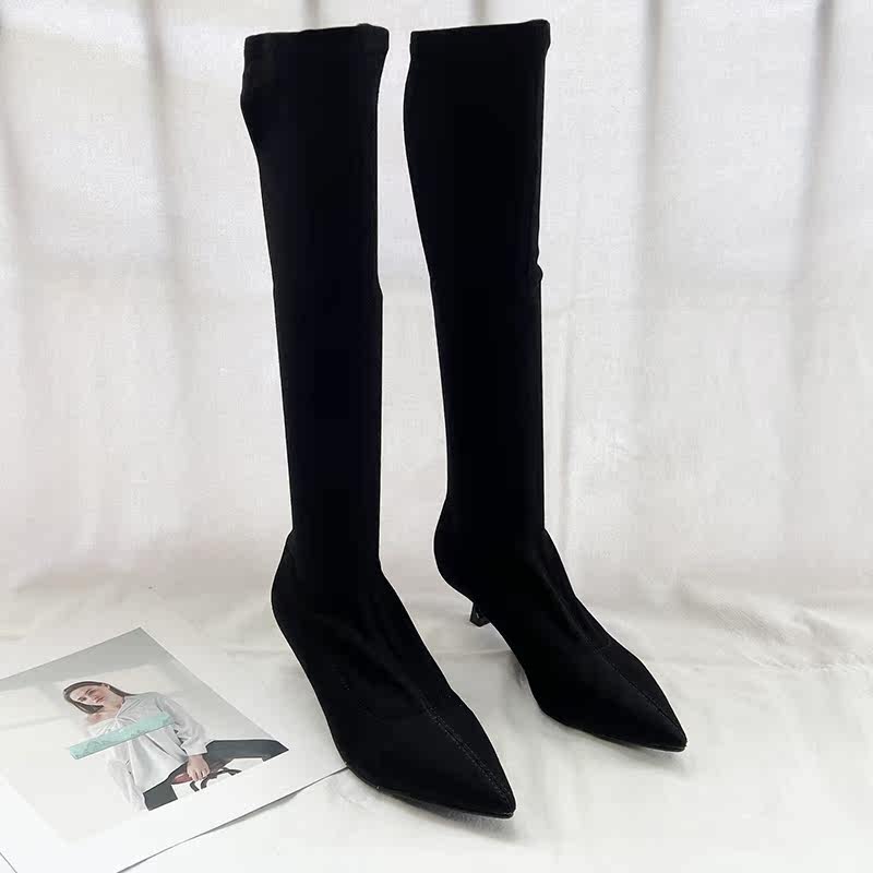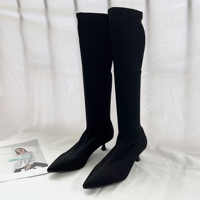 Тканевые эластичные высокие сапоги с заостренным носом, 2022, осенние, стройный силуэт