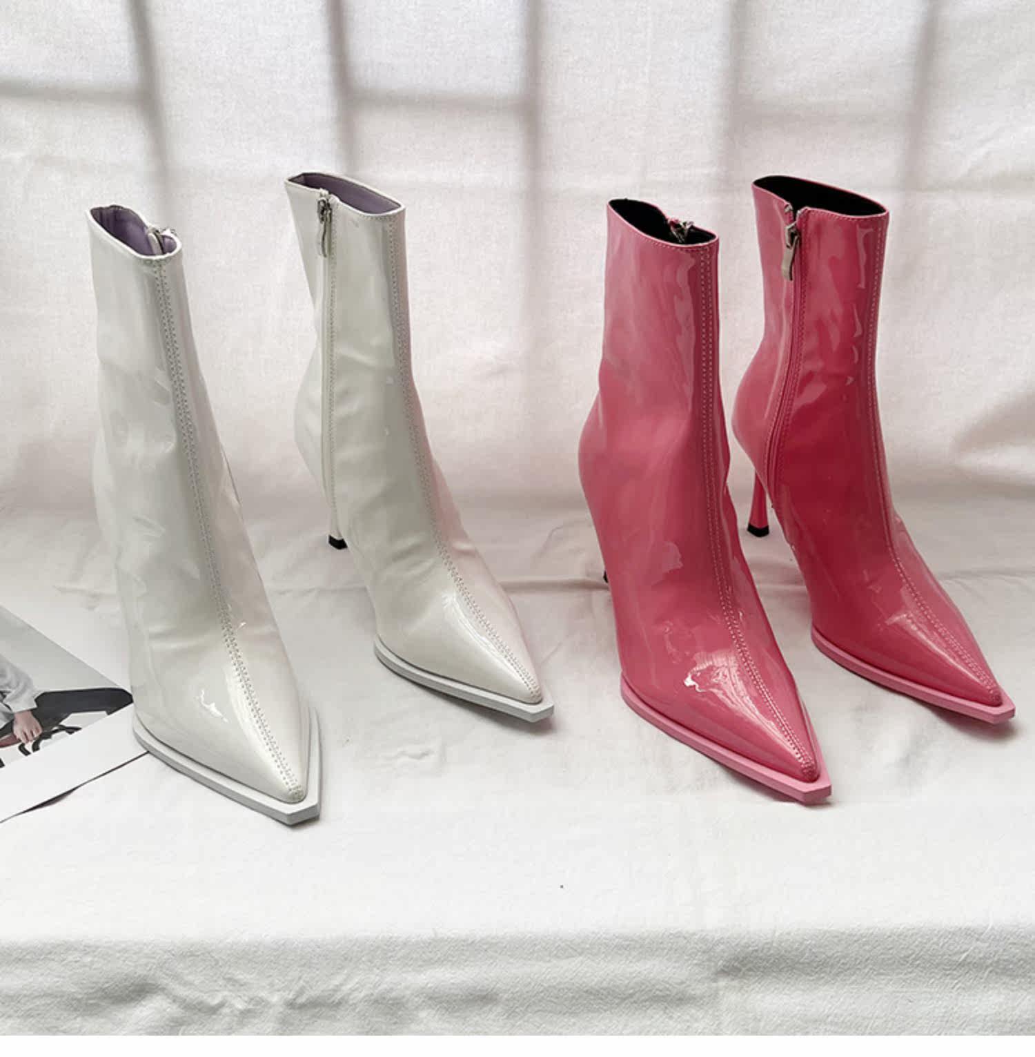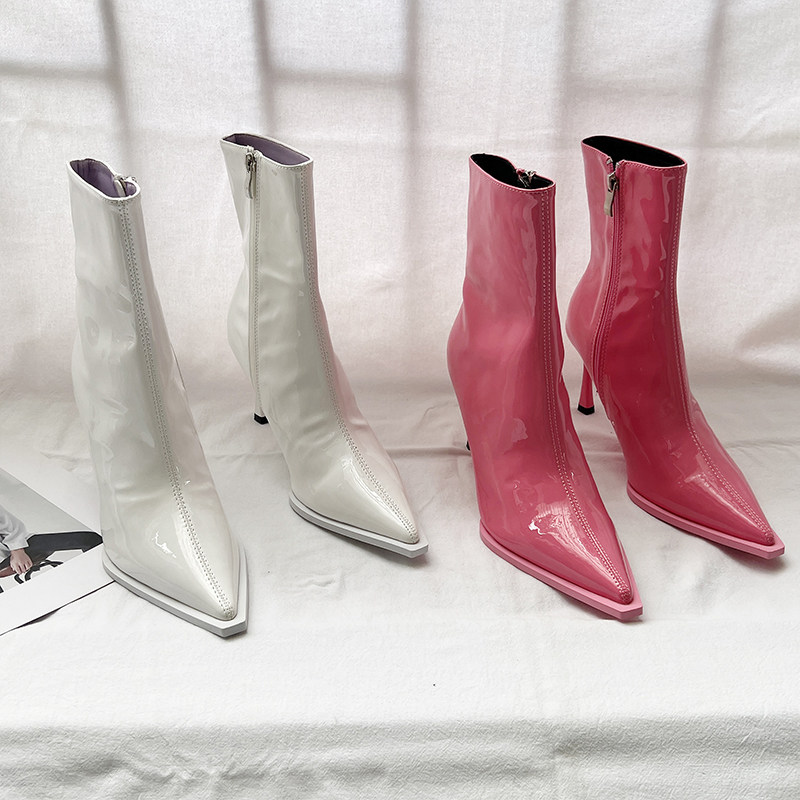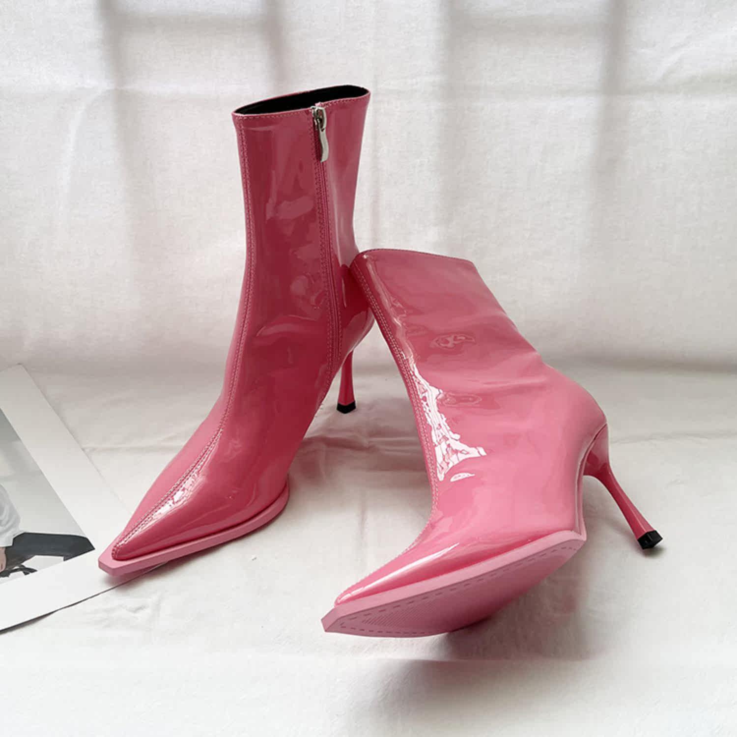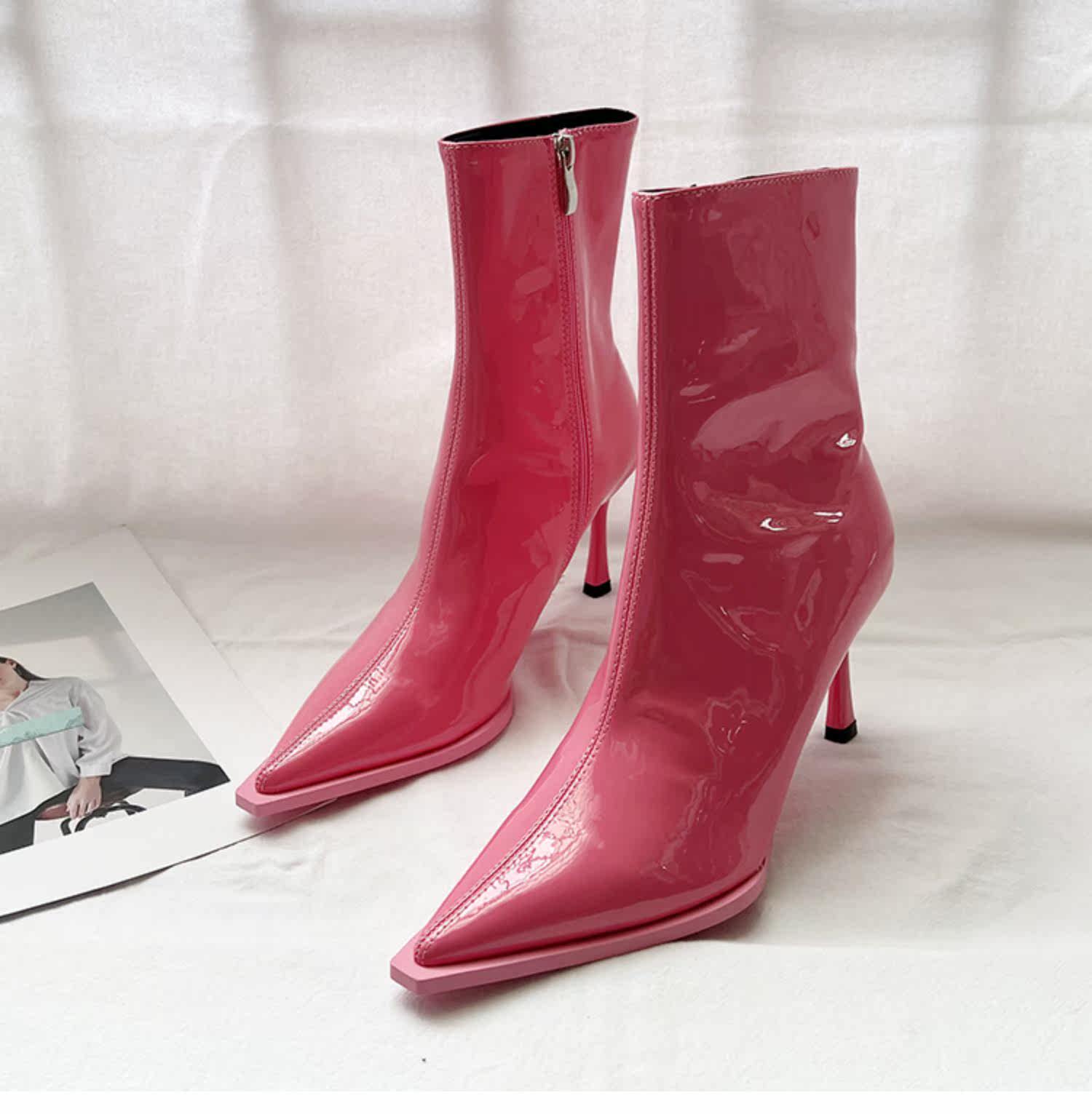 Розовые высокие короткие сапоги с заостренным носом с молнией, европейский стиль, по фигуре, коллекция 2022, осенние, популярно в интернете