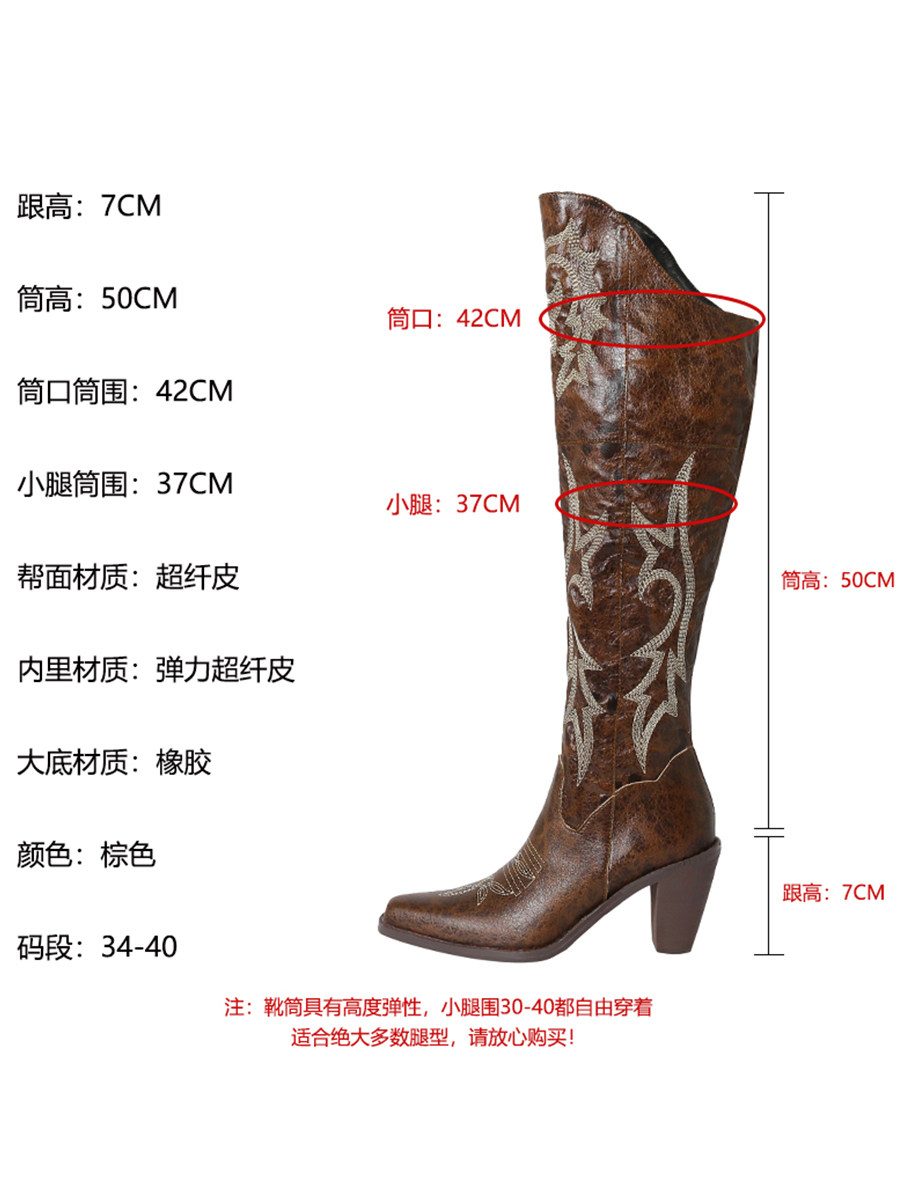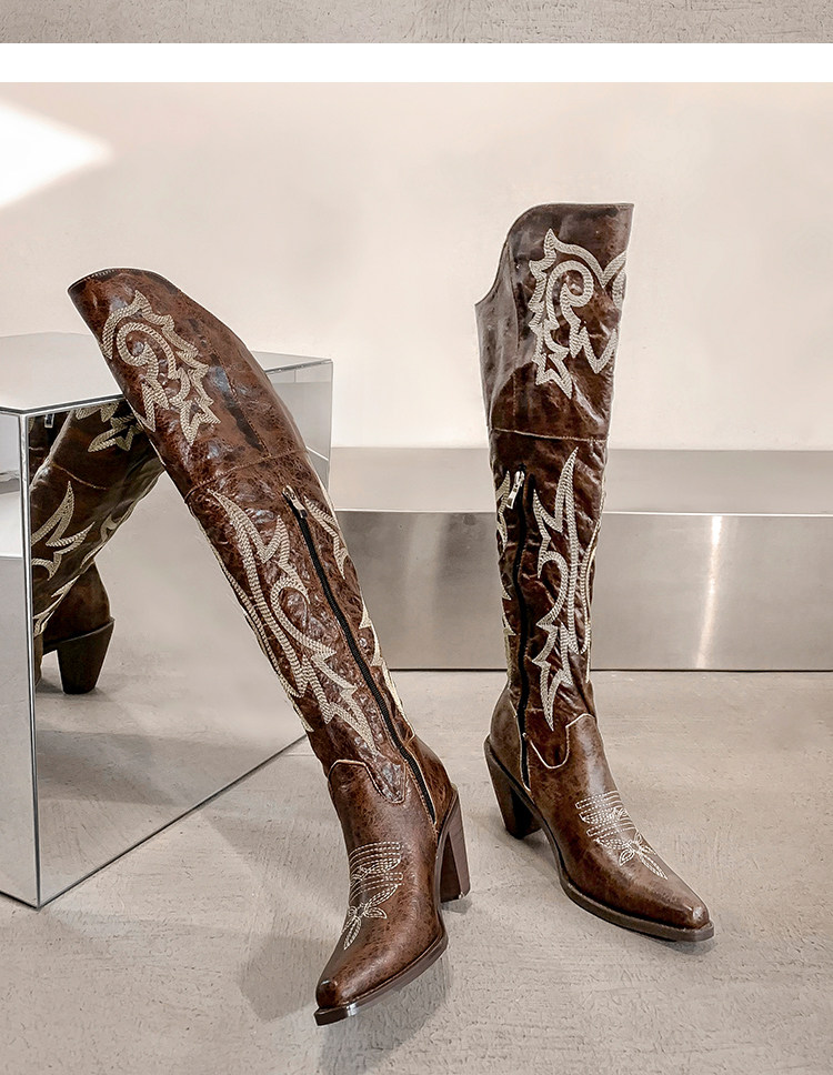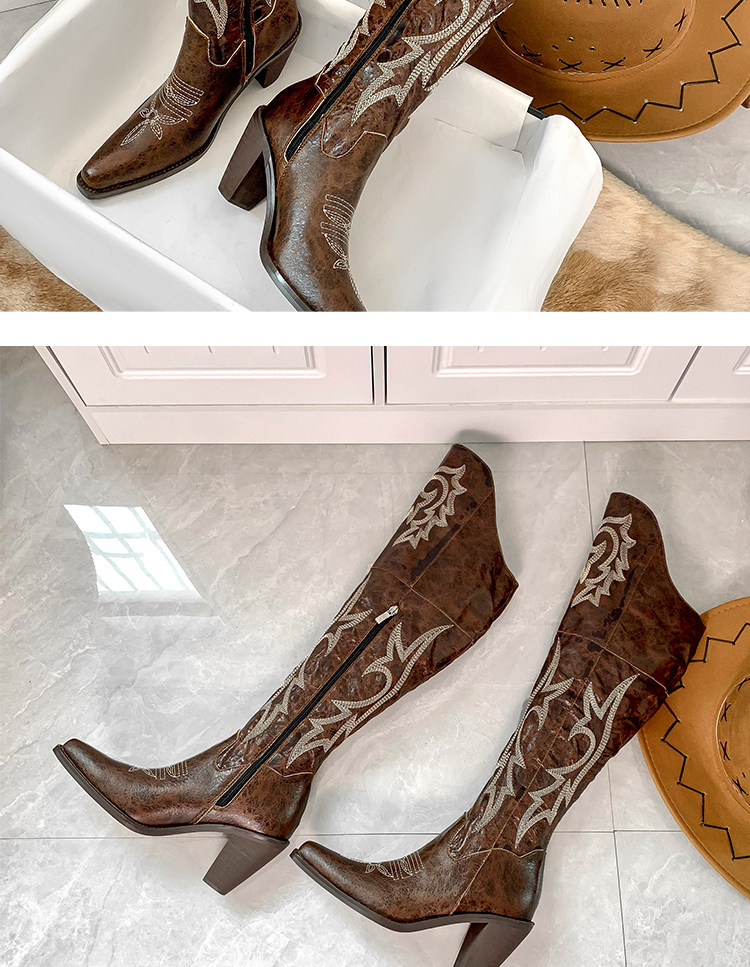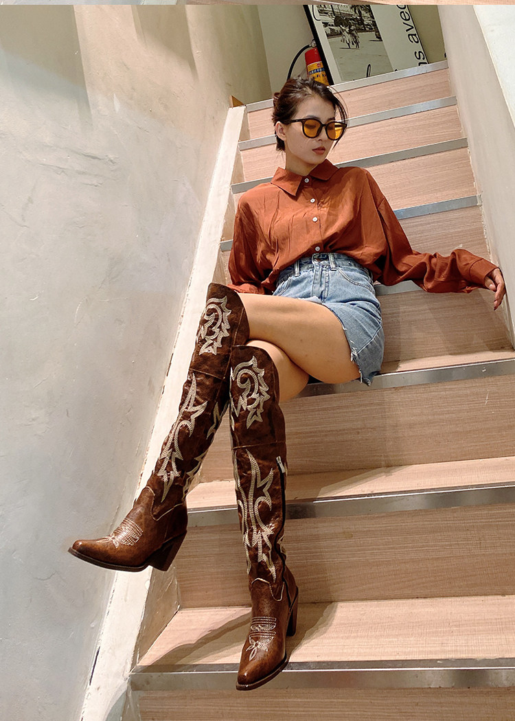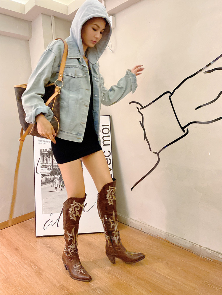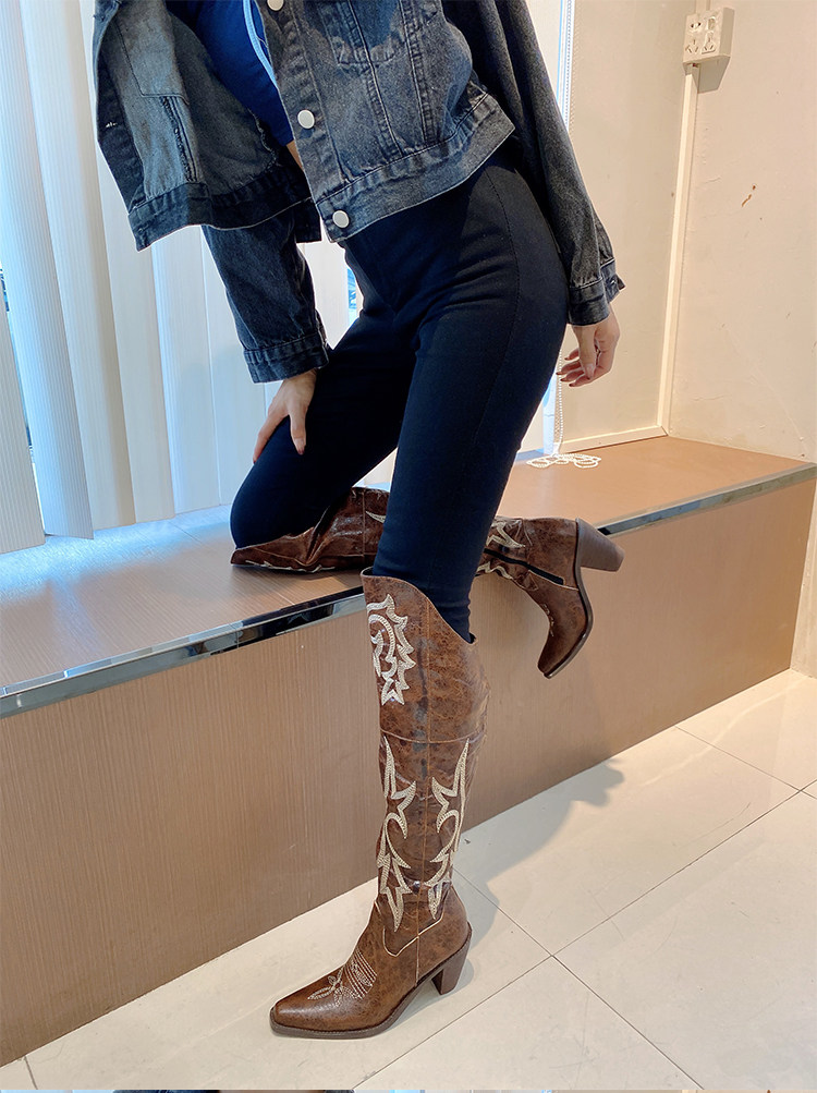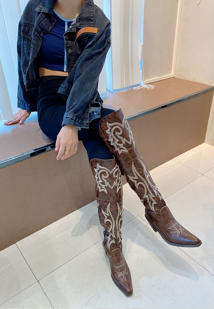 Демисезонные джинсовые высокие коричневые сапоги с заостренным носом