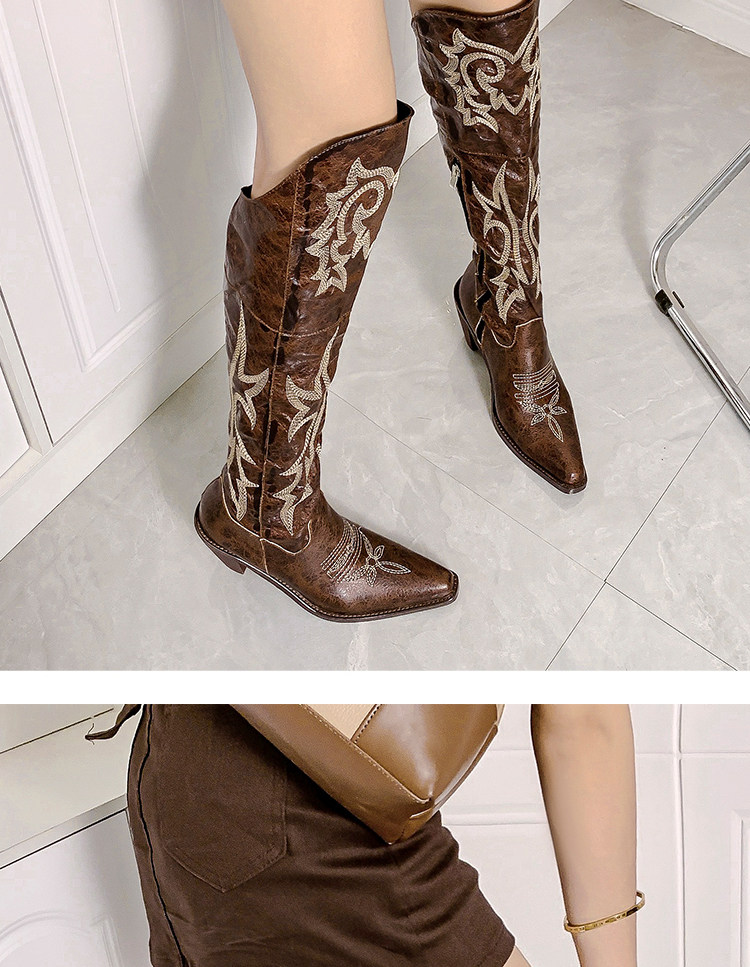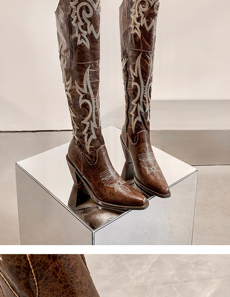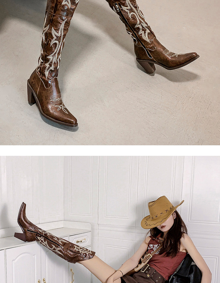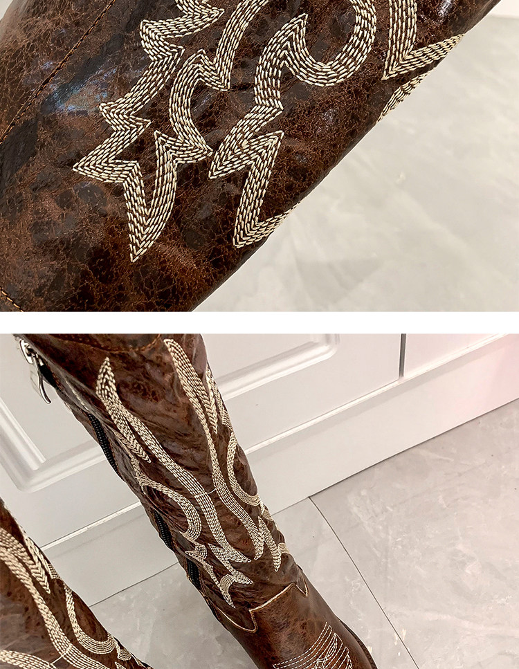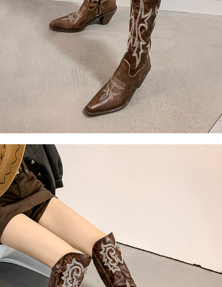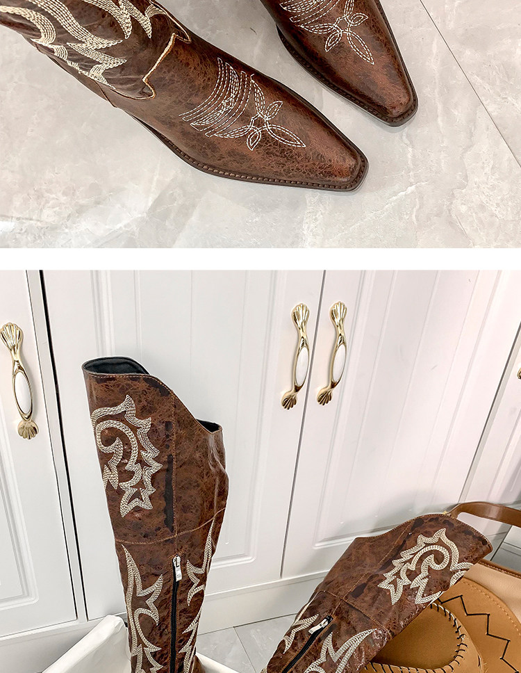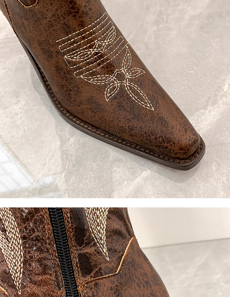 Демисезонные джинсовые высокие коричневые сапоги с заостренным носом