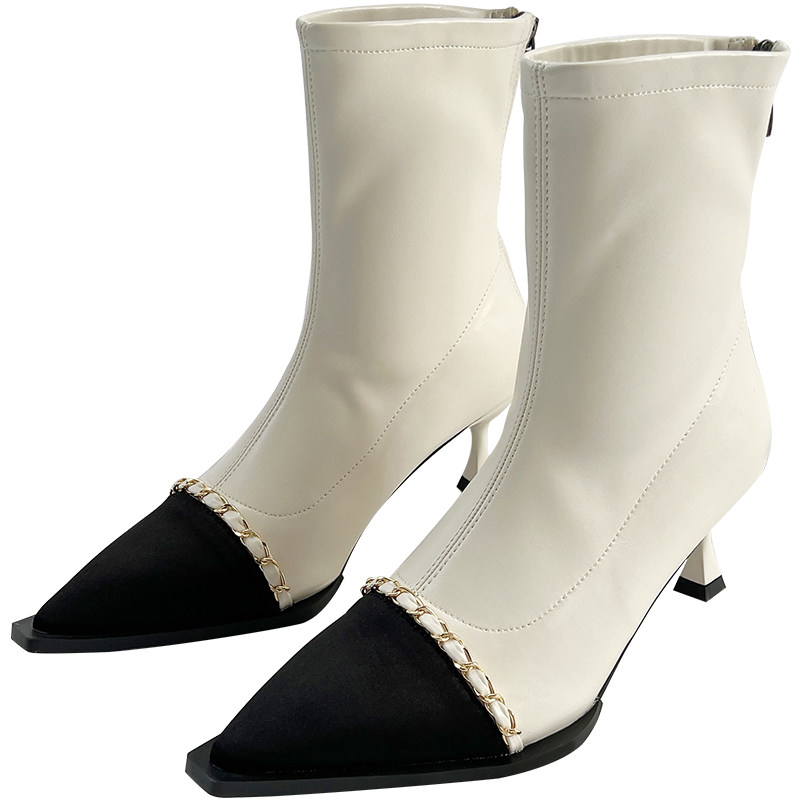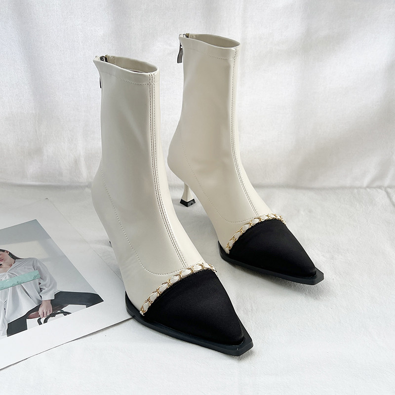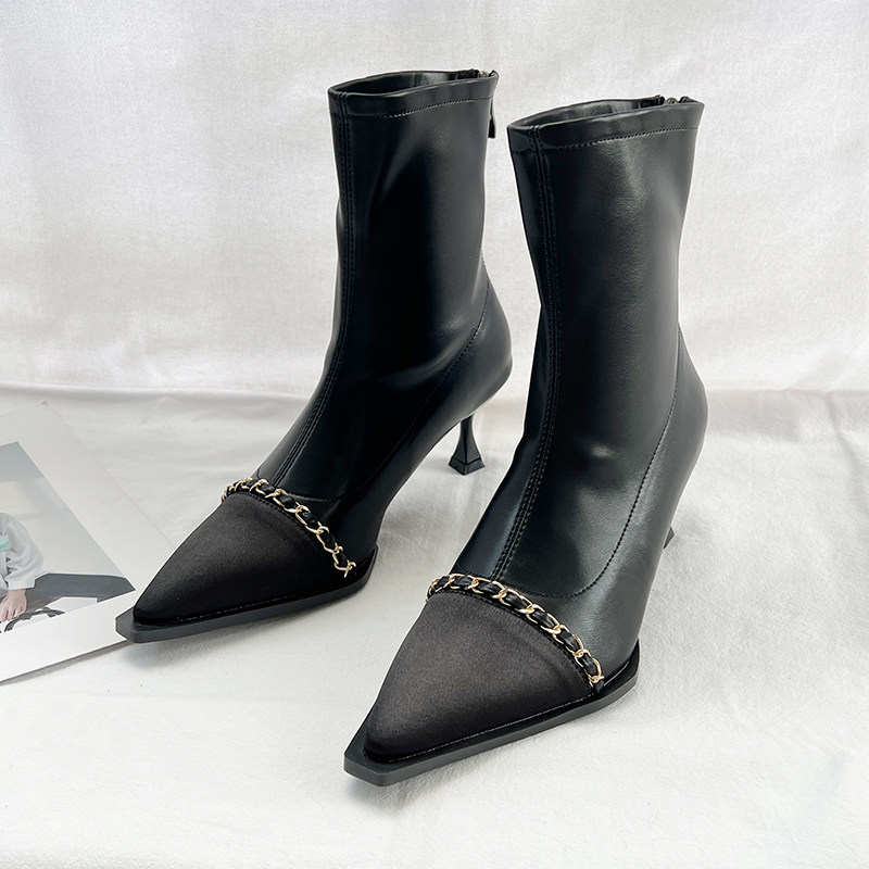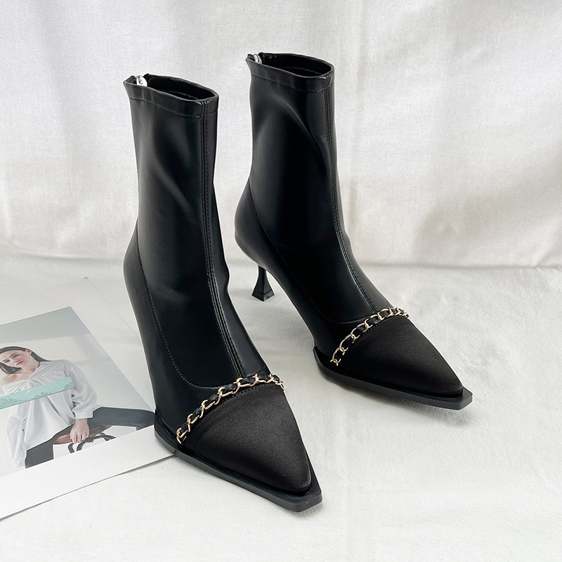 Короткие сапоги с заостренным носом, металлическая цепь с молнией на высоком каблуке, 2023, осенние, французский стиль