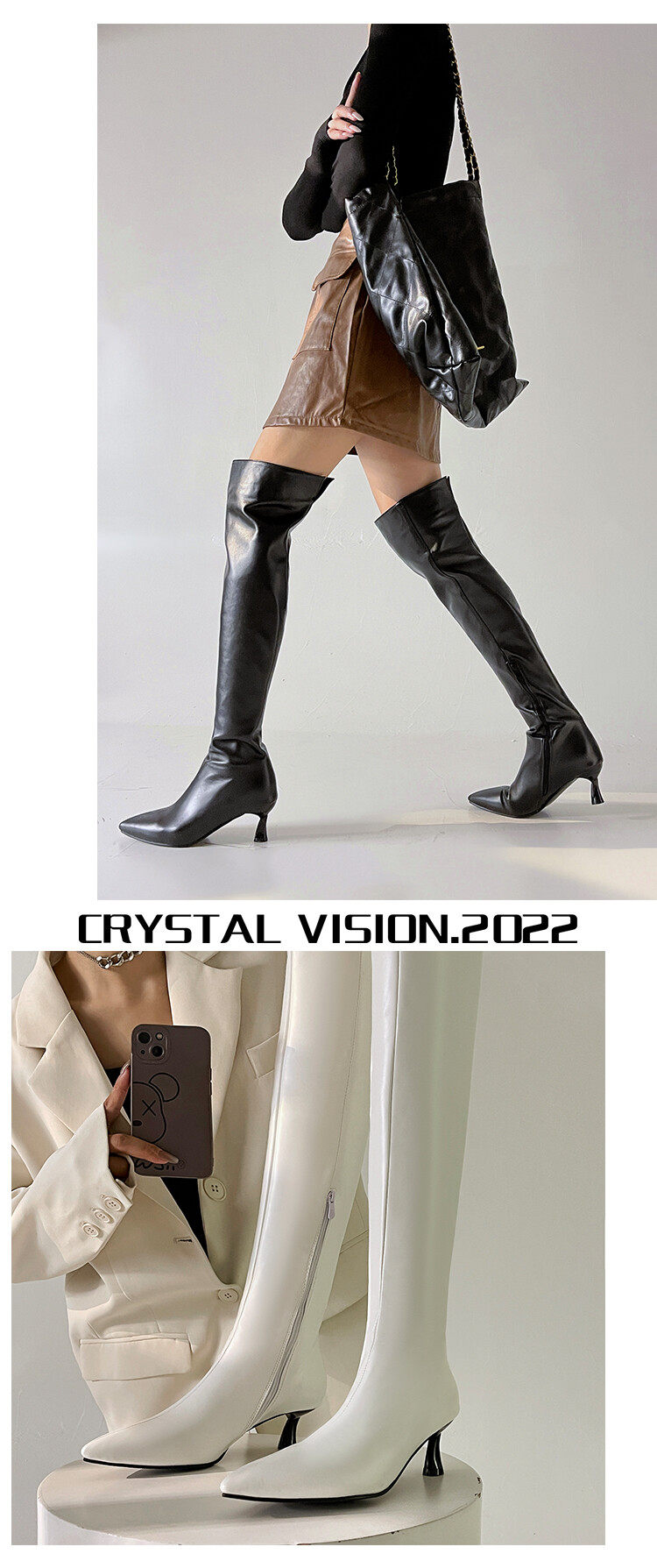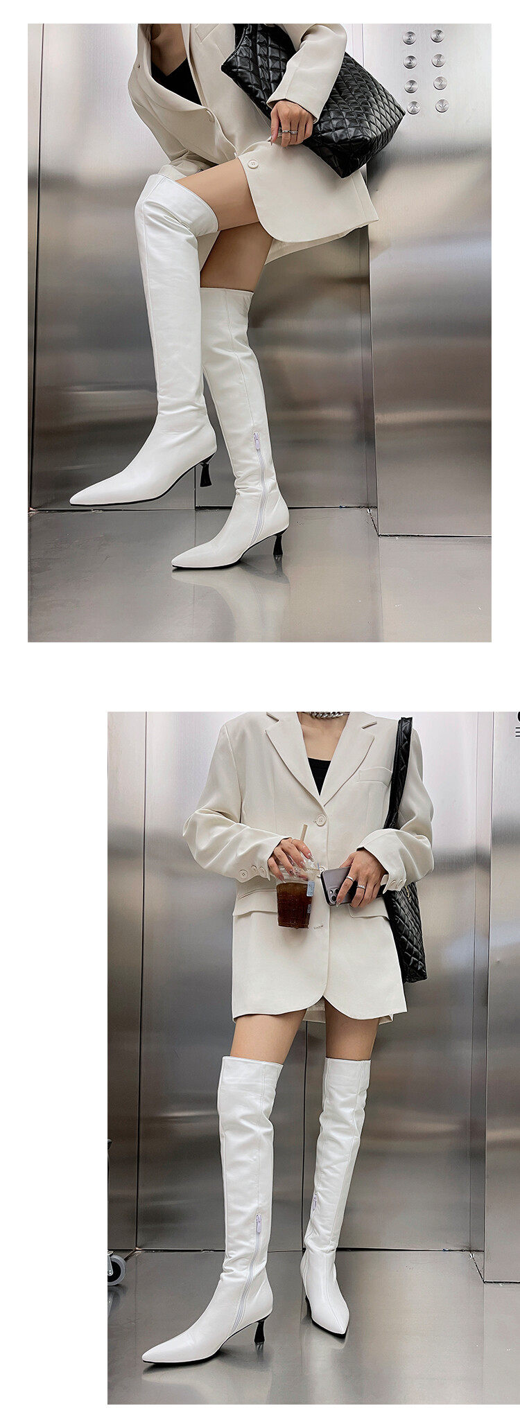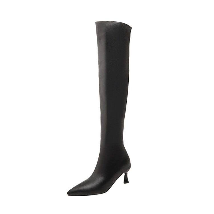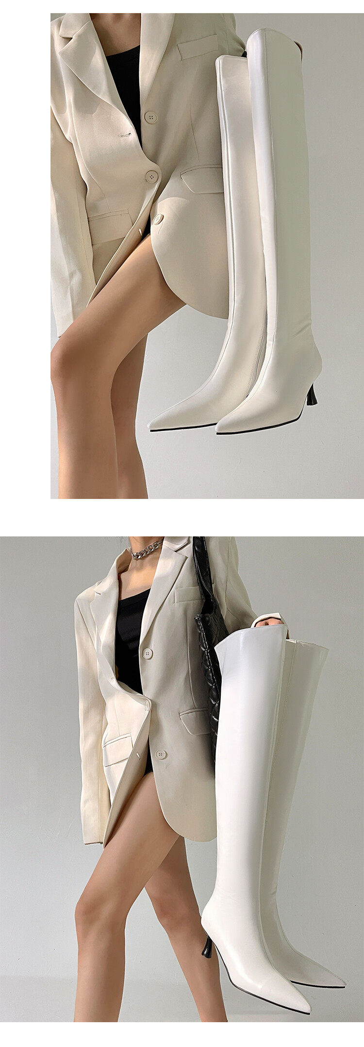[显瘦白色过膝靴欧美尖头中跟长靴子白色长筒靴大码44 45 46 47 48]
