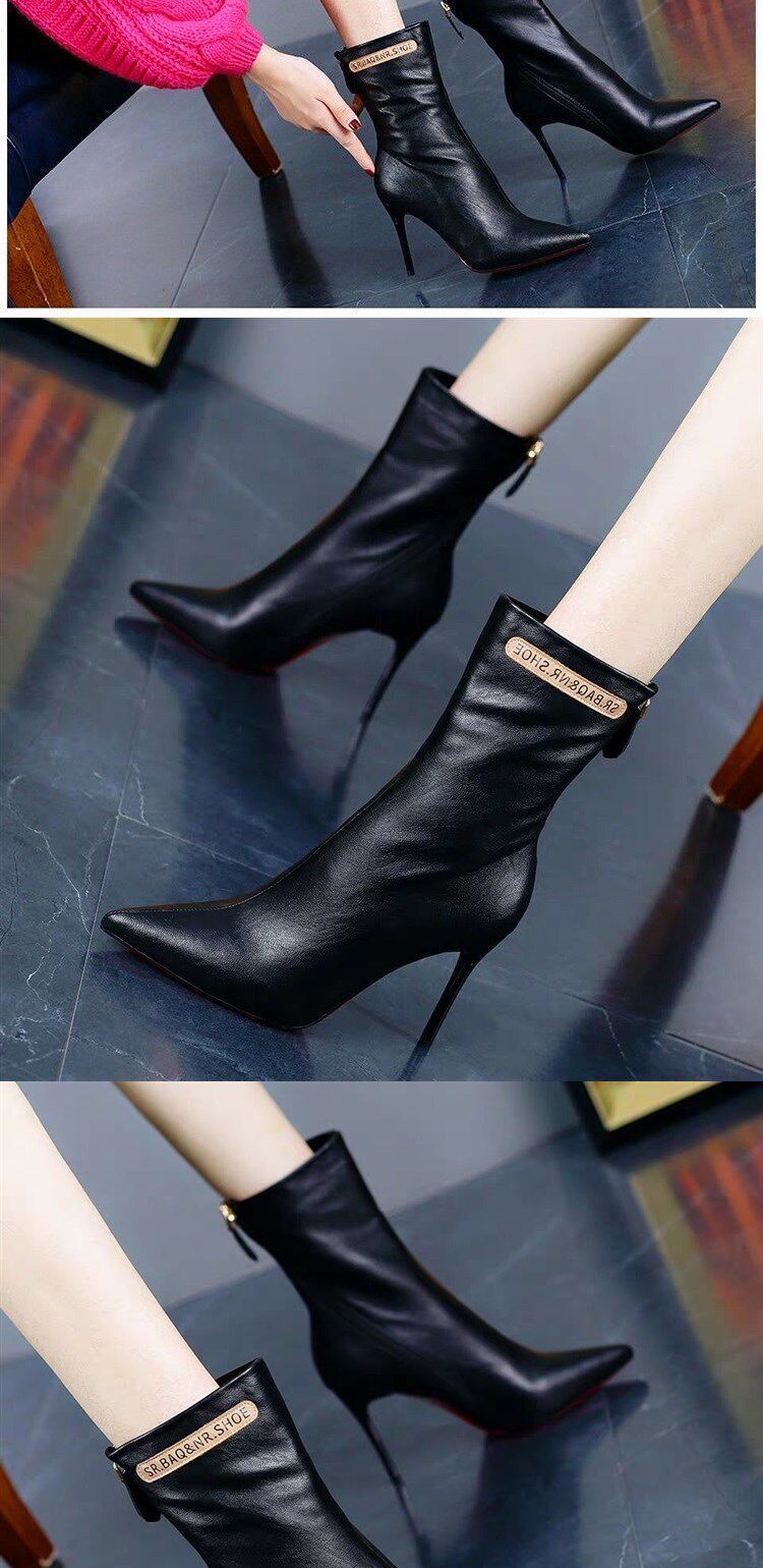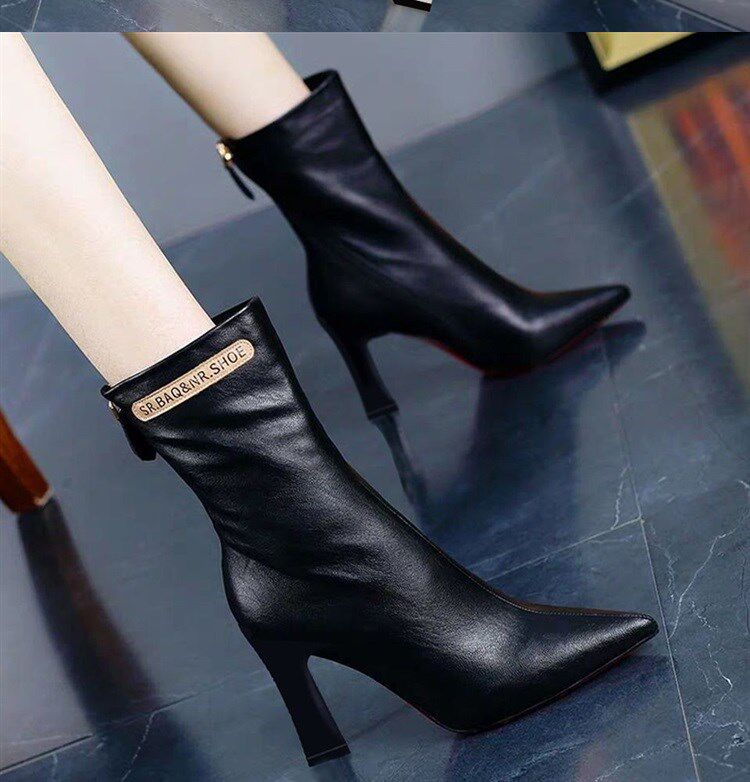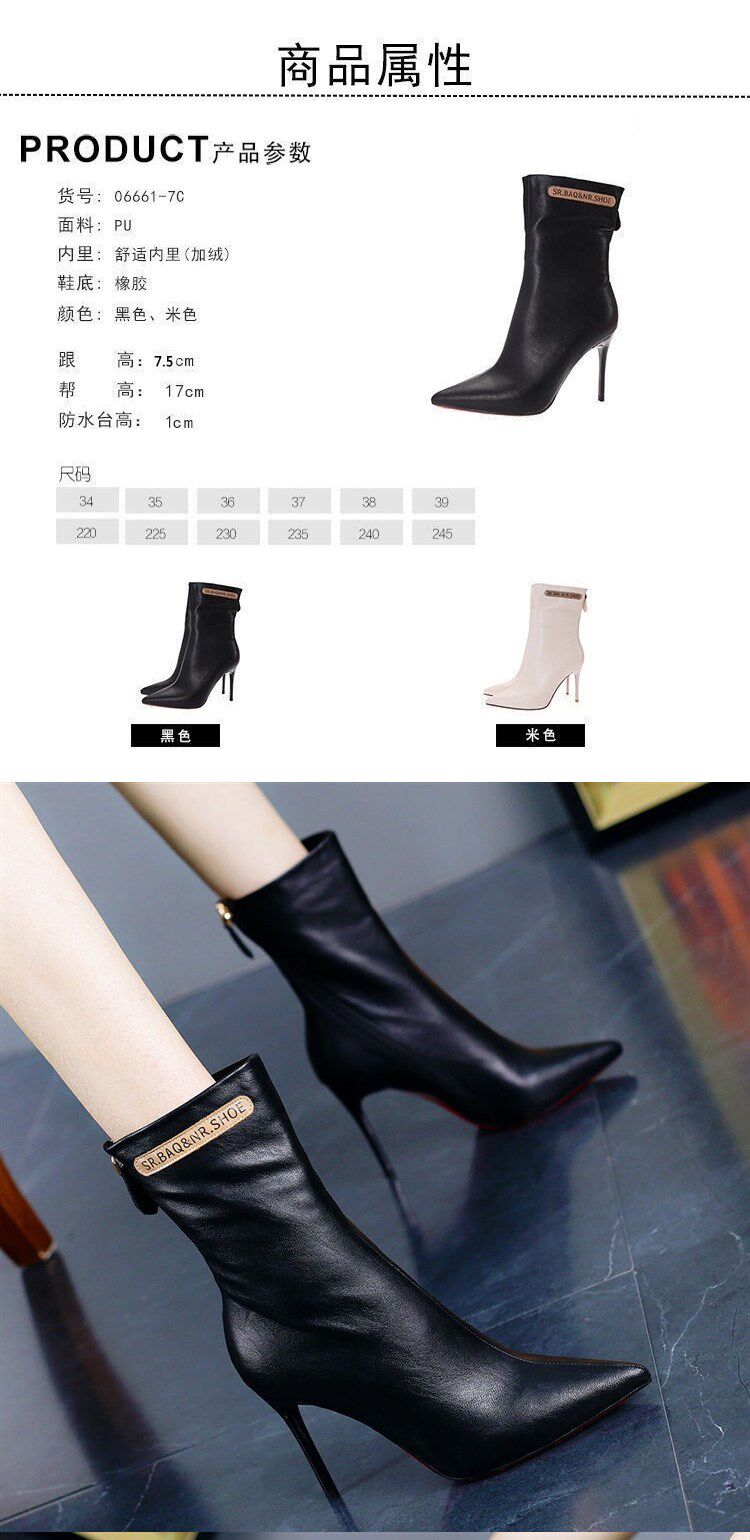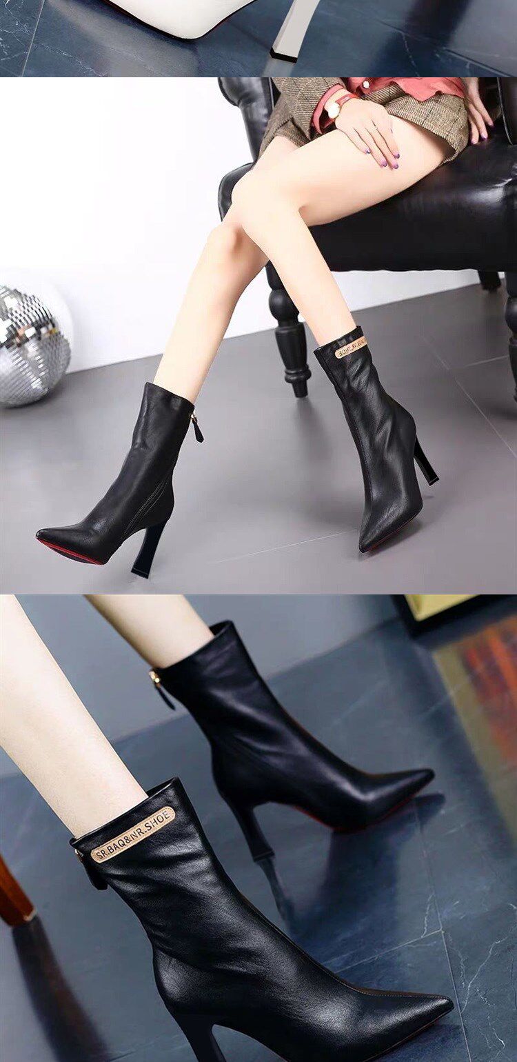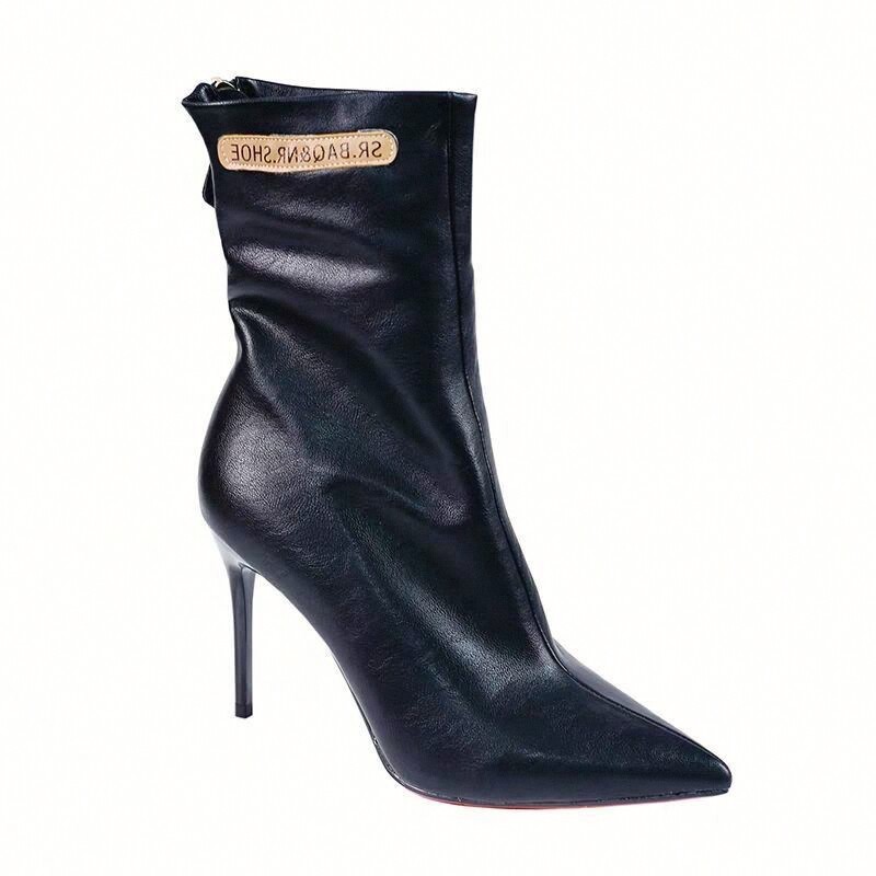 Модные сапоги с заостренным носом на высоком каблуке с молнией, флисовые демисезонные ботинки, популярно в интернете, средней длины
