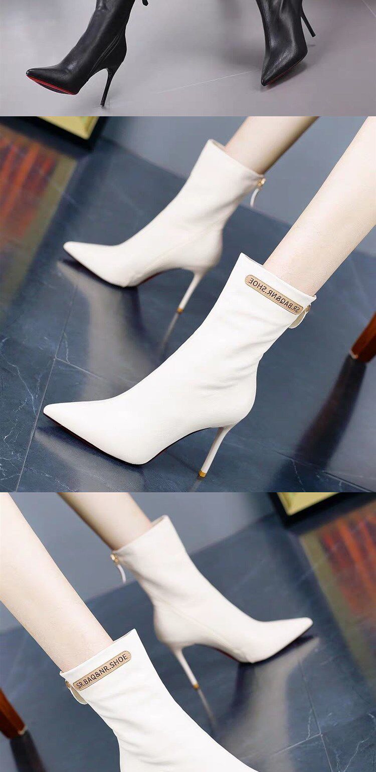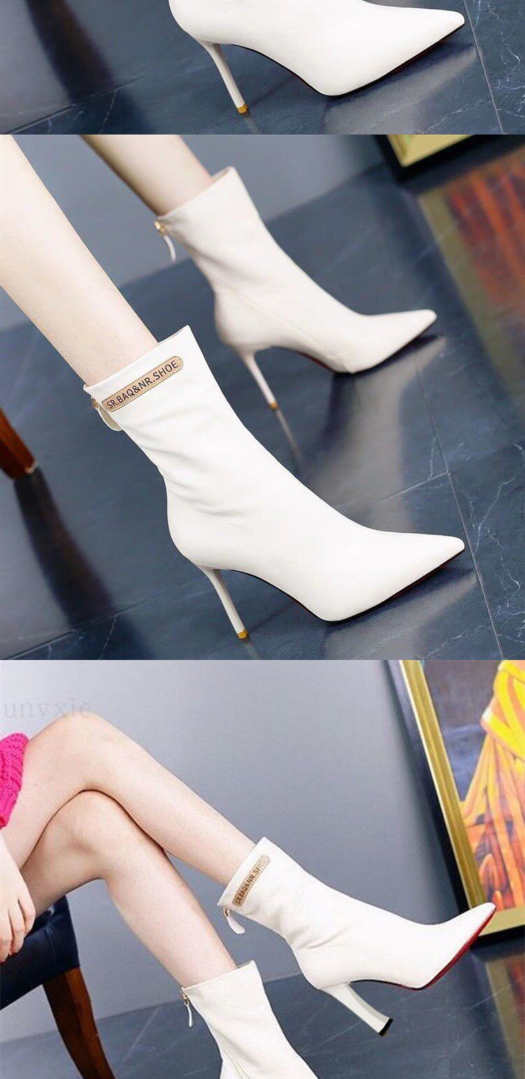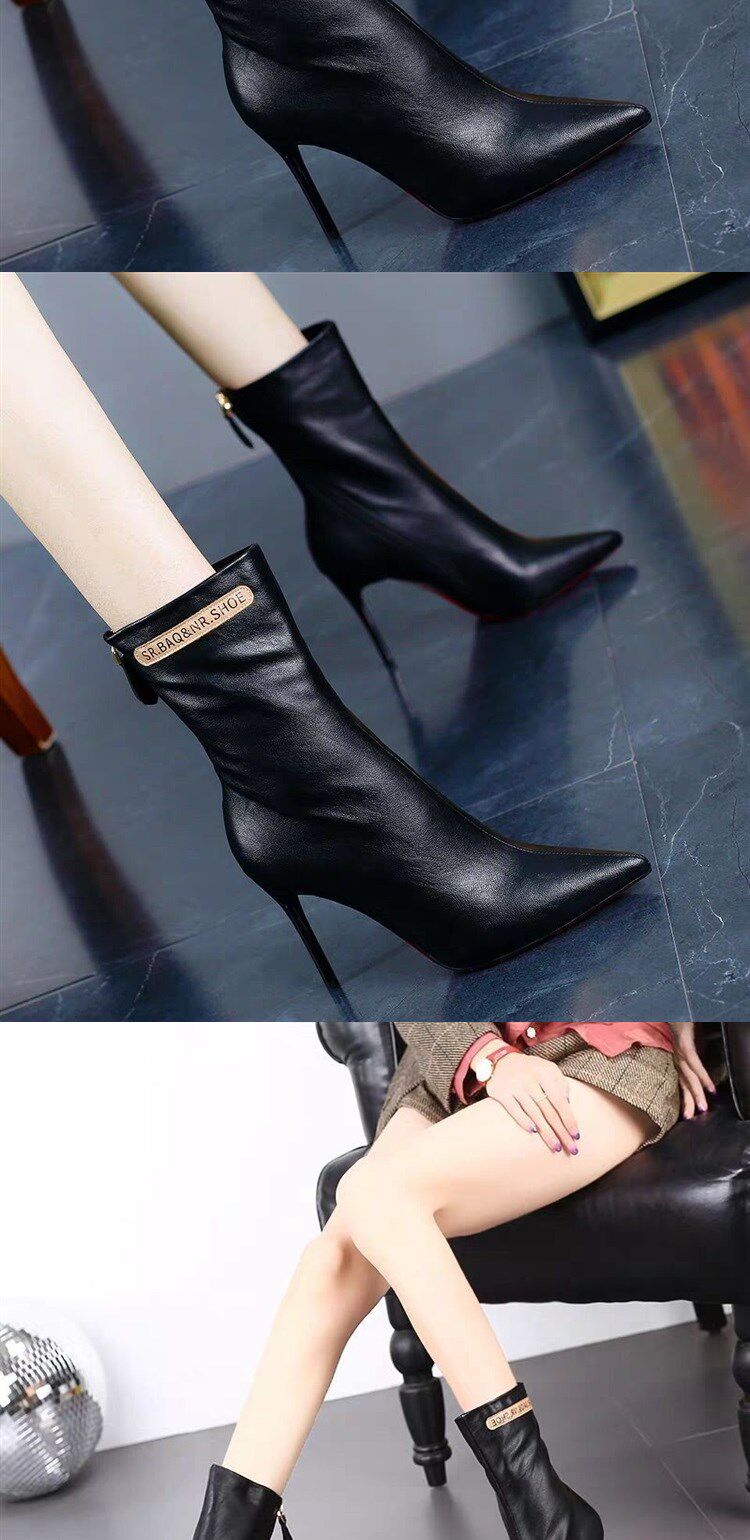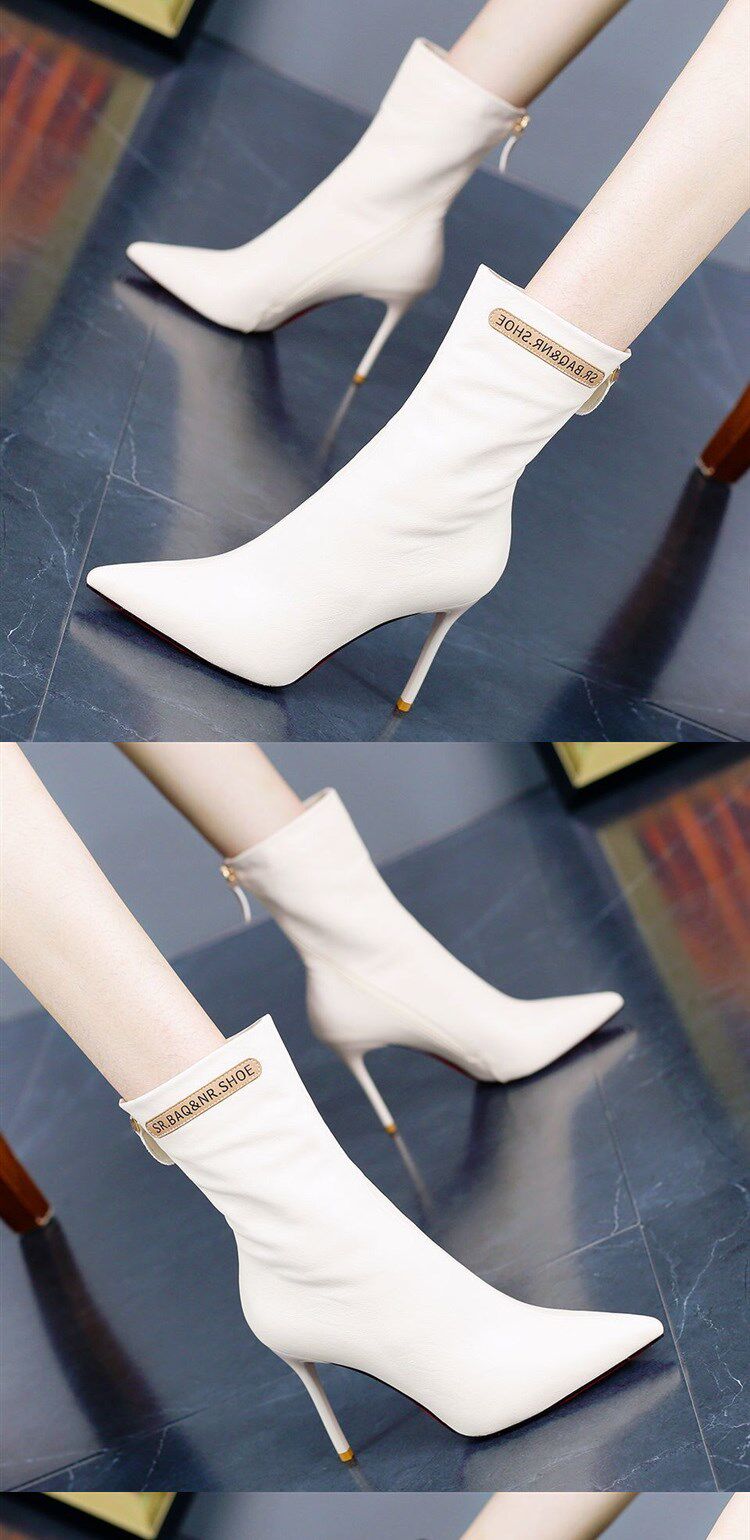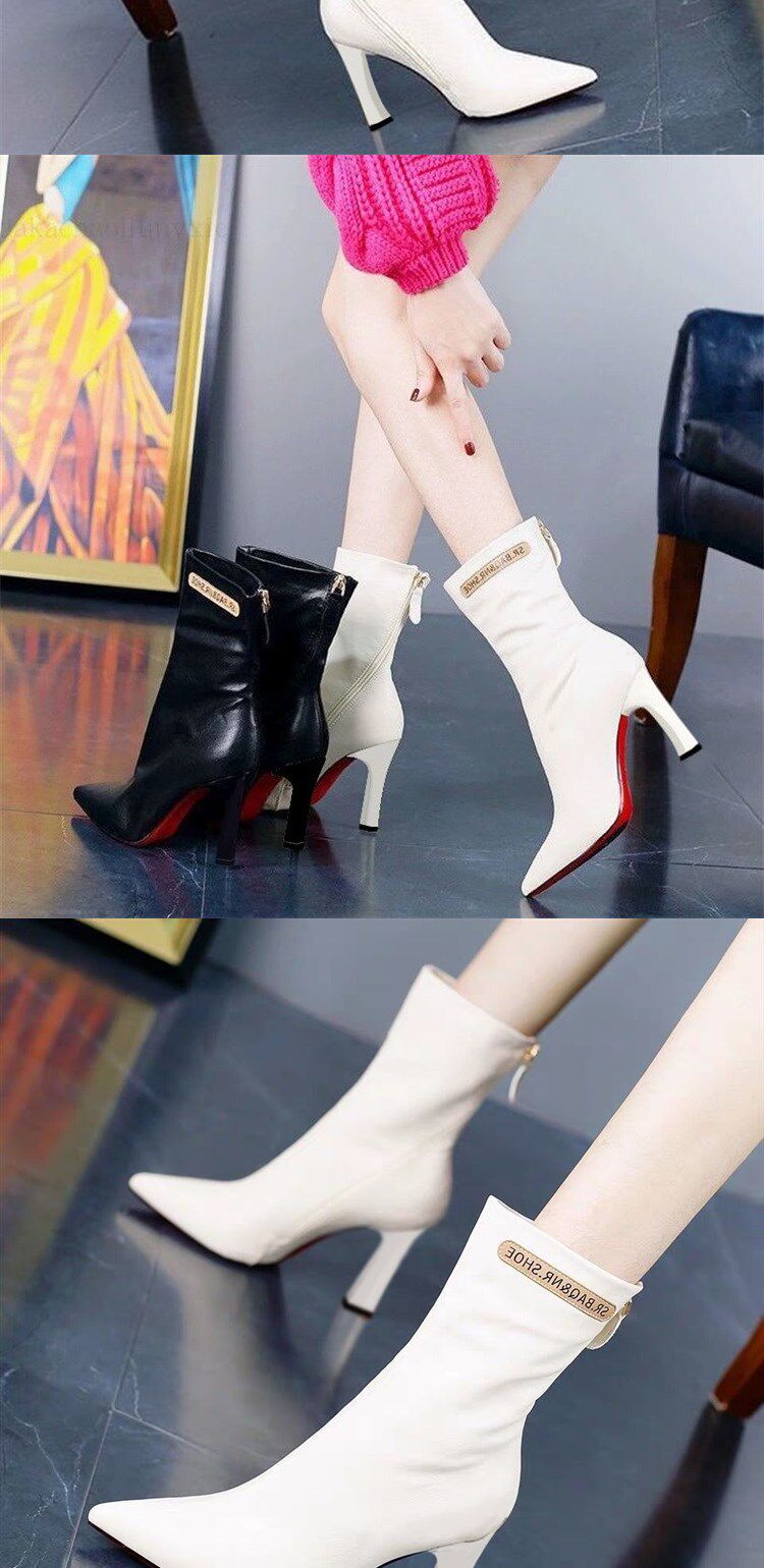 Модные сапоги с заостренным носом на высоком каблуке с молнией, флисовые демисезонные ботинки, популярно в интернете, средней длины