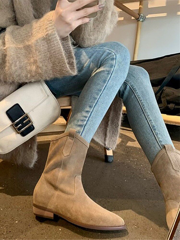 Демисезонные челси с заостренным носом, матовые джинсовые короткие сапоги