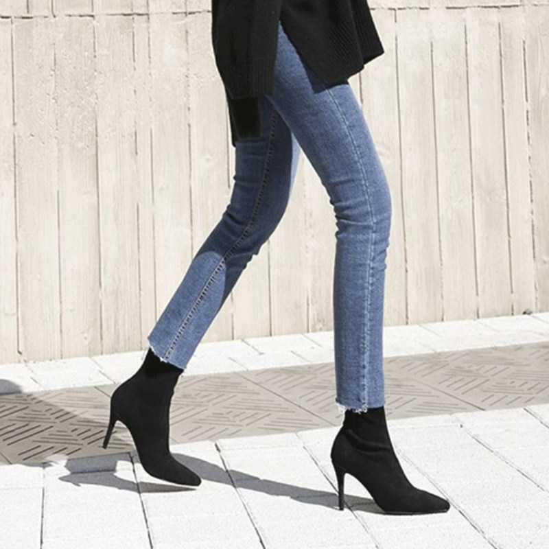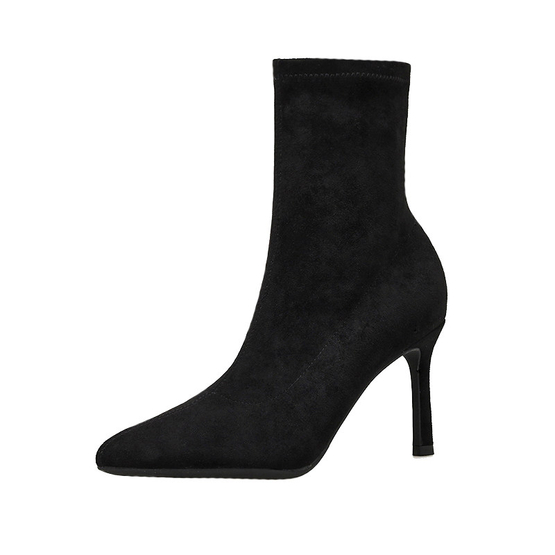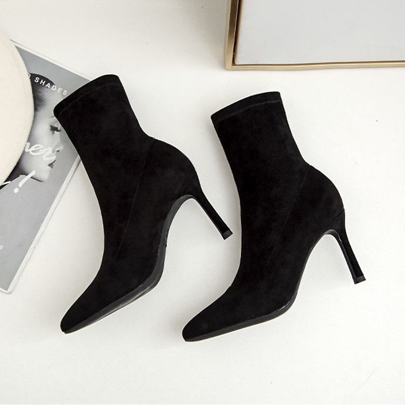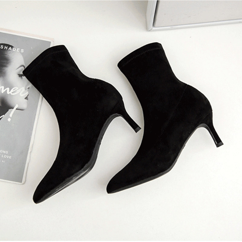 Высокие флисовые эластичные сексуальные черные короткие сапоги с заостренным носом, популярно в интернете