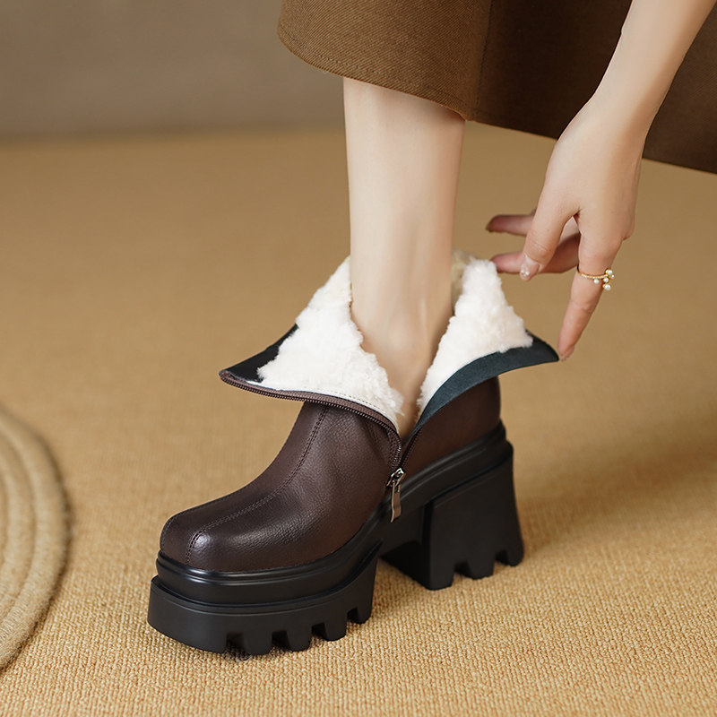 Флисовые высокие зимние короткие сапоги на платформе, из натуральной кожи