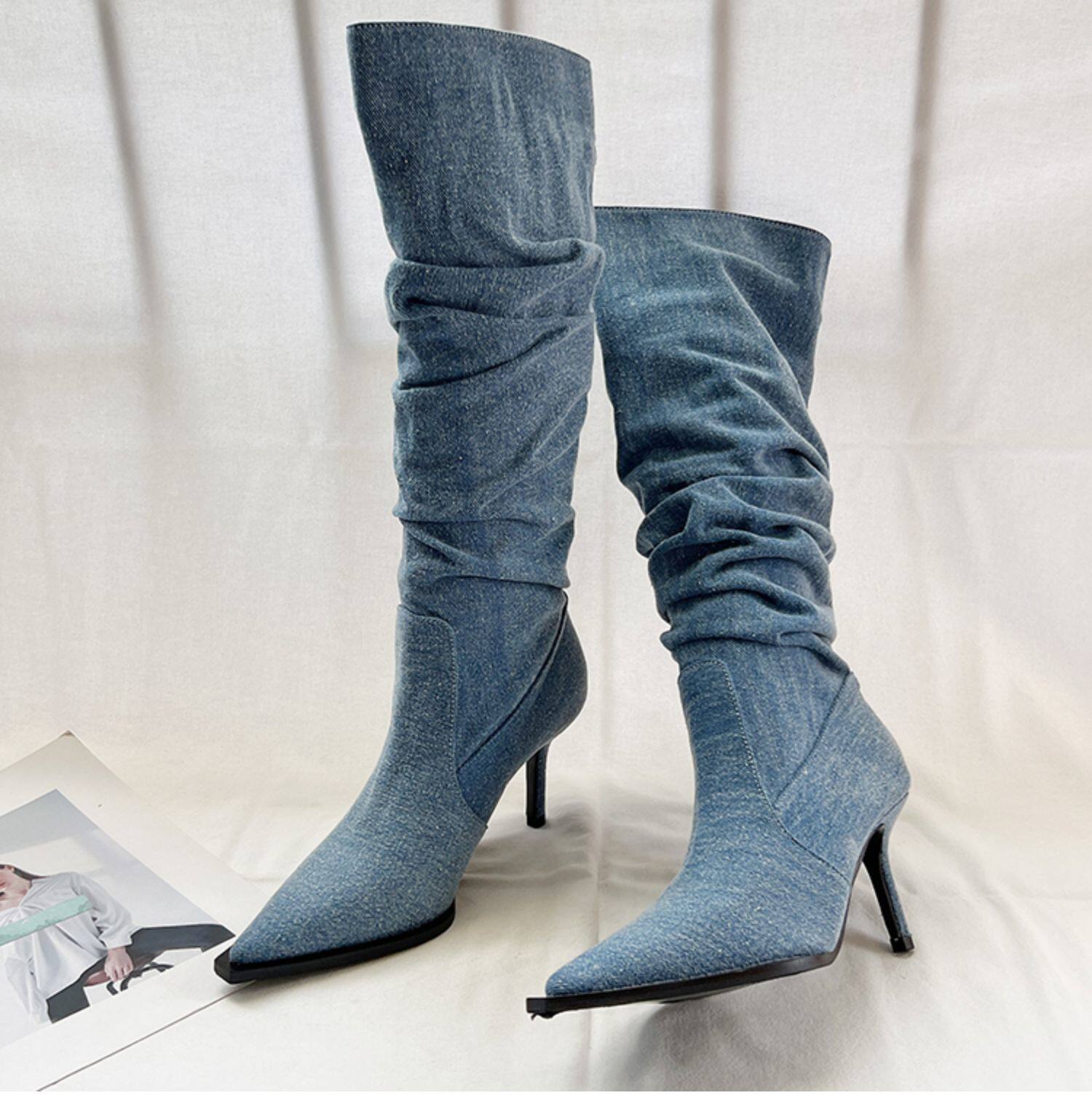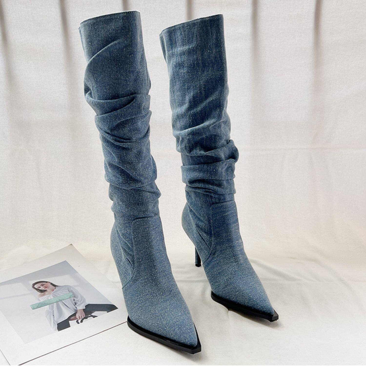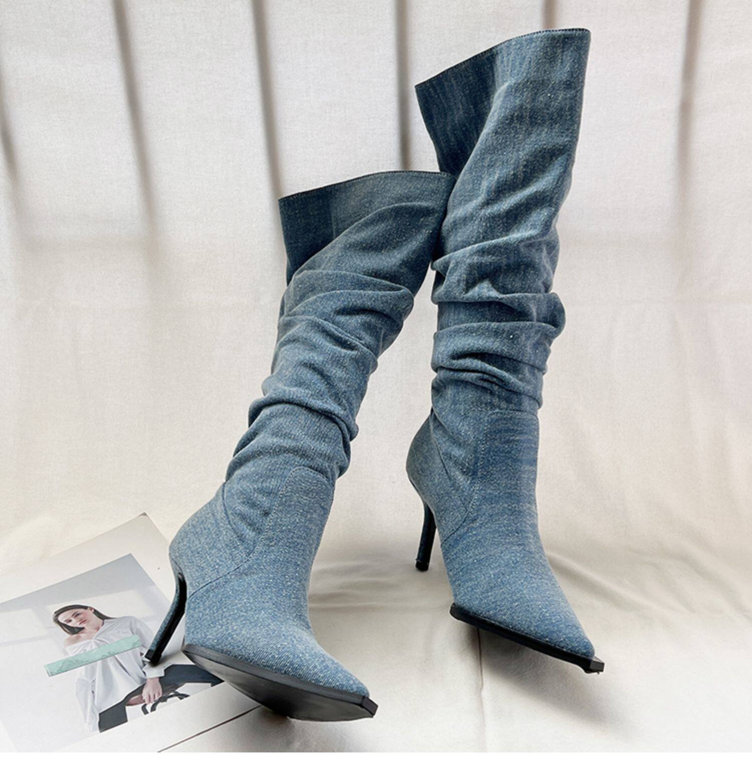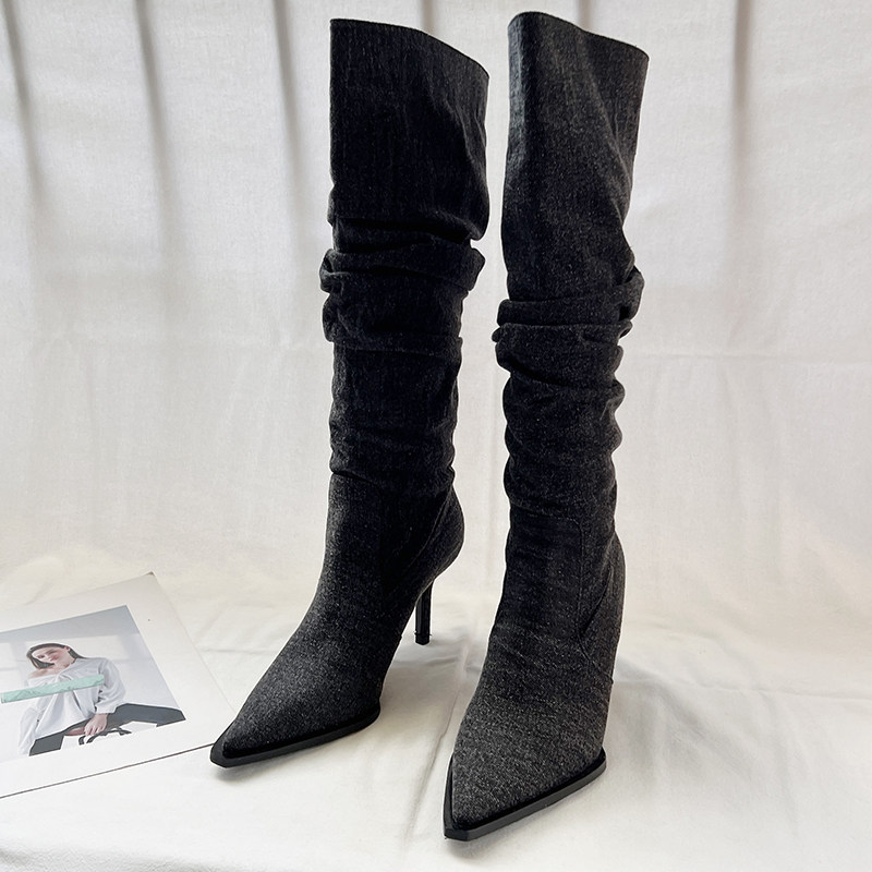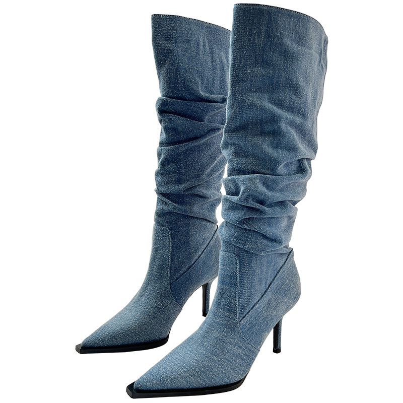 Джинсовые высокие высокие сапоги с заостренным носом, европейский стиль, осенние