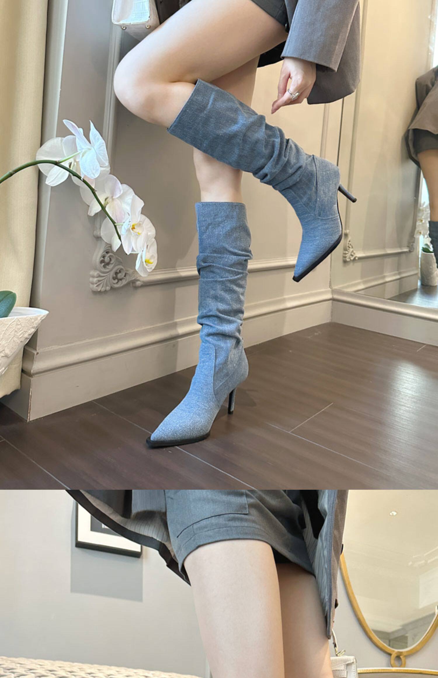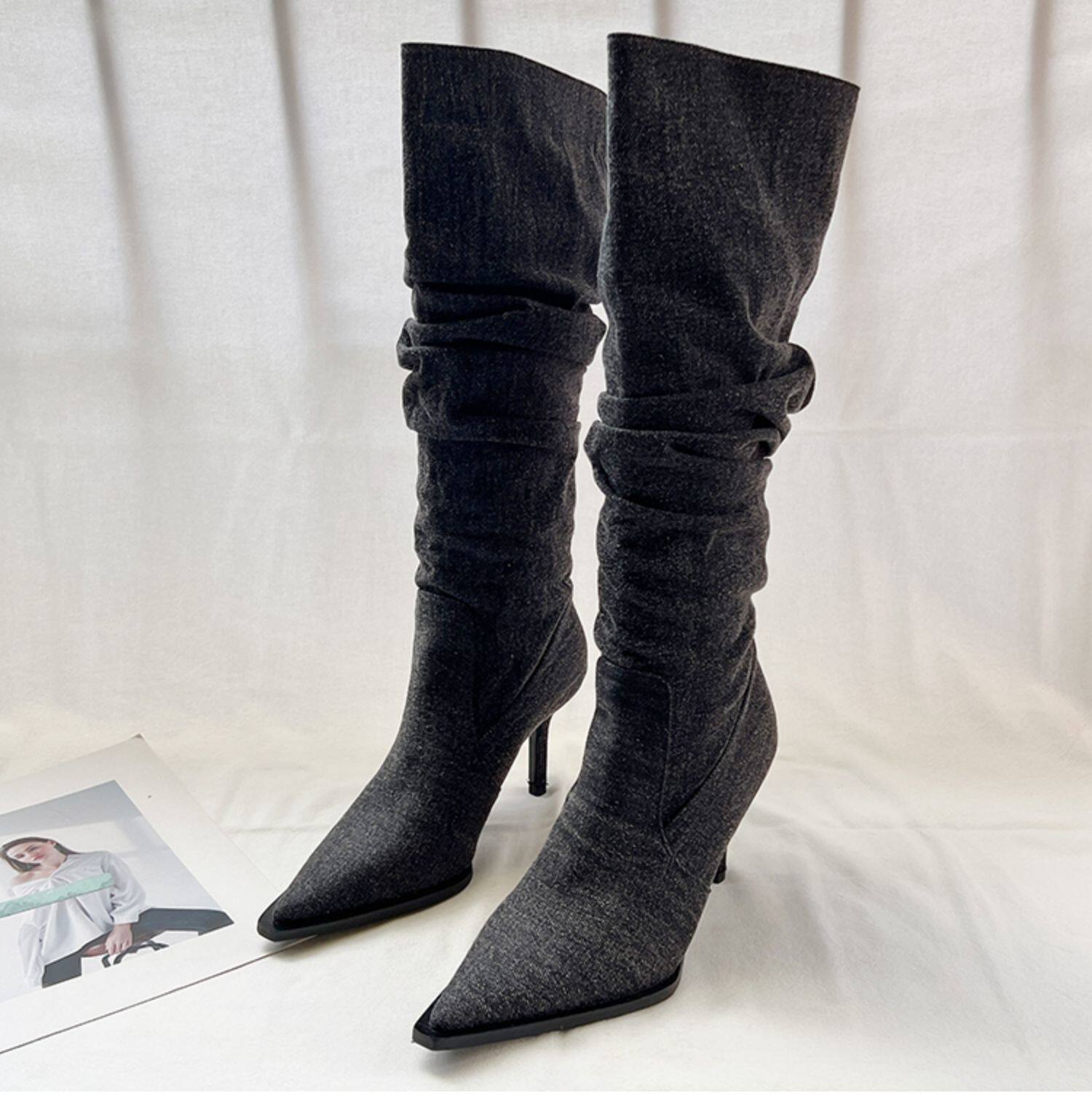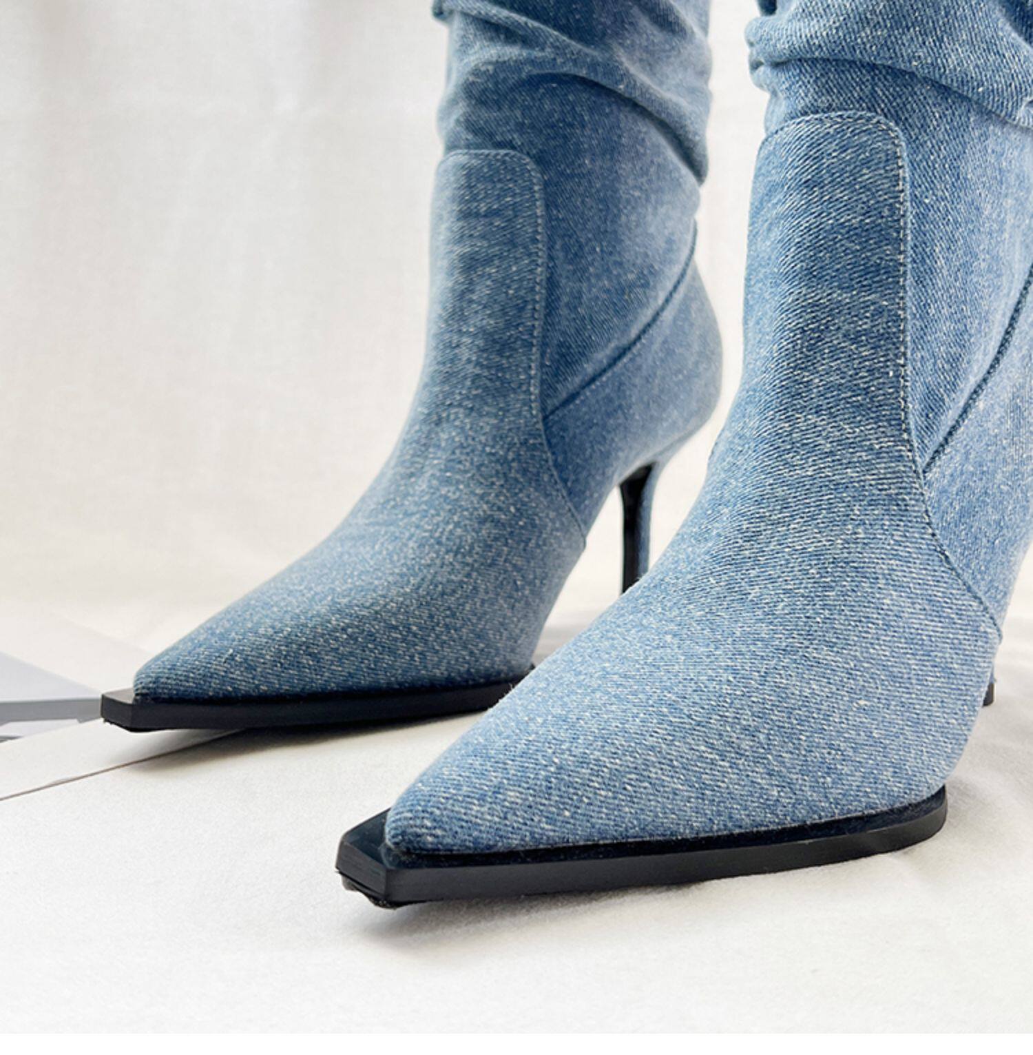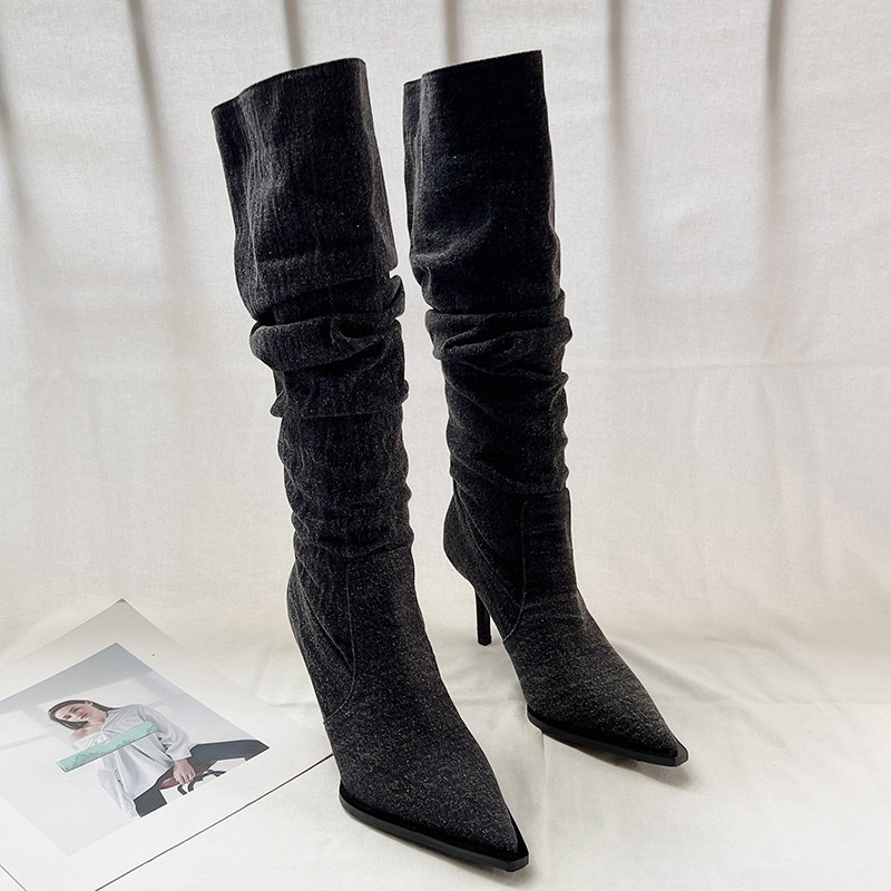 Джинсовые высокие высокие сапоги с заостренным носом, европейский стиль, осенние