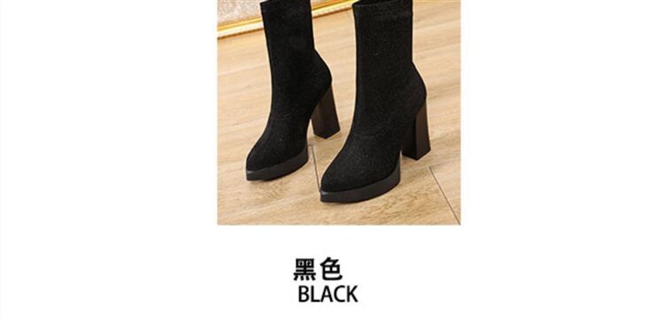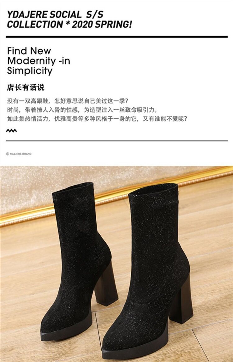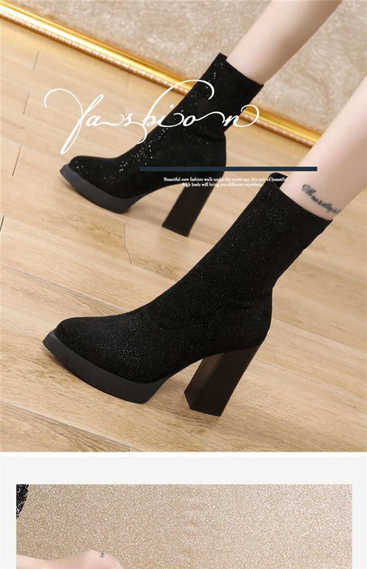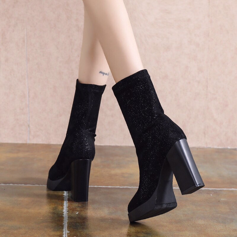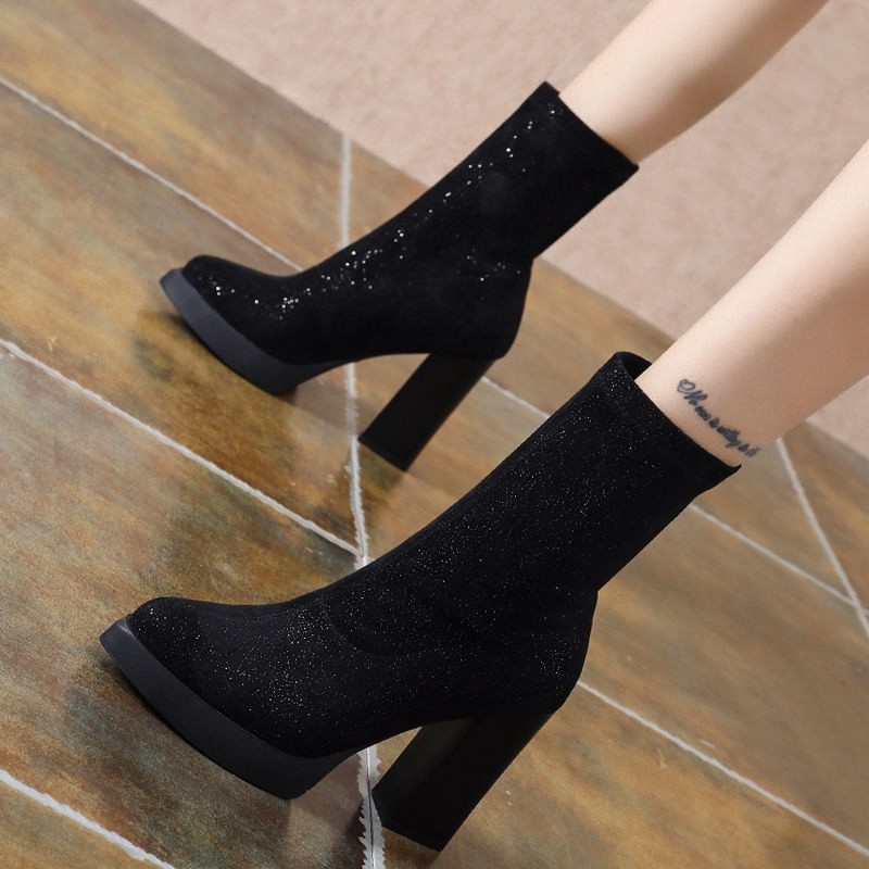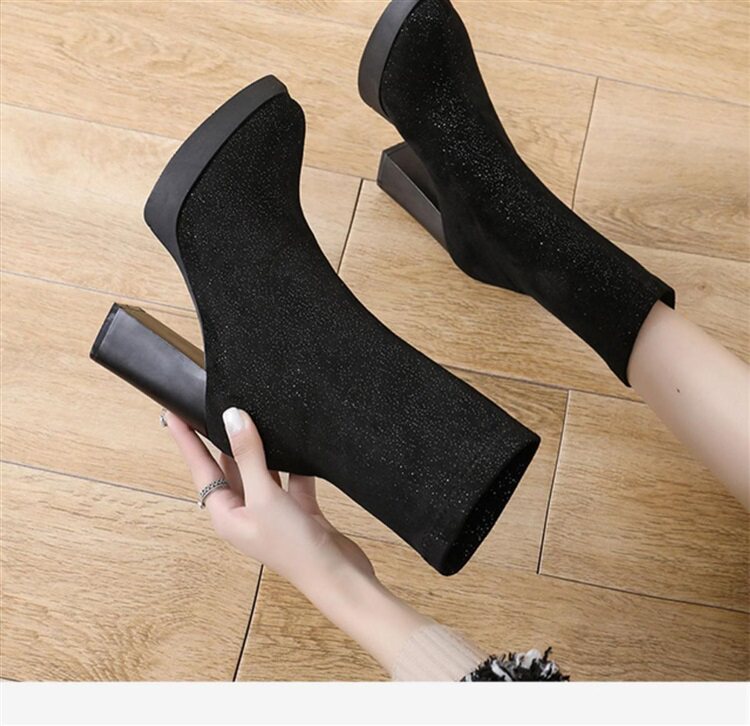 Эластичная зимняя обувь на высоком каблуке, короткие сапоги с заостренным носом, популярно в интернете, 2023, средней длины