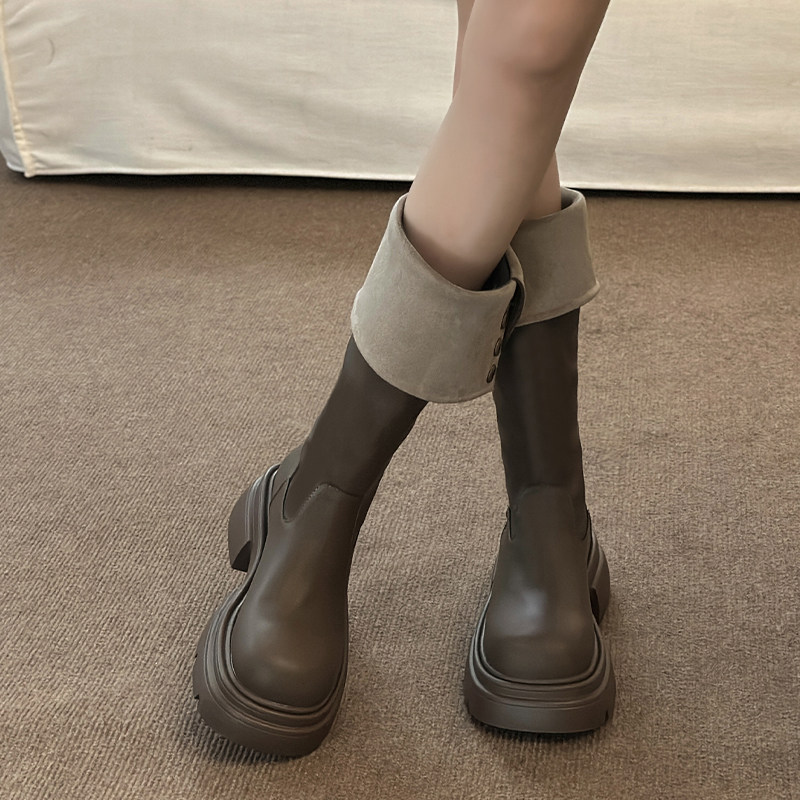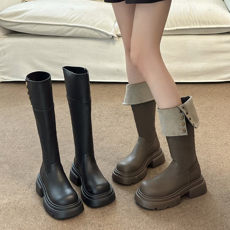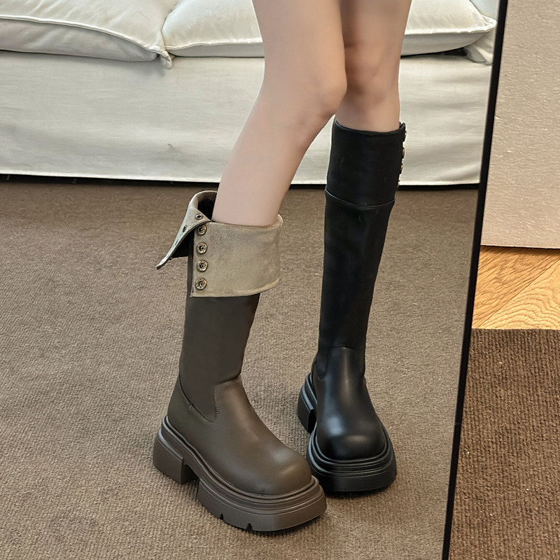 Черные демисезонные высокие сапоги на платформе, ботинки, 2024 года, средней длины, в американском стиле