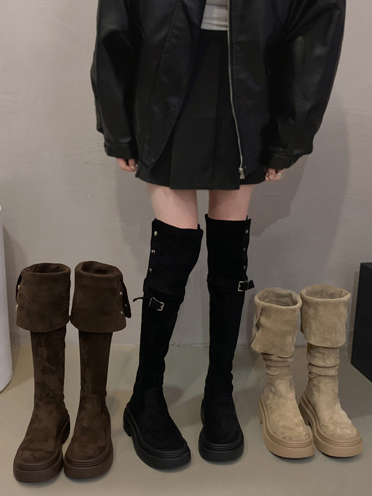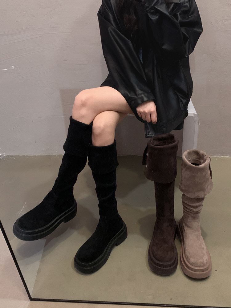 Коричневые высокие высокие сапоги на платформе, осенние