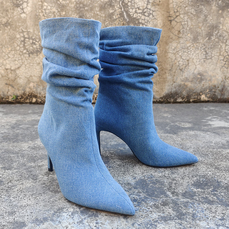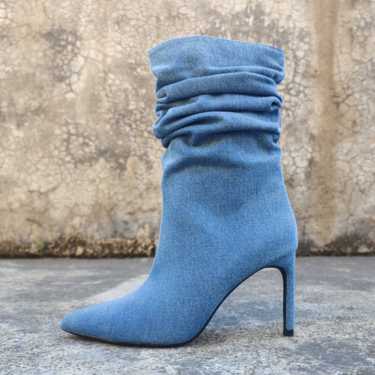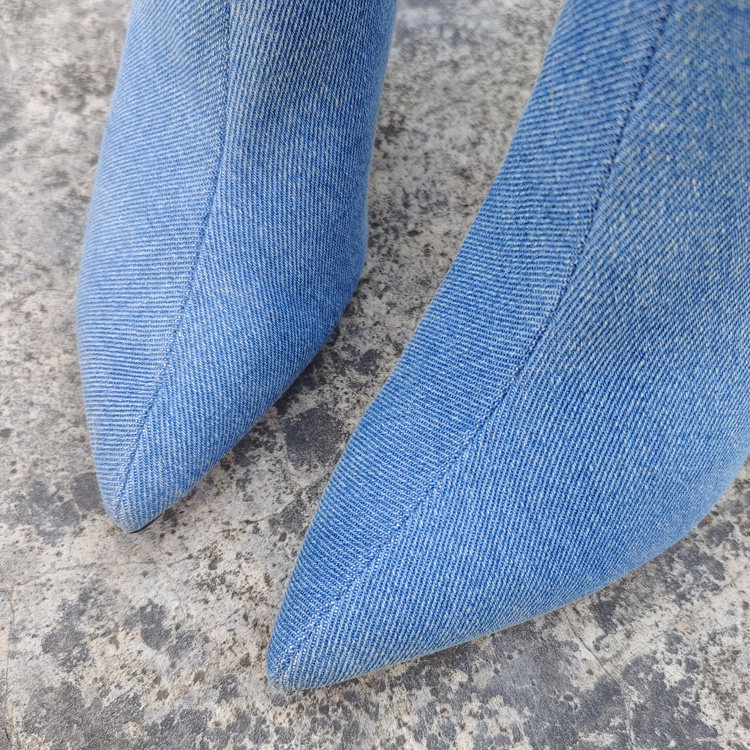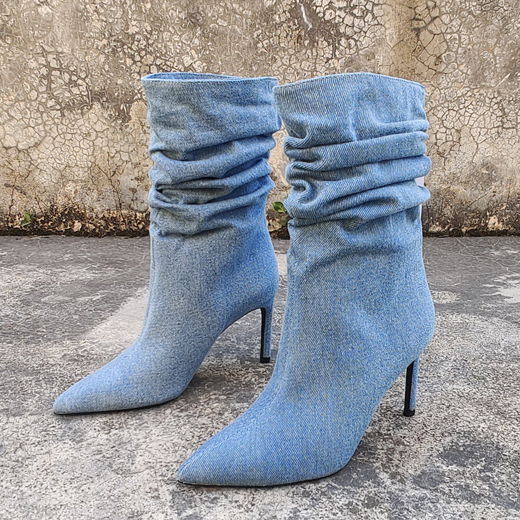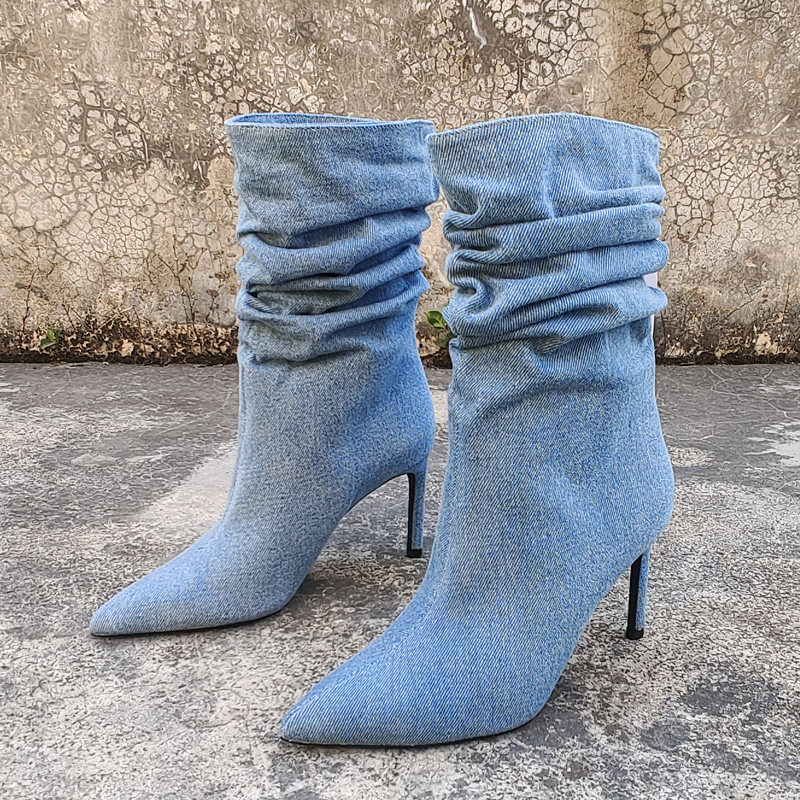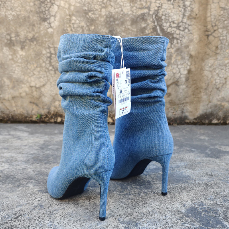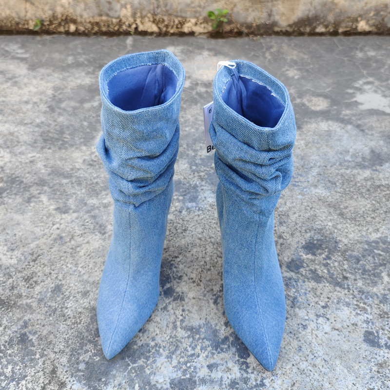 Экспортированы в Испанию, новая модель джинсовых ворсовых сапог размера 35-41, пикантные женские короткие сапоги высокого класса с острым носком и рукавами-шпильками.