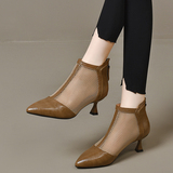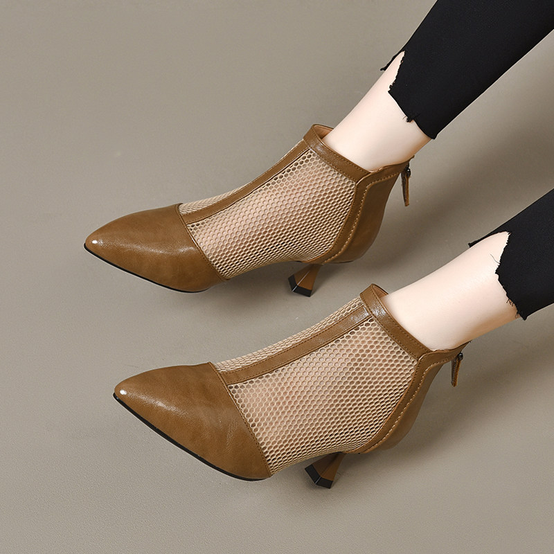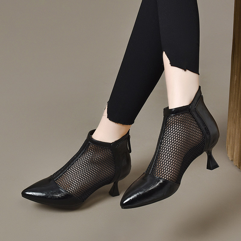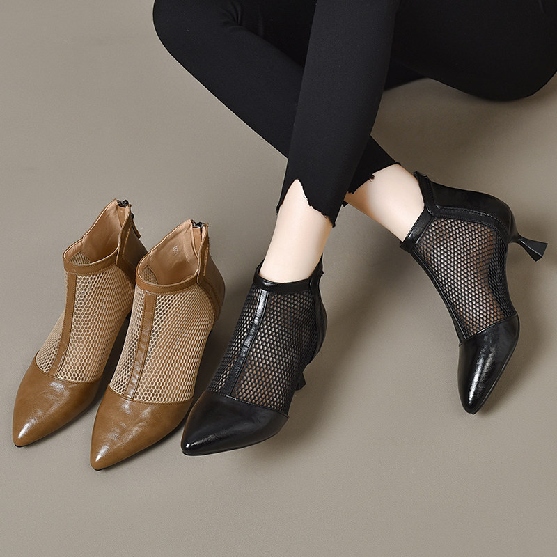 Весенние летние короткие сапоги с заостренным носом на высоком каблуке, сетчатые дышащие сандалии, из натуральной кожи