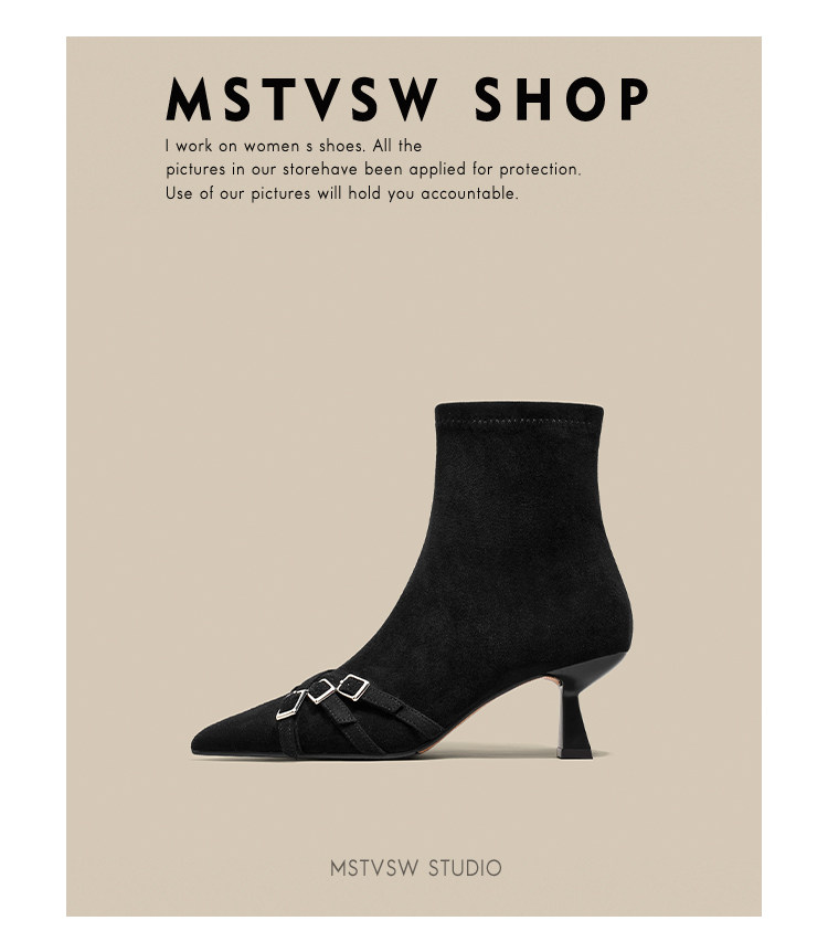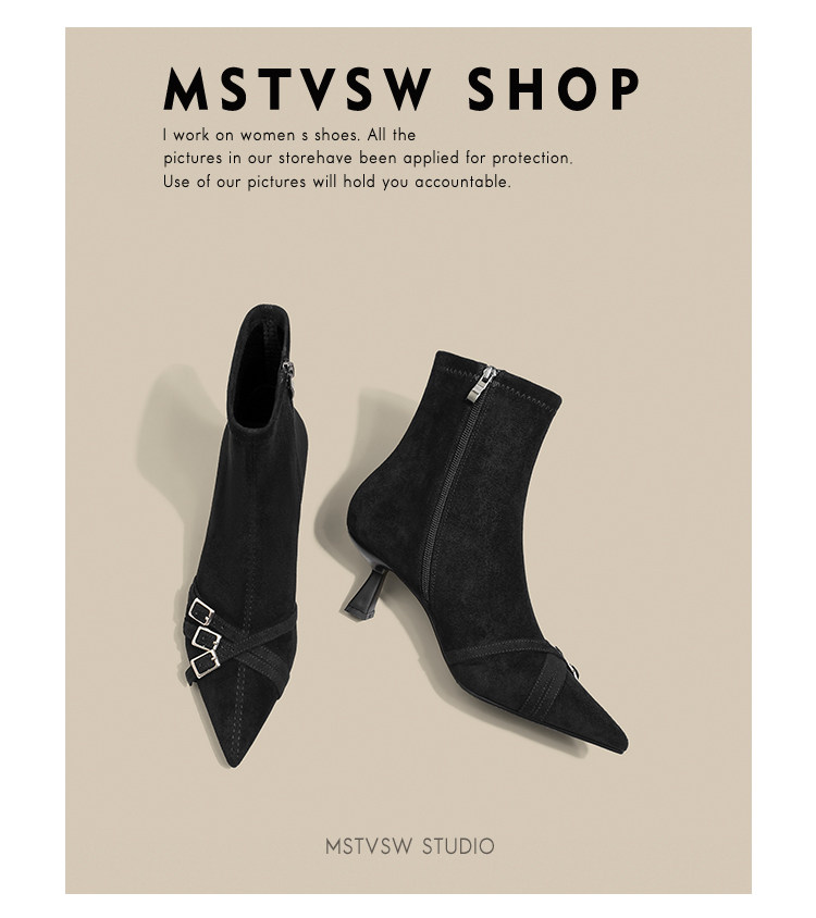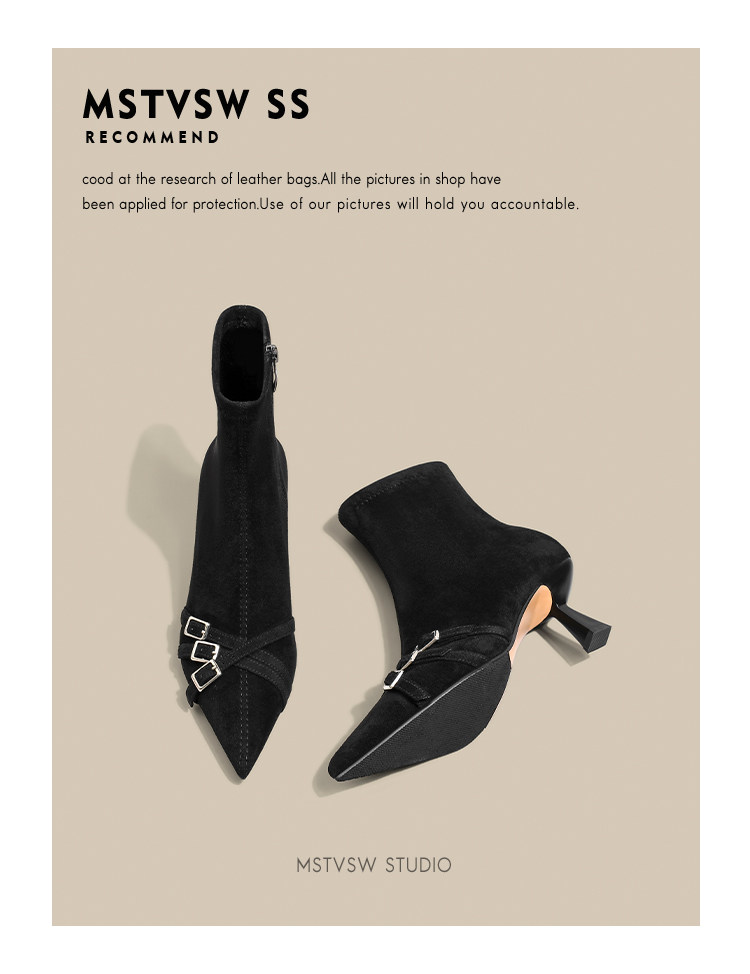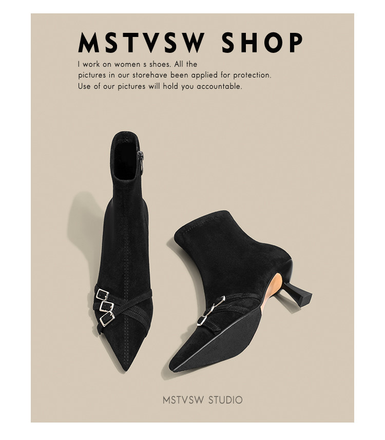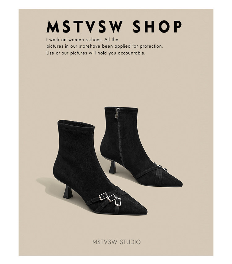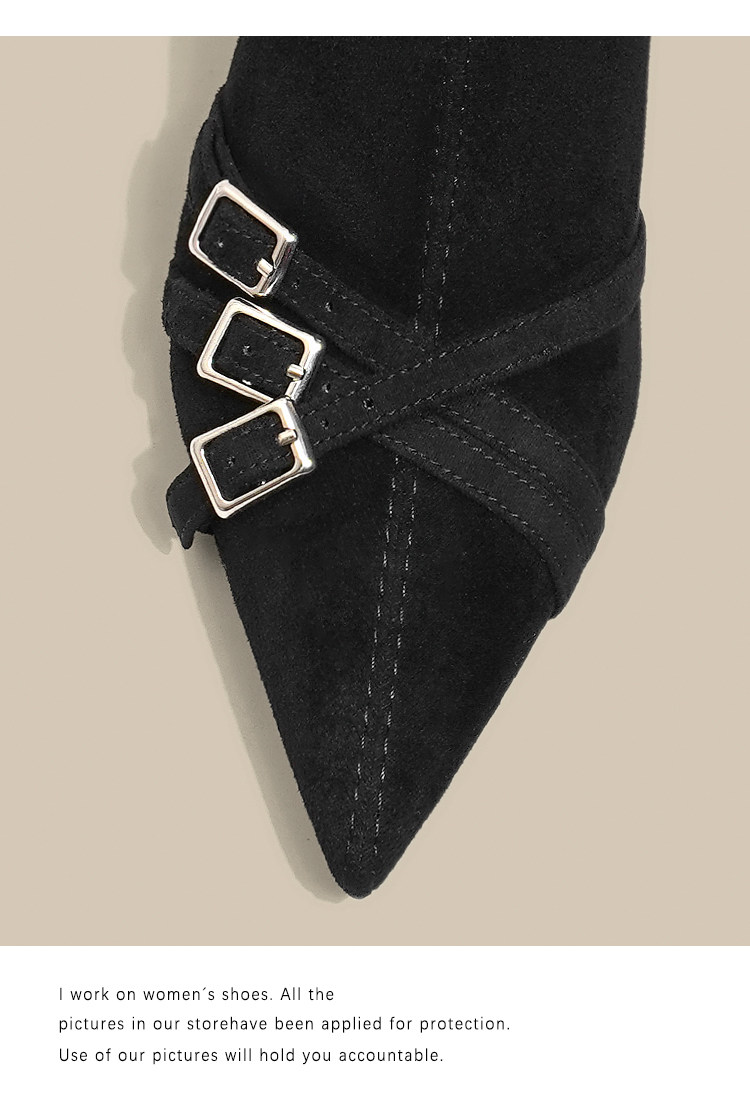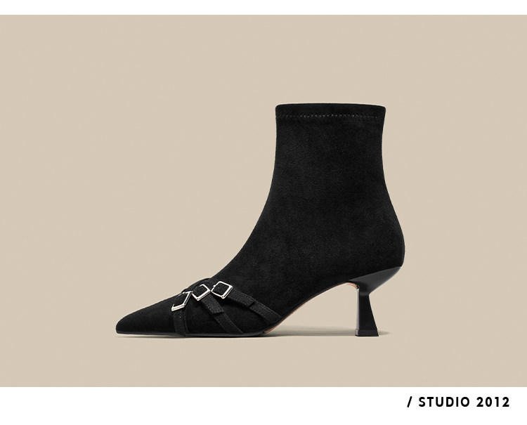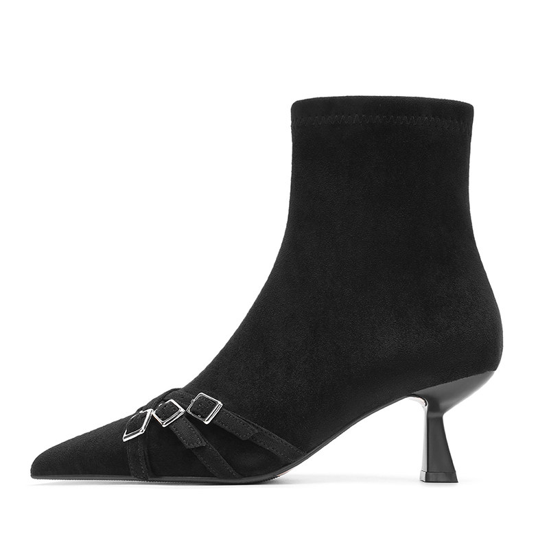 Короткие сапоги с заостренным носом на высоком каблуке, ремень, эластичная черная пряжка, замшевые ботинки, в корейском стиле