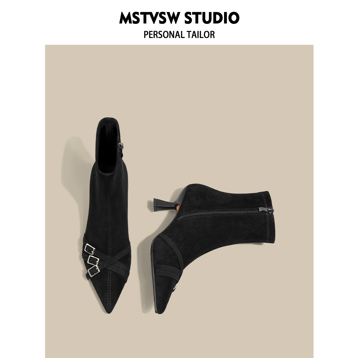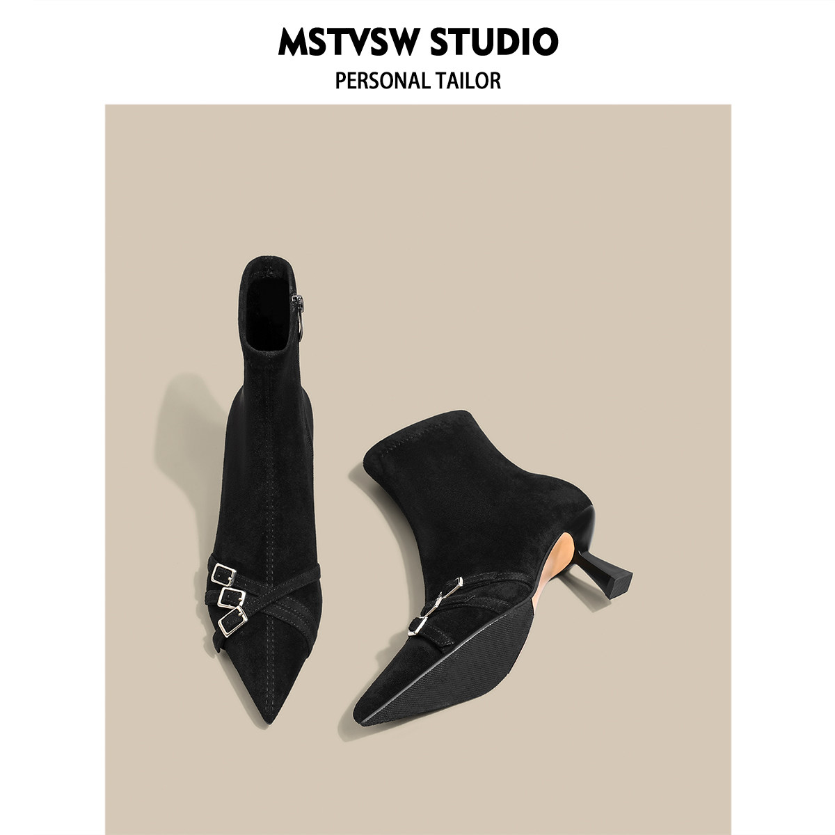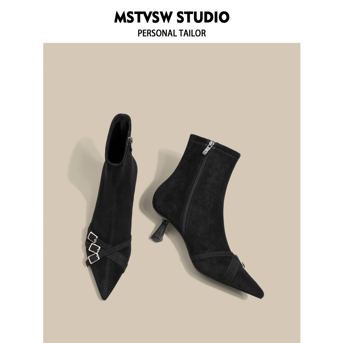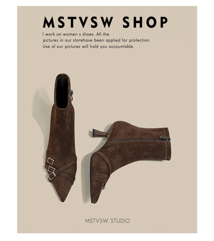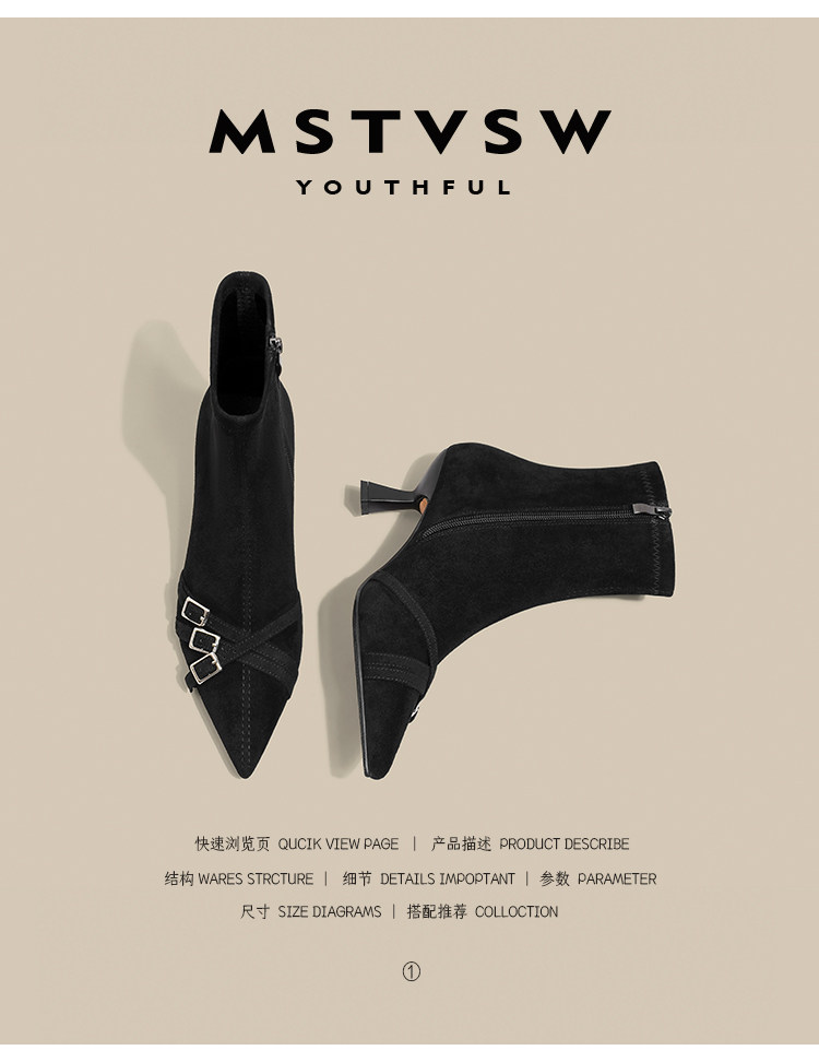 Короткие сапоги с заостренным носом на высоком каблуке, ремень, эластичная черная пряжка, замшевые ботинки, в корейском стиле