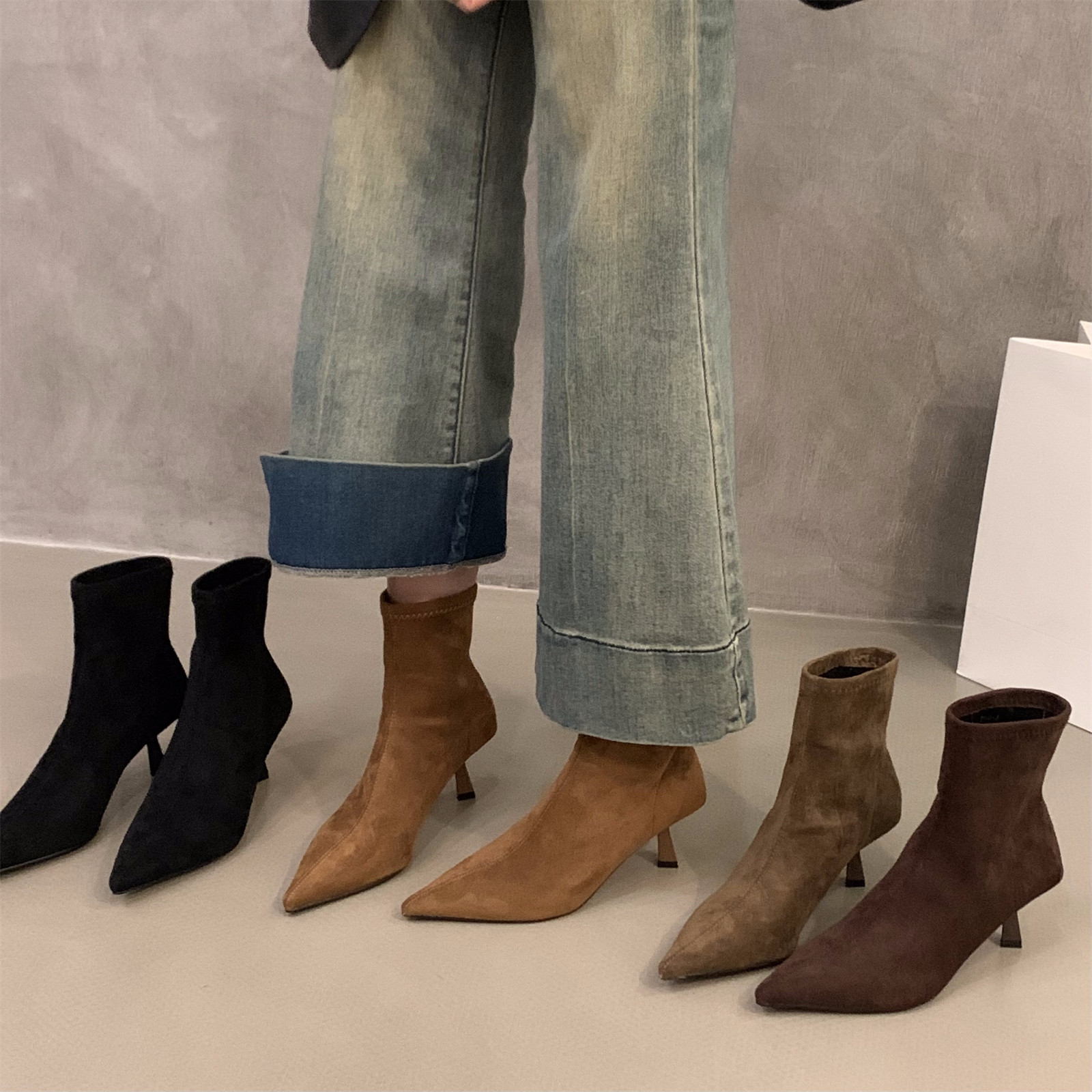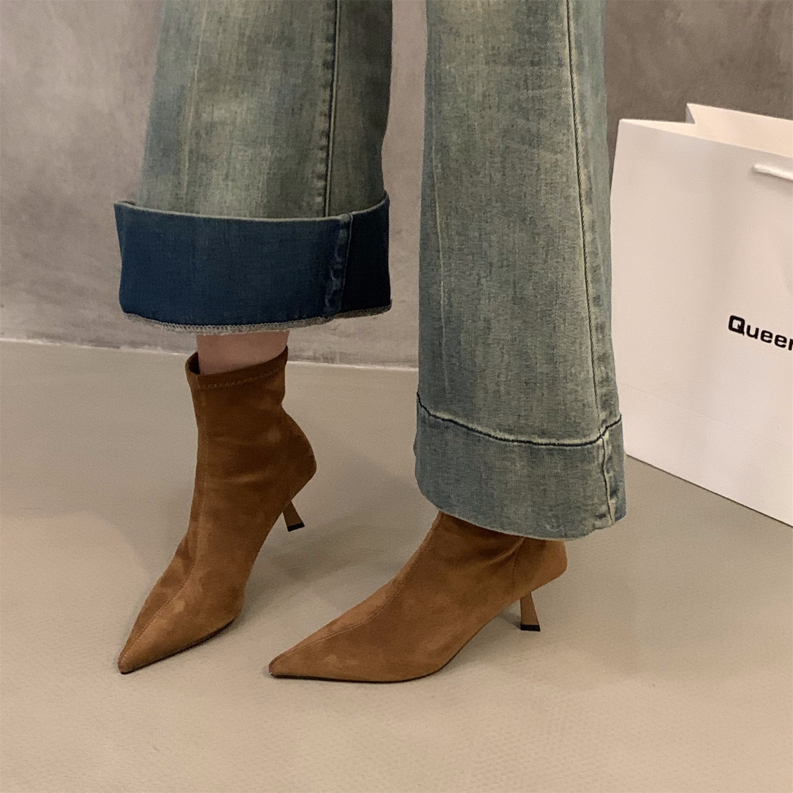 Демисезонные высокие коричневые замшевые короткие сапоги с заостренным носом, утепленные ботильоны, ботинки, французский стиль