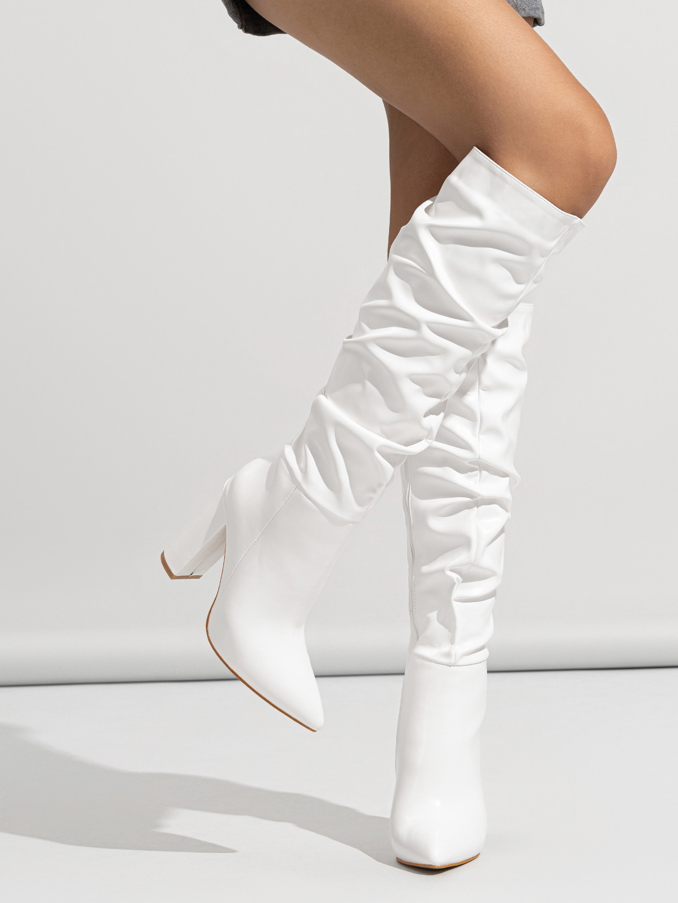 Трансграничная внешняя торговля, новый стиль, женские сапоги с острым носком на толстом каблуке, модные модные сапоги телесного цвета с острым носком и естественной морщинистой внутренней молнией