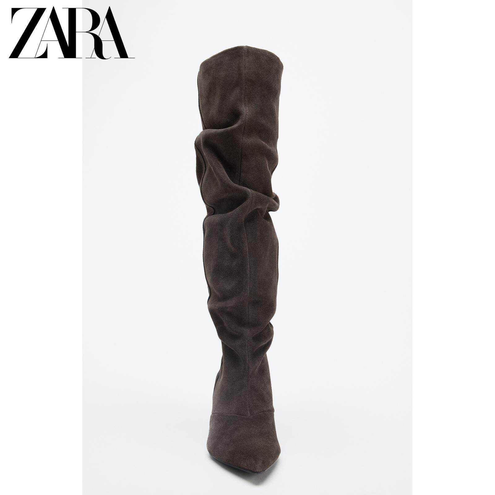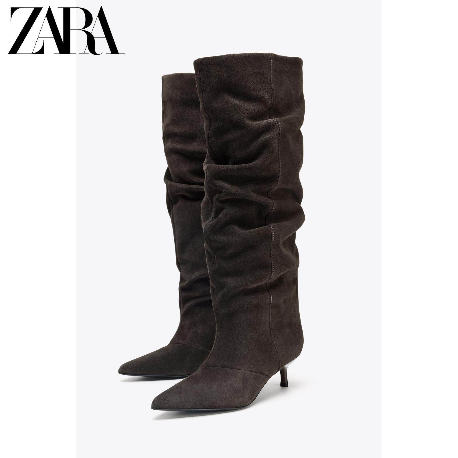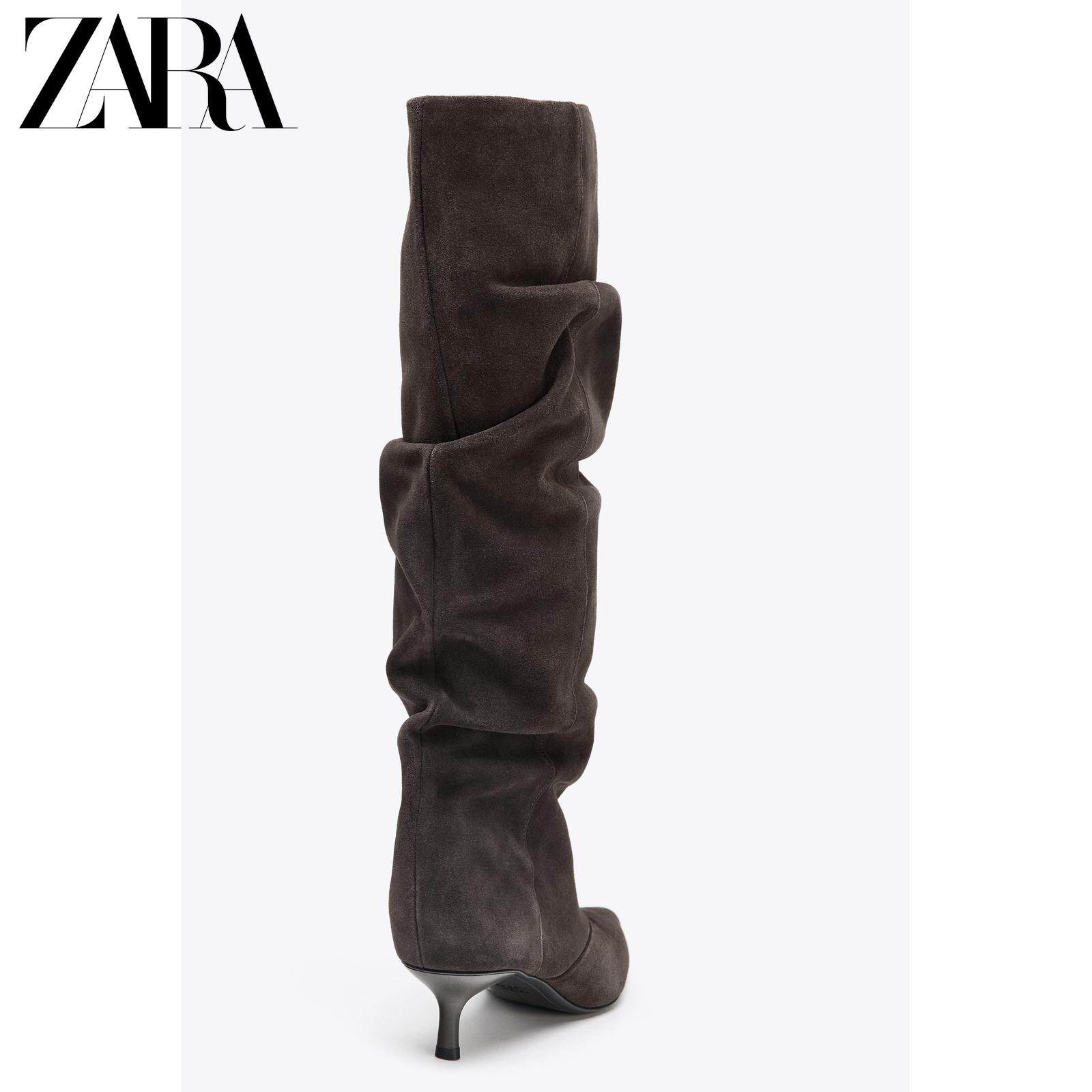 ZARA Осень 2025, новые товары, женская обувь, замшевые ботинки с острым носком, ботинки на кошачьем каблуке, плиссированные ботинки с ворсом, 3009610 700