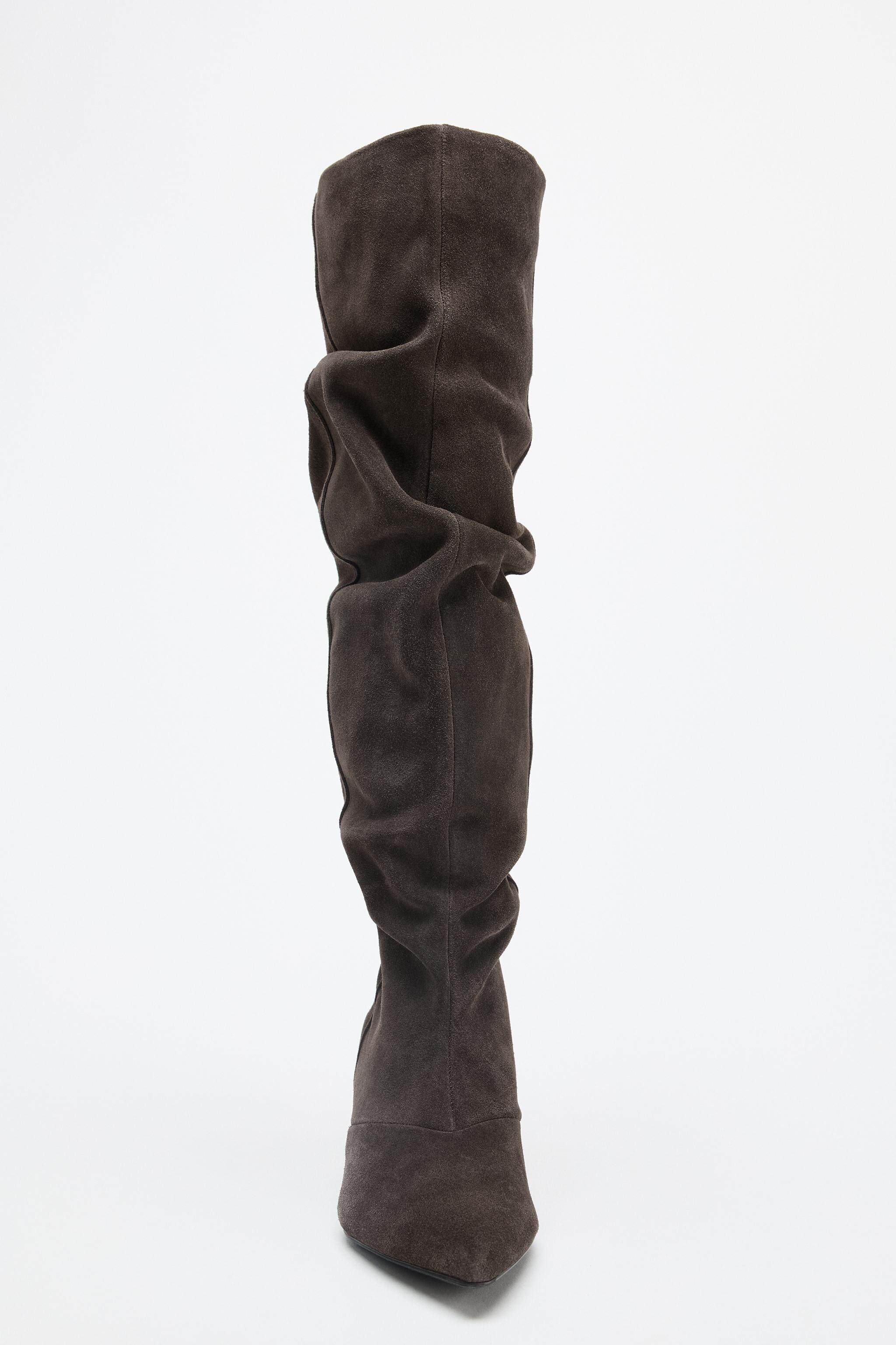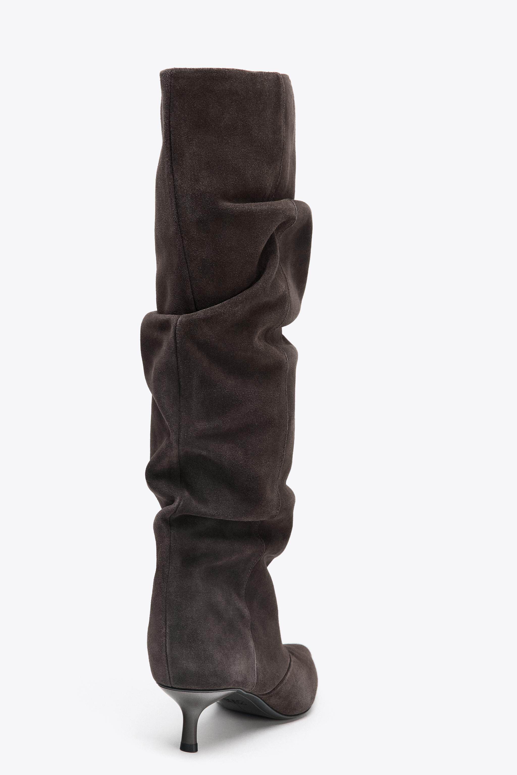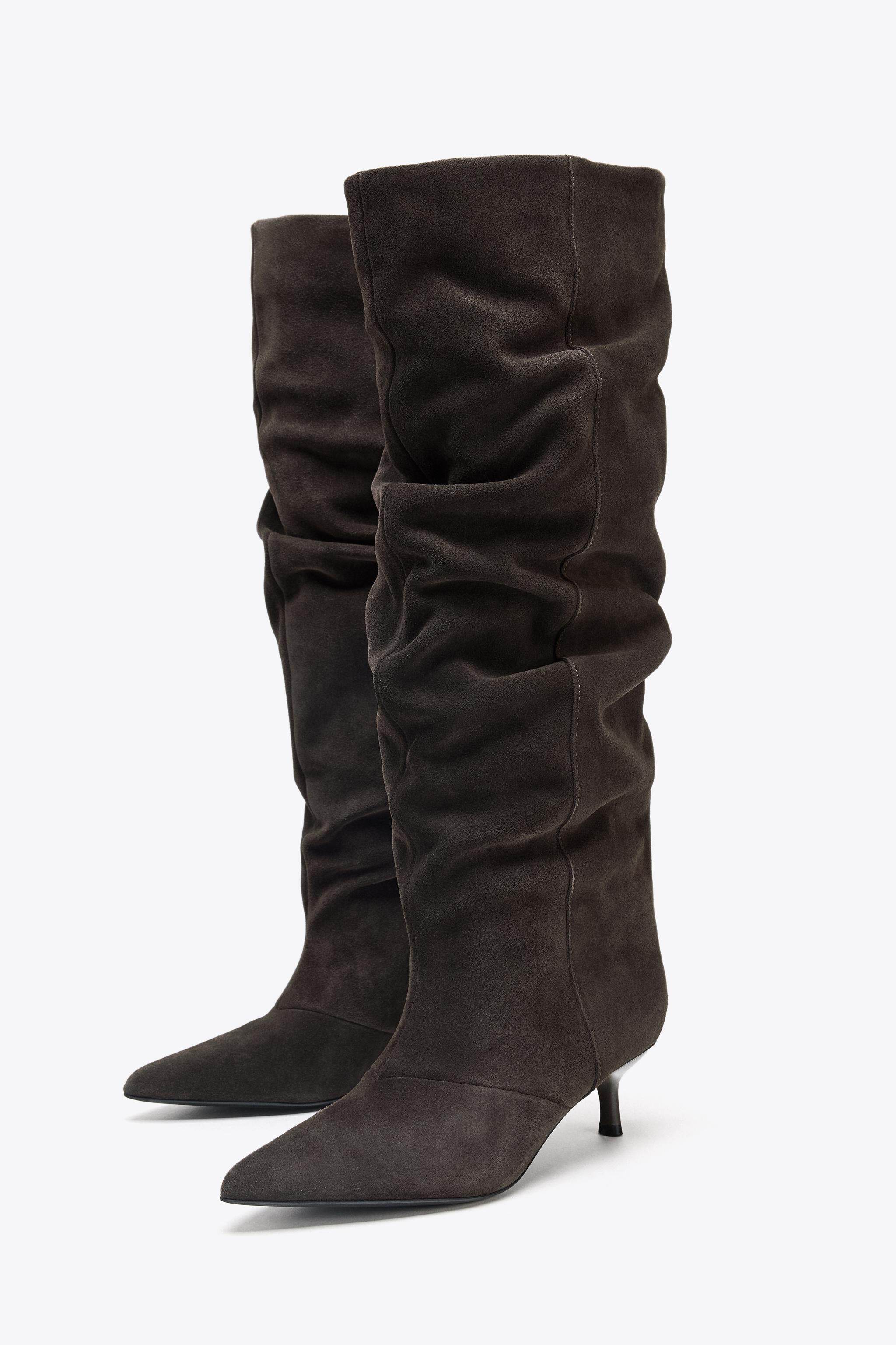 ZARA Осень 2025, новые товары, женская обувь, замшевые ботинки с острым носком, ботинки на кошачьем каблуке, плиссированные ботинки с ворсом, 3009610 700