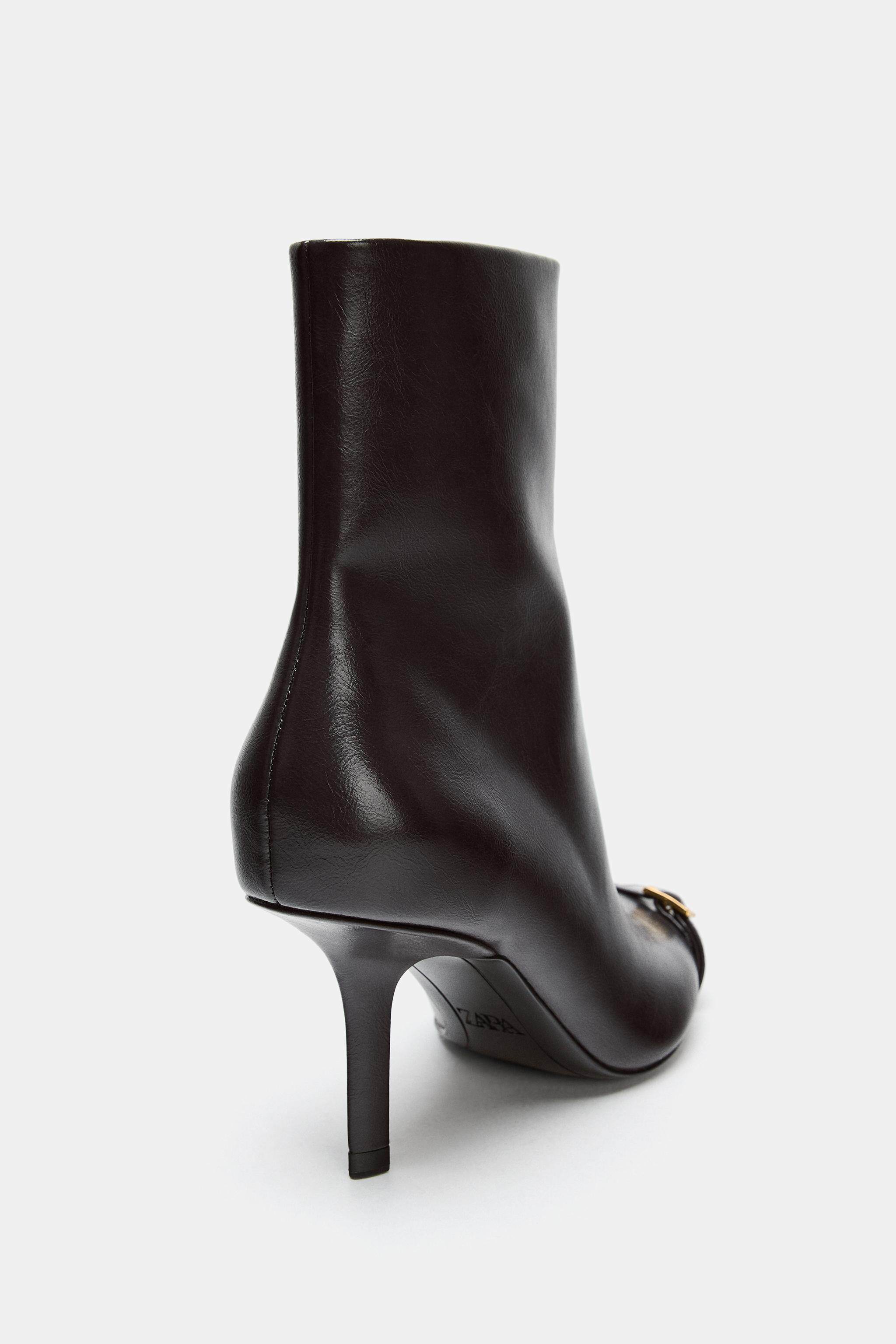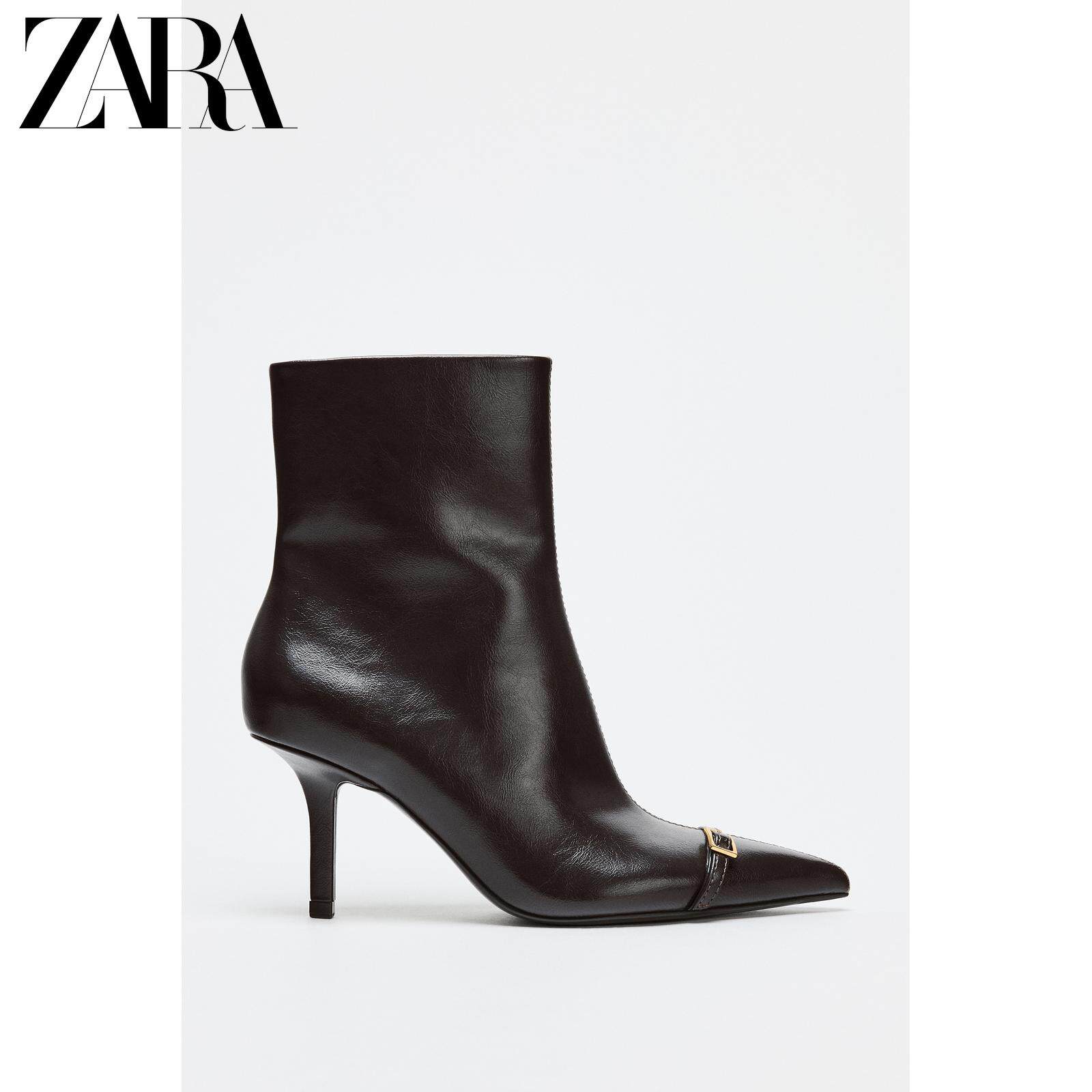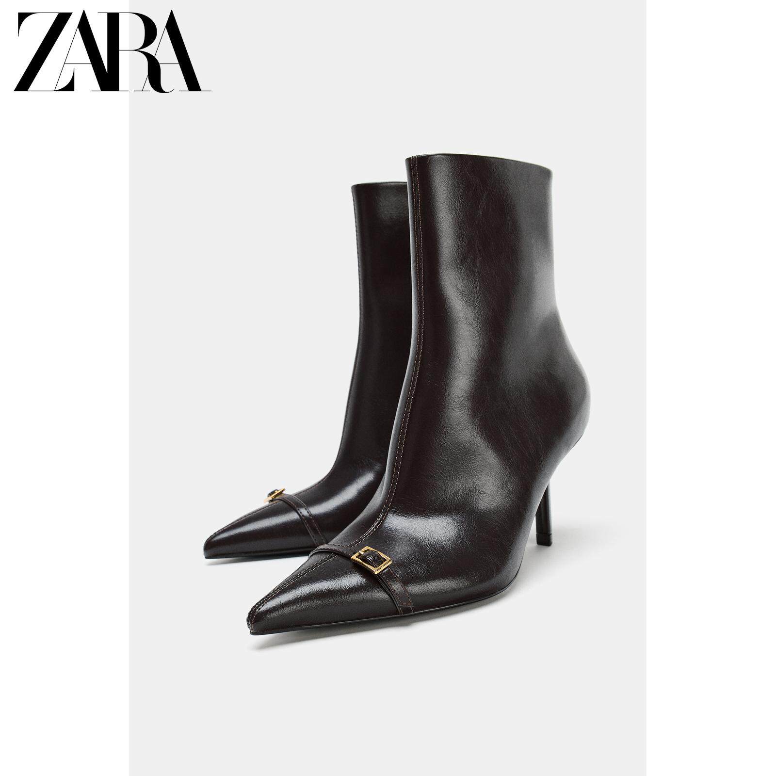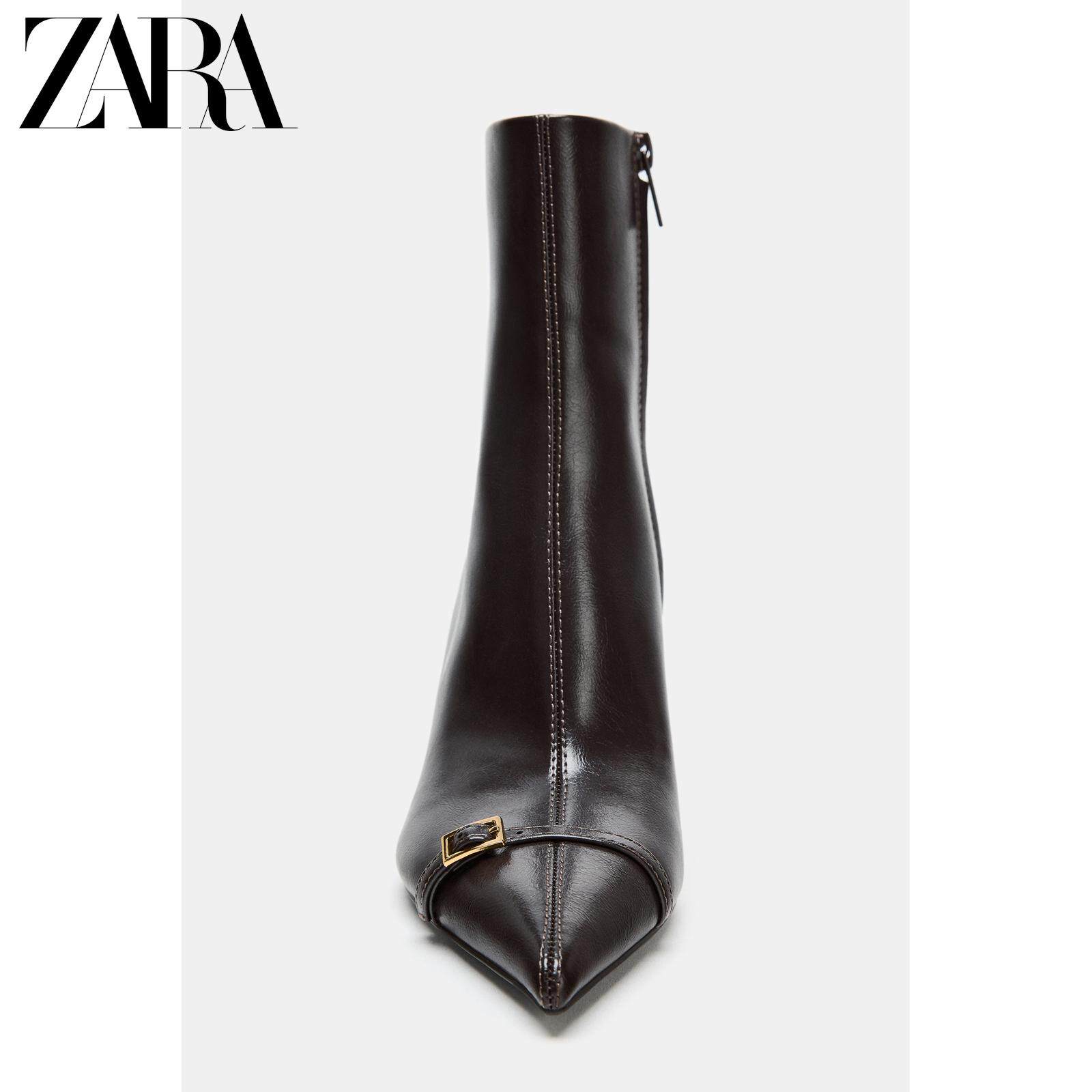 ZARA 2025 зимняя новинка, женская обувь, короткие ботинки с боковой молнией и пряжкой на шпильке с острым носком 3101710 700