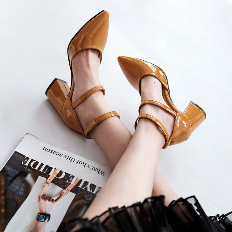 Ретро заостренная патентная кожа толстая пятка римская обувь Большой размер 43 44 45 46 Код Баоту тонкий, а средние каблуки сандалии 40-43