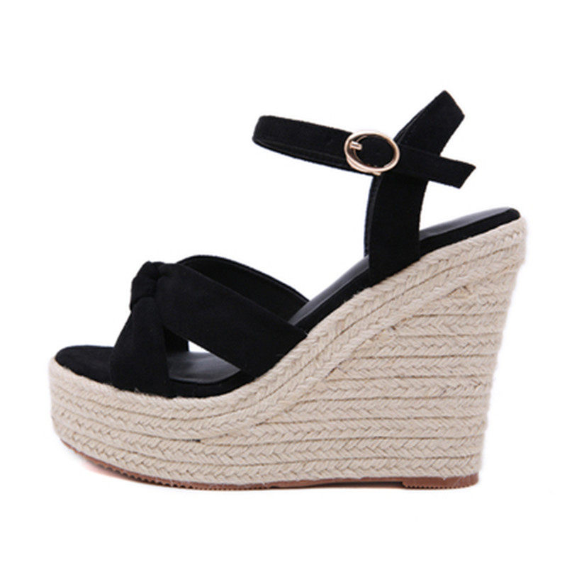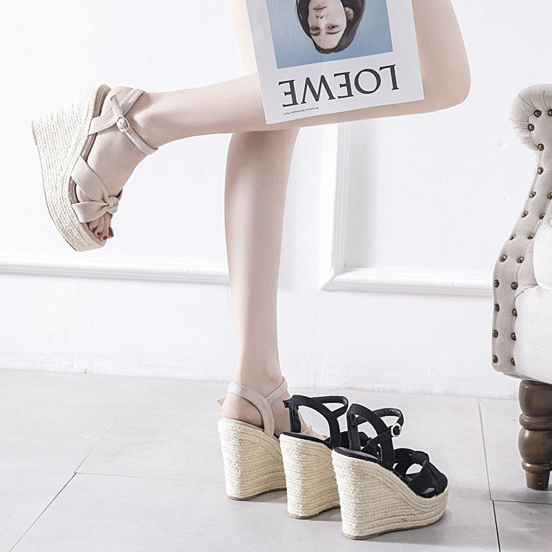 Водонепроницаемые женские туфли на очень высоком каблуке в корейском стиле на танкетке 12 см, на платформе и платформе, с толстой подошвой и полой льняной тканью, сандалии с одной линией и пряжкой