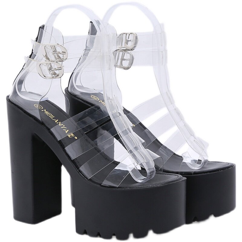 Женские босоножки на прозрачном высоком каблуке 16 см, новая летняя сексуальная верхняя одежда, крутые модные туфли на очень высоком каблуке с толстым каблуком и кристаллами