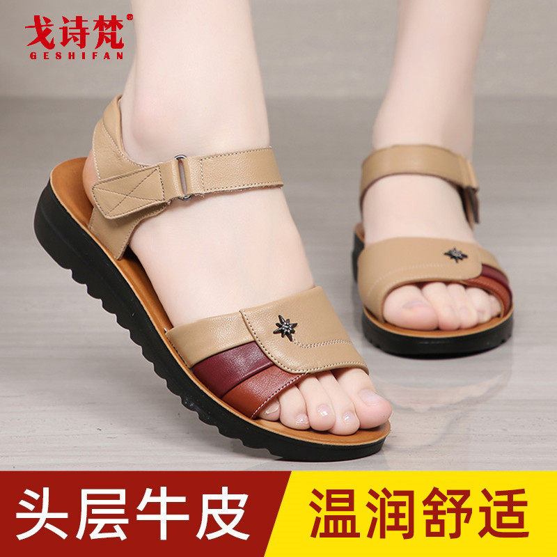 Летние нескользящие комфортные сандалии для матери, из натуральной кожи, мягкая подошва, для среднего возраста, большой размер