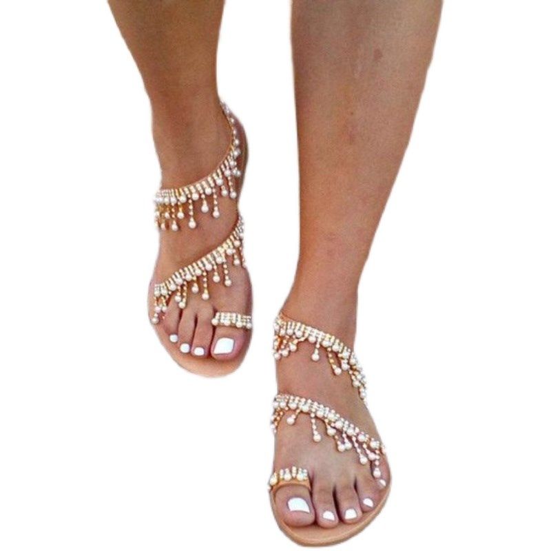 Женские сандалии большого размера летние туфли плоские тапочки жемчужные сандалии