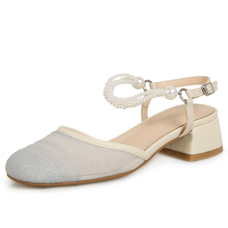 非侈 Оригинальные женские гигантские мягкие дышащие сандалии с сетчатым носком, лето 2025, новый стиль, туфли на толстом среднем каблуке с жемчугом
