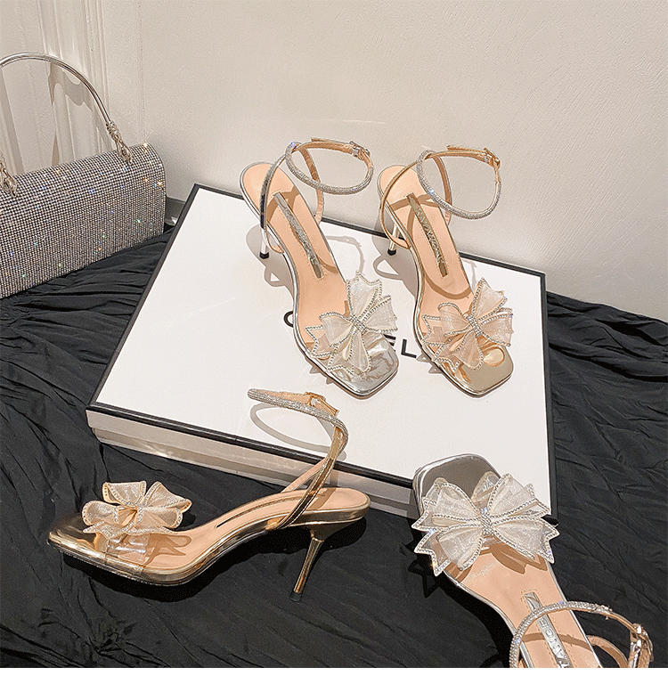 Высокие сандалии, летняя серебряная обувь с бантиком на высоком каблуке, коллекция 2022
