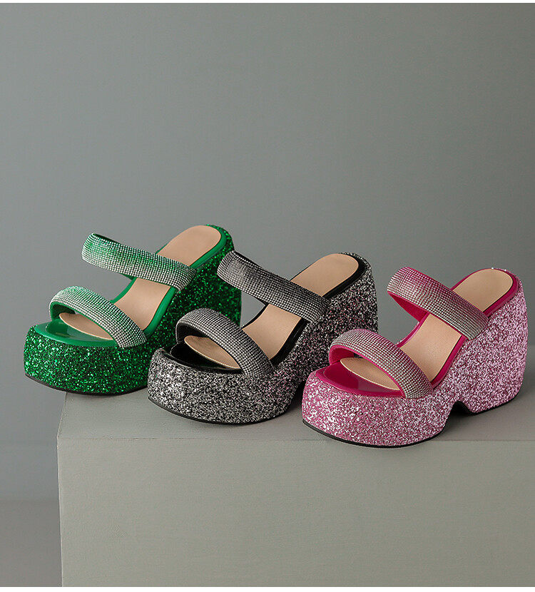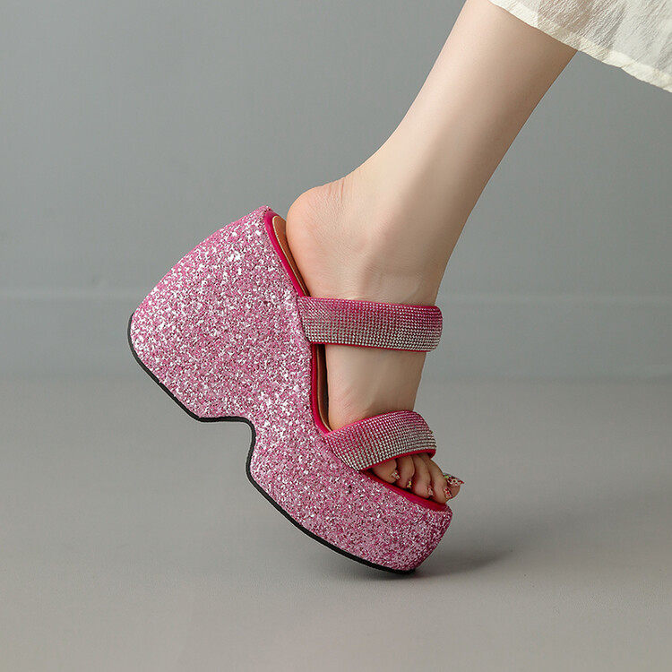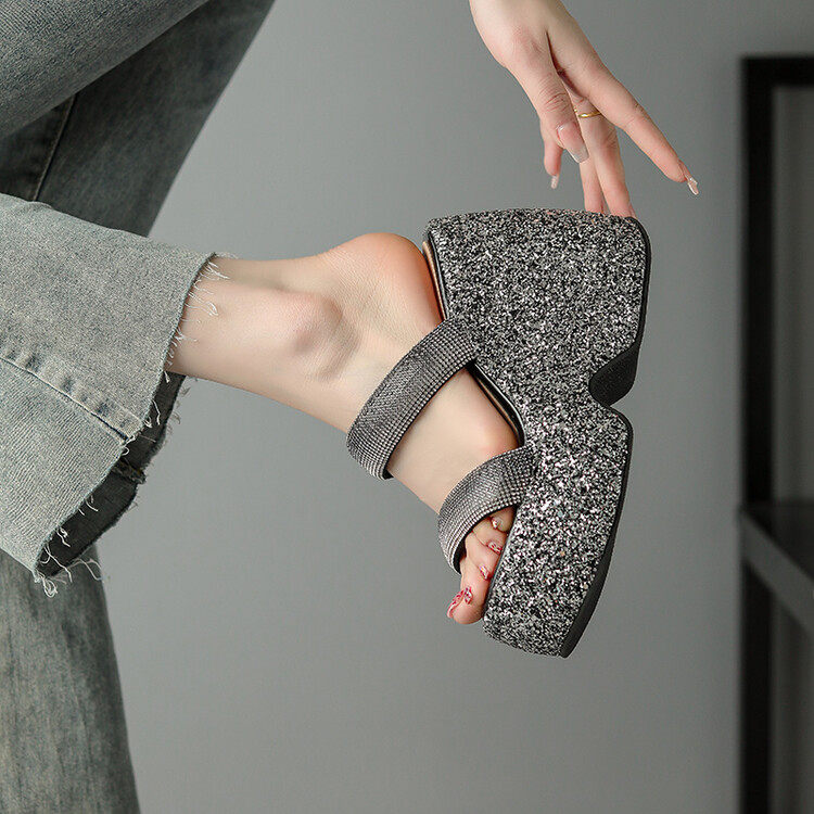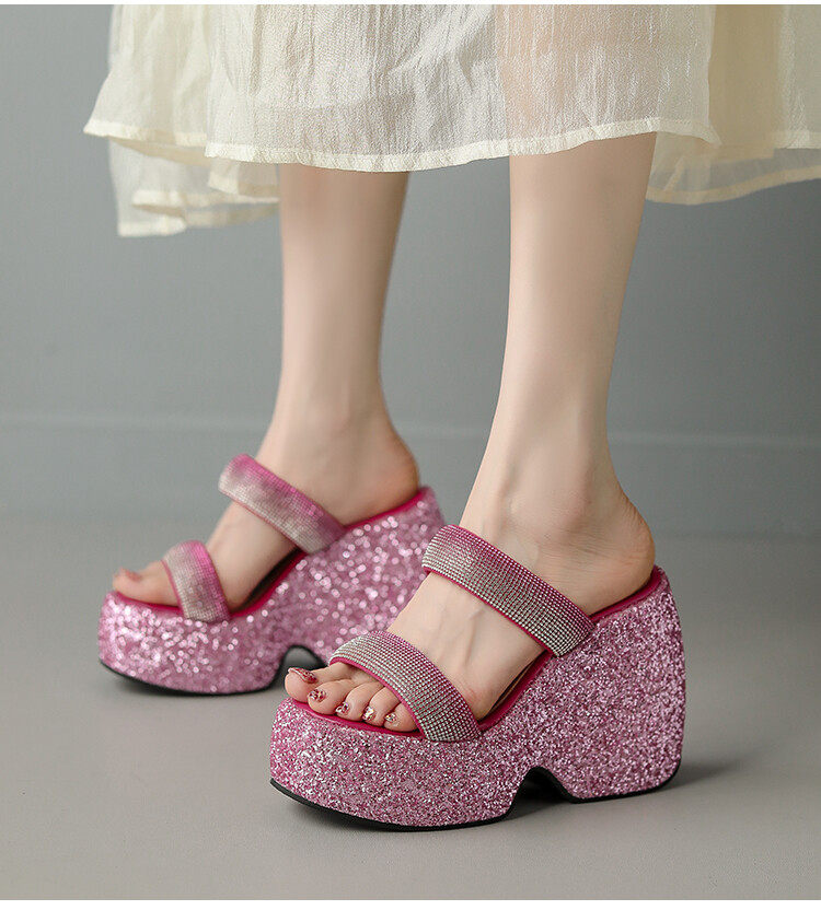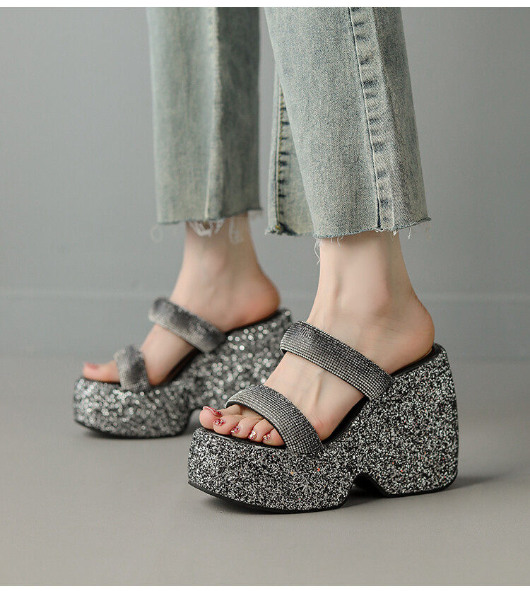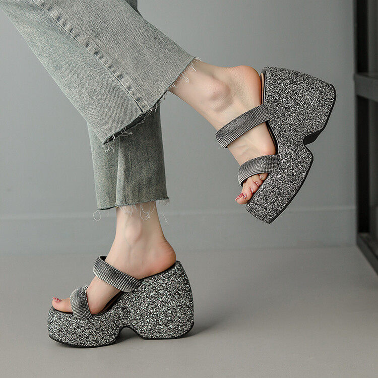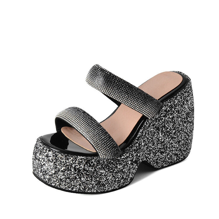 Женские шлепанцы на танкетке 10 см, летние сексуальные водонепроницаемые босоножки на платформе со стразами и бисквитом, с квадратной головкой и рыбьим ртом, для верхней одежды, на высоких каблуках на толстой подошве