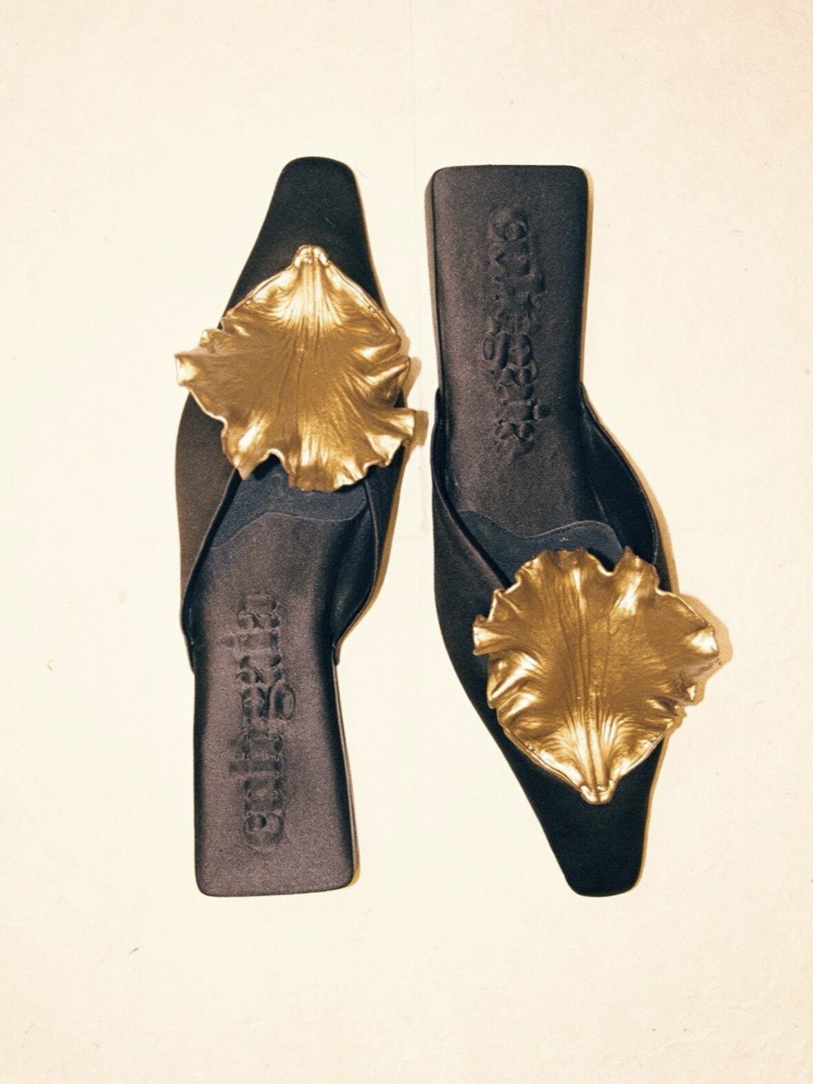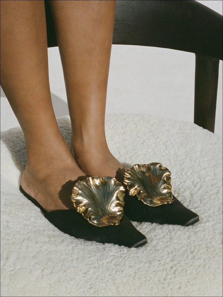 Элегантные тапочки Muller~Cult Gaia 25, весенне-летние тапочки в стиле ретро с золотистой текстурой, украшенные листьями и носком.