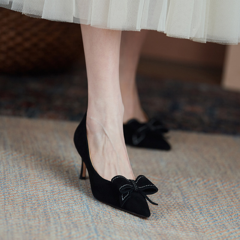 Обувь с бантиком с низким вырезом, матовые черные универсальные напяточники на высоком каблуке, в корейском стиле, из натуральной кожи