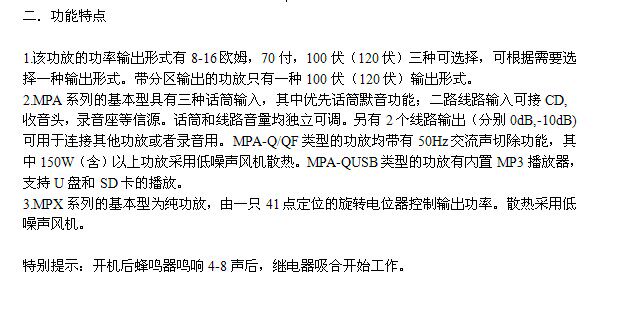 MPA100Q | 100 Вт с усилителем передней трансляции | Трехедний вход микрофона, приоритетный микрофон с молчаливой функцией; вход второго маршрута может быть подключен к CD и регистрационному сиденью.Микрофон и объем линии являются независимыми и регулируемыми, а генератор сигналов тревоги.Выход составляет 100 В (120 В), 70 В, 8-16 евро, три типа интерфейсов выходной мощности с фиксированным напряжением, номинальная выходная мощность составляет 100 Вт, а другой выходной выход используется для записи или расширенного усилителя.Том: 480×323×88 | Тайвань | |