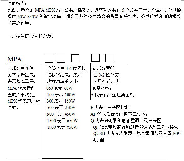 MPA300 | 150 Вт вещательная сила | Трехедний вход микрофона, приоритетный микрофон с молчаливой функцией; вход второго маршрута может быть подключен к CD и регистрационному сиденью.Микрофон и объем линии являются независимыми и регулируемыми, а генератор сигналов тревоги.Выход составляет 100 В (120 В), 70 В, 8-16 евро, три типа интерфейсов выходной мощности с фиксированным напряжением, номинальная выходная мощность составляет 100 Вт, а другой выходной выход используется для записи или расширенного усилителя.Том: 480×323×88 | Тайвань | |