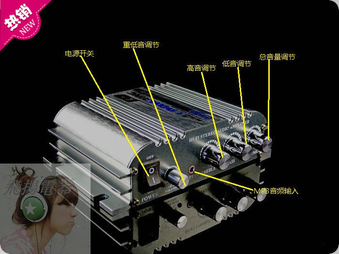 Передняя панель имеет мощный свет и музыкальная вспышка, а три ручки управляют басом, высокими и основными голосами, соответственно, соответственноМеталлическая ручка слева будет контролировать объем басового пистолета,Принесите входной гнездо MP3.Ввод аудио ввод 2 лотоса в задней пластине,Зеленая заглушка соединительные басовые пистолеты, 4 проволочных сжимания влево и правым каналам.Вес заполнен, форма прекрасна, а двойной IC управляет левыми и правыми каналами и выходом баса соответственно, а мощность сильнее.СущностьСущность