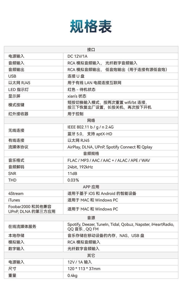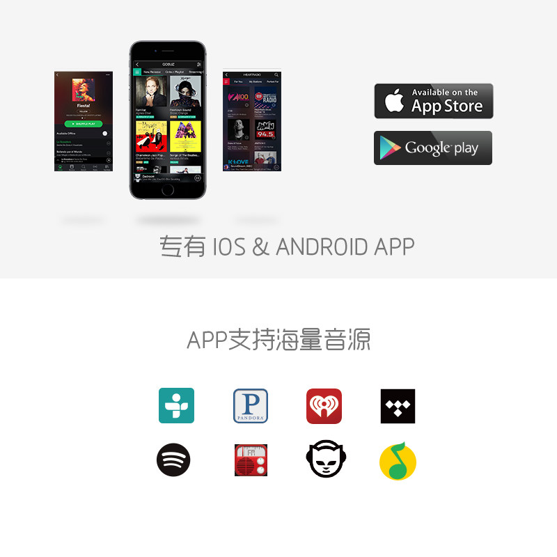 10 метровDLNA AirPlay ", Spotify и QPlay ConnectionПриложение управления4 на основе интеллектуальных устройств iOS и Android