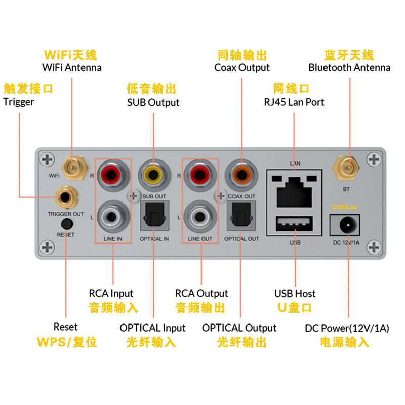 Короткий нажатие Wi -Fi, долго нажмите, чтобы восстановить настройки заводов(THD + N: