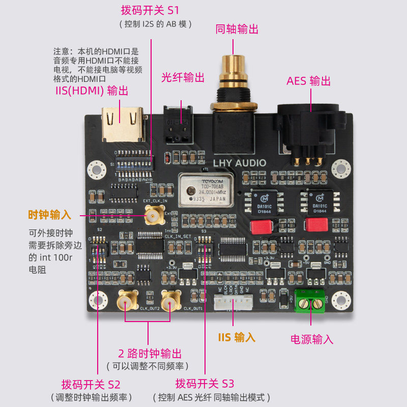 - Сигнал IIS управляется чипом LVDS и выводит его в интерфейс HDMI-IIS (режим A/B может быть установлен через 10-значный переключатель циферблата), который может быть совместим с декодером большинства текущих HDMI- IIS входной интерфейс.(Формат данных интерфейса CDPRO2 IIS, большая часть текущего декодера не может быть декодирована напрямую)